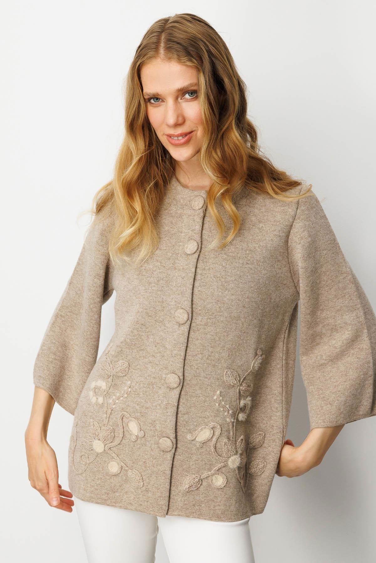 Desen Triko Kadın Dik Yaka Çiçek Desenli Kısa Yün Ceket 25015 K. Bej
