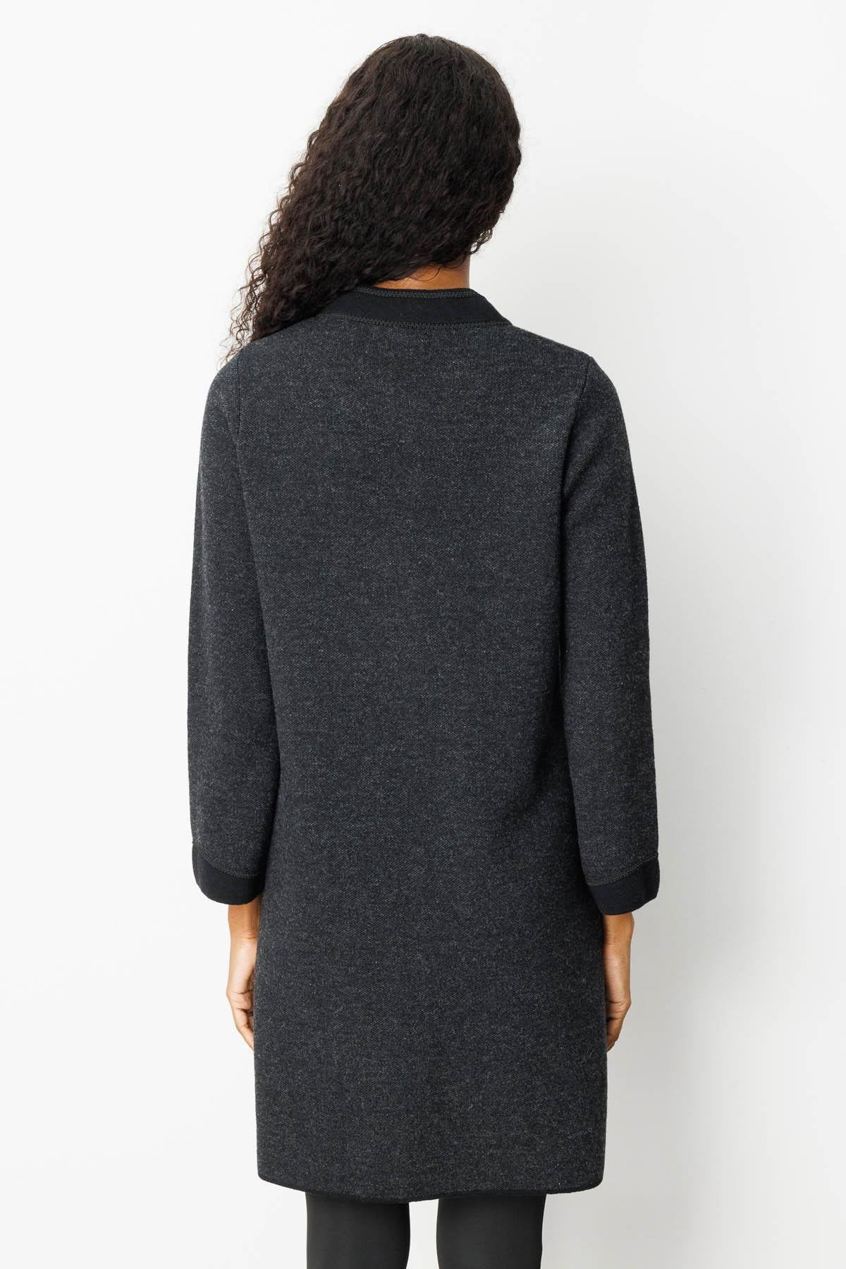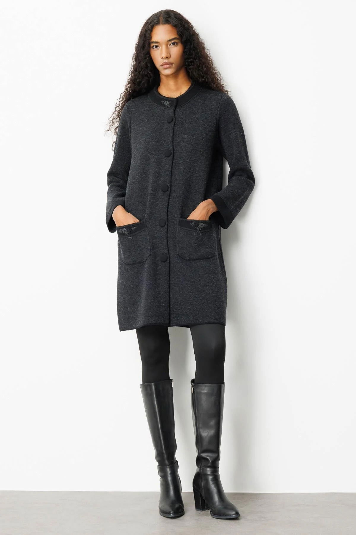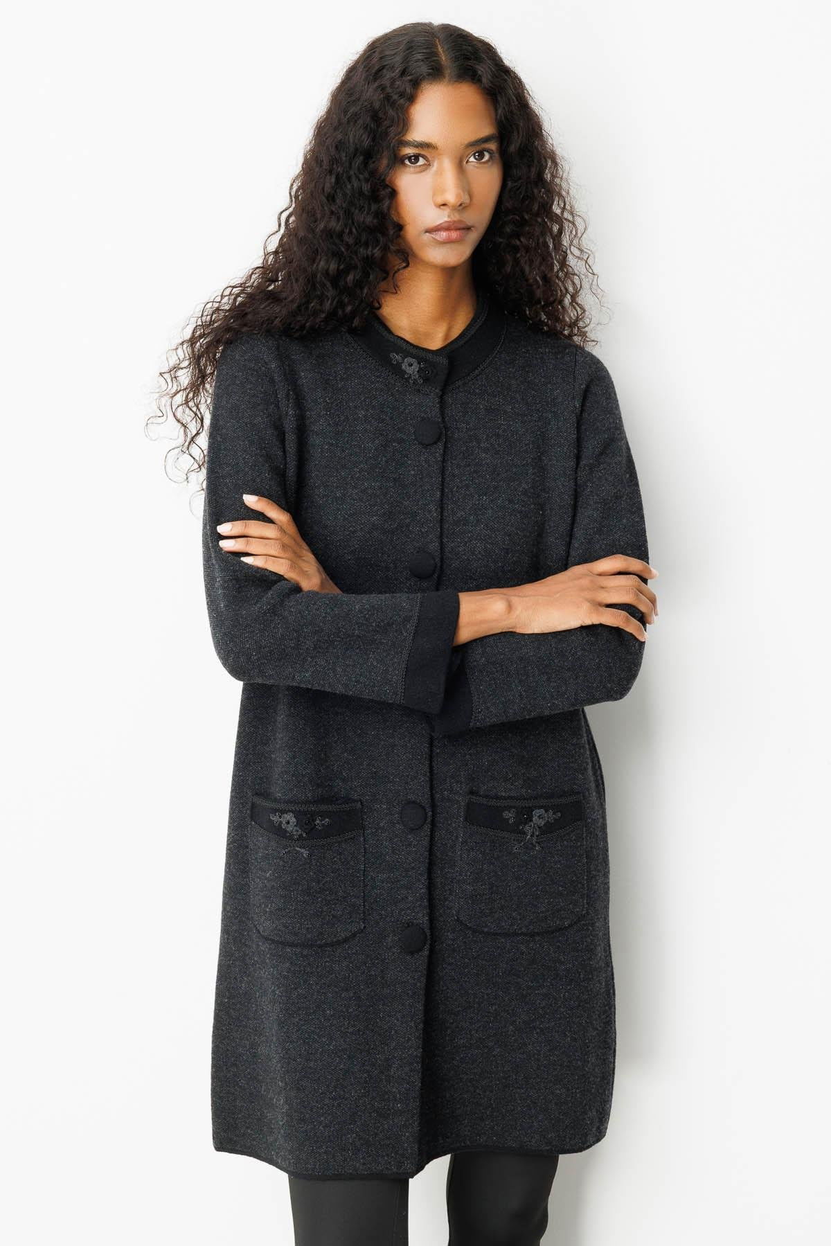 Desen Triko Kadın Dik Yaka Kolu ve Cebi Nakış İşlemeli Uzun Yün Kaban 25034 Siyah