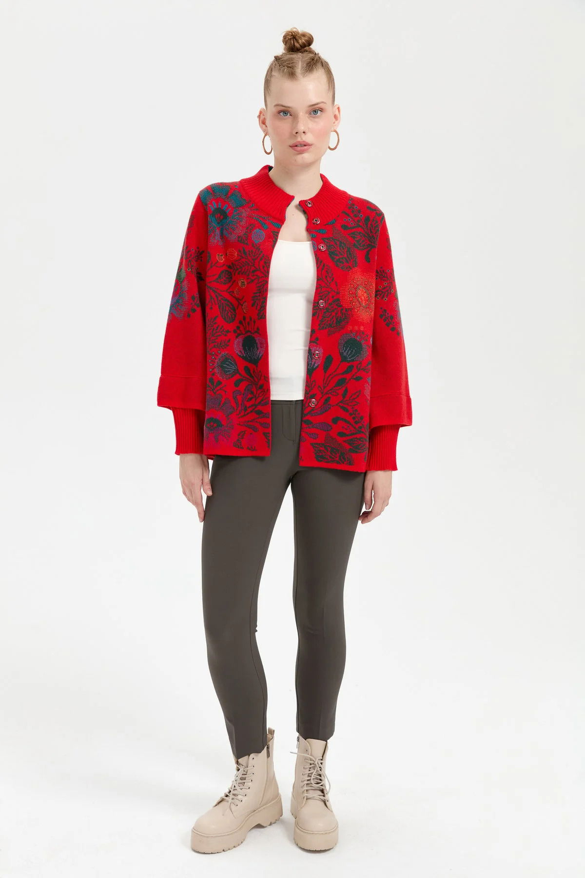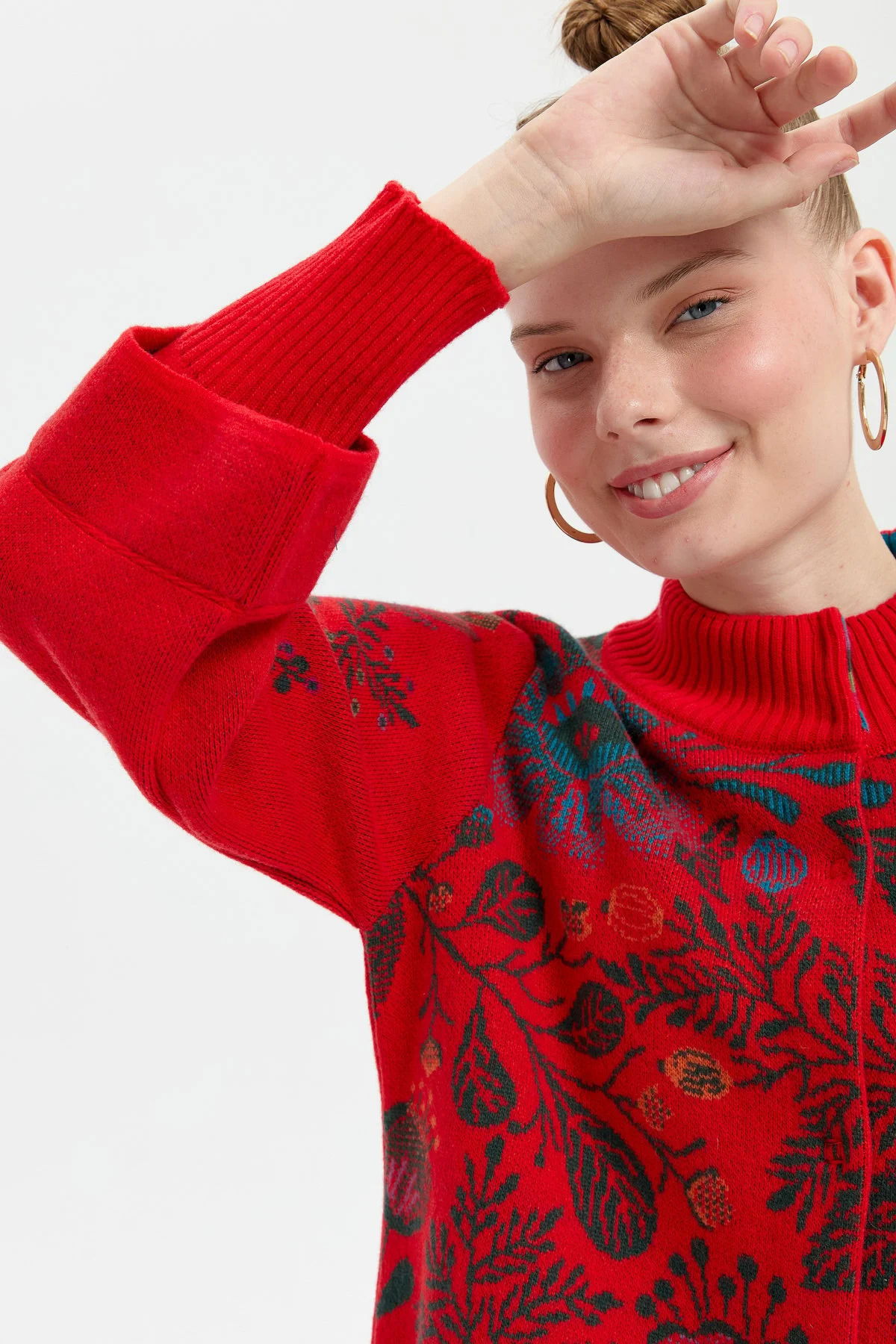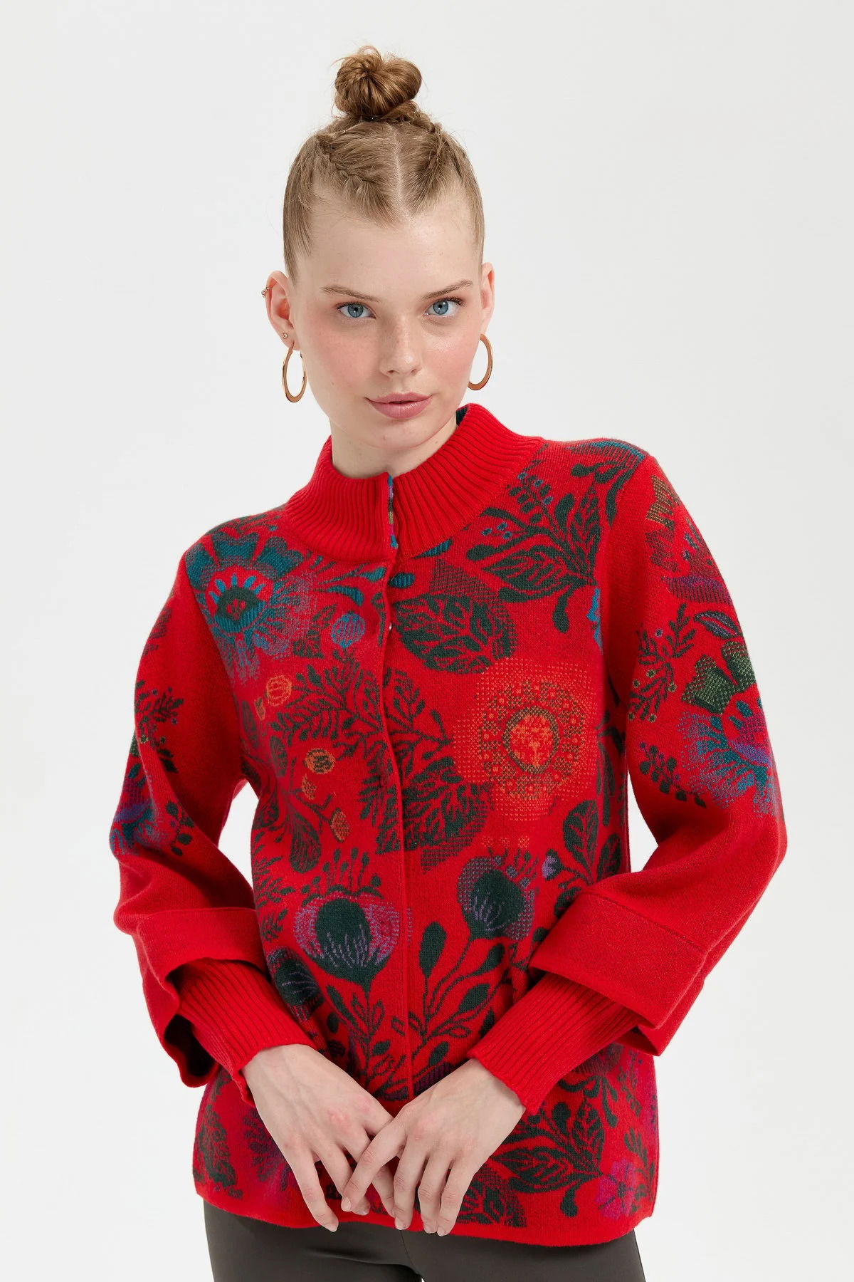 Desen Triko Kadın Dik Yaka Önü Renkli Çiçekli Kısa Yün Ceket 24050 Mercan