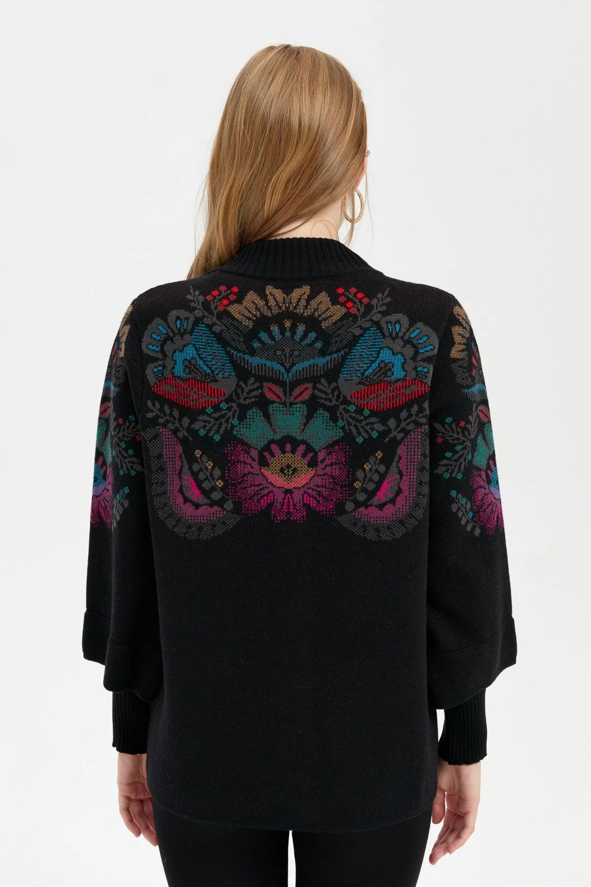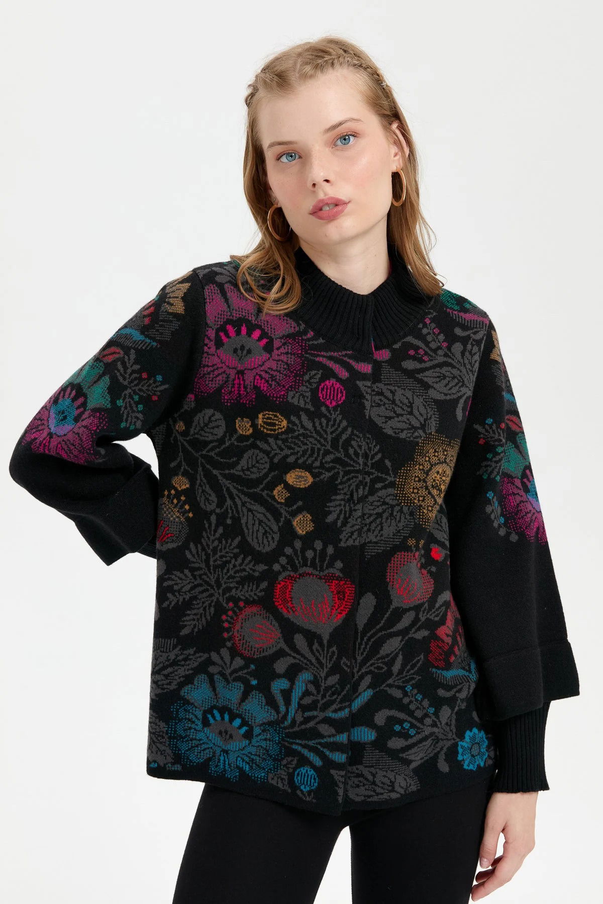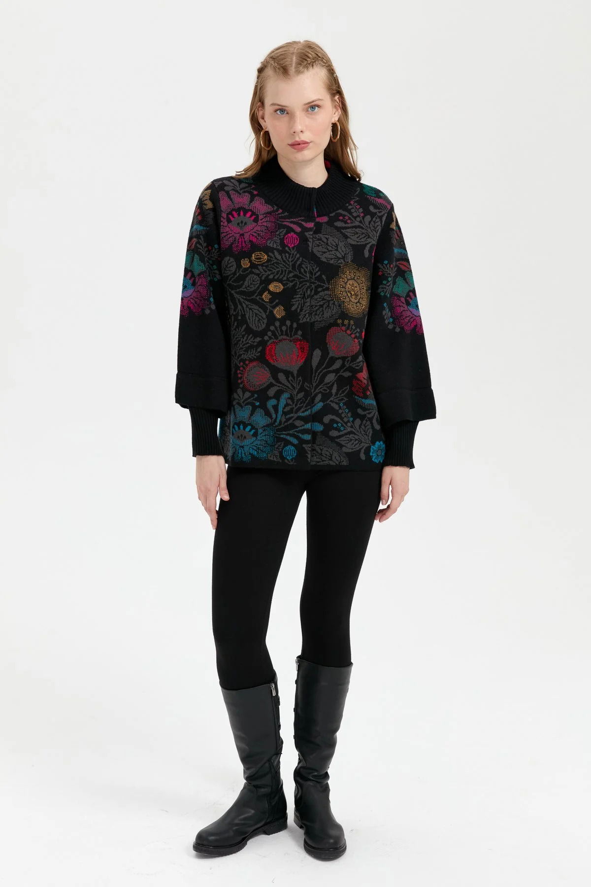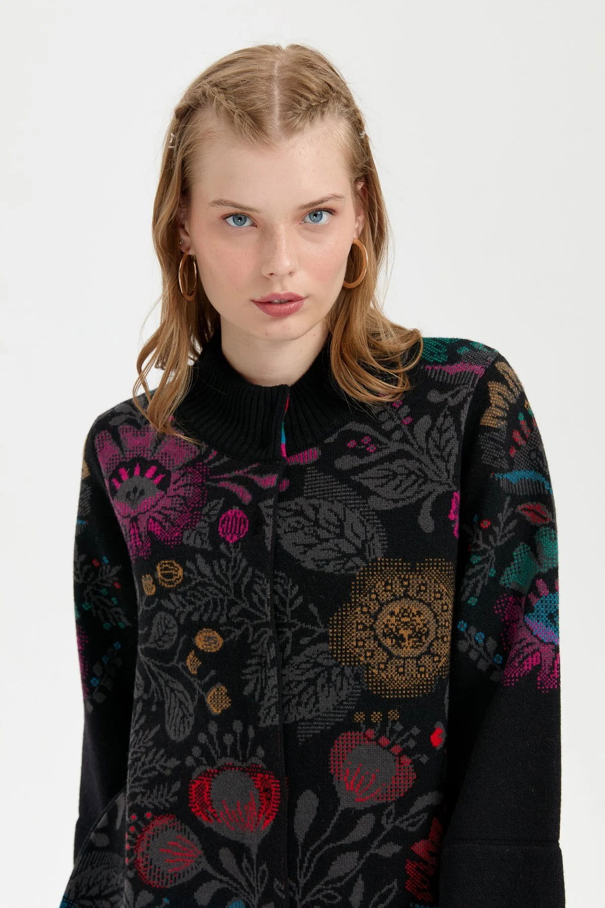 Desen Triko Kadın Dik Yaka Önü Renkli Çiçekli Kısa Yün Ceket 24050 Siyah