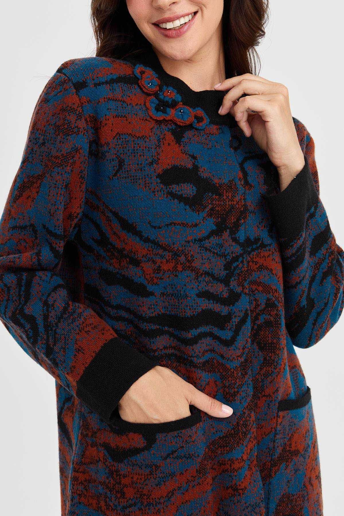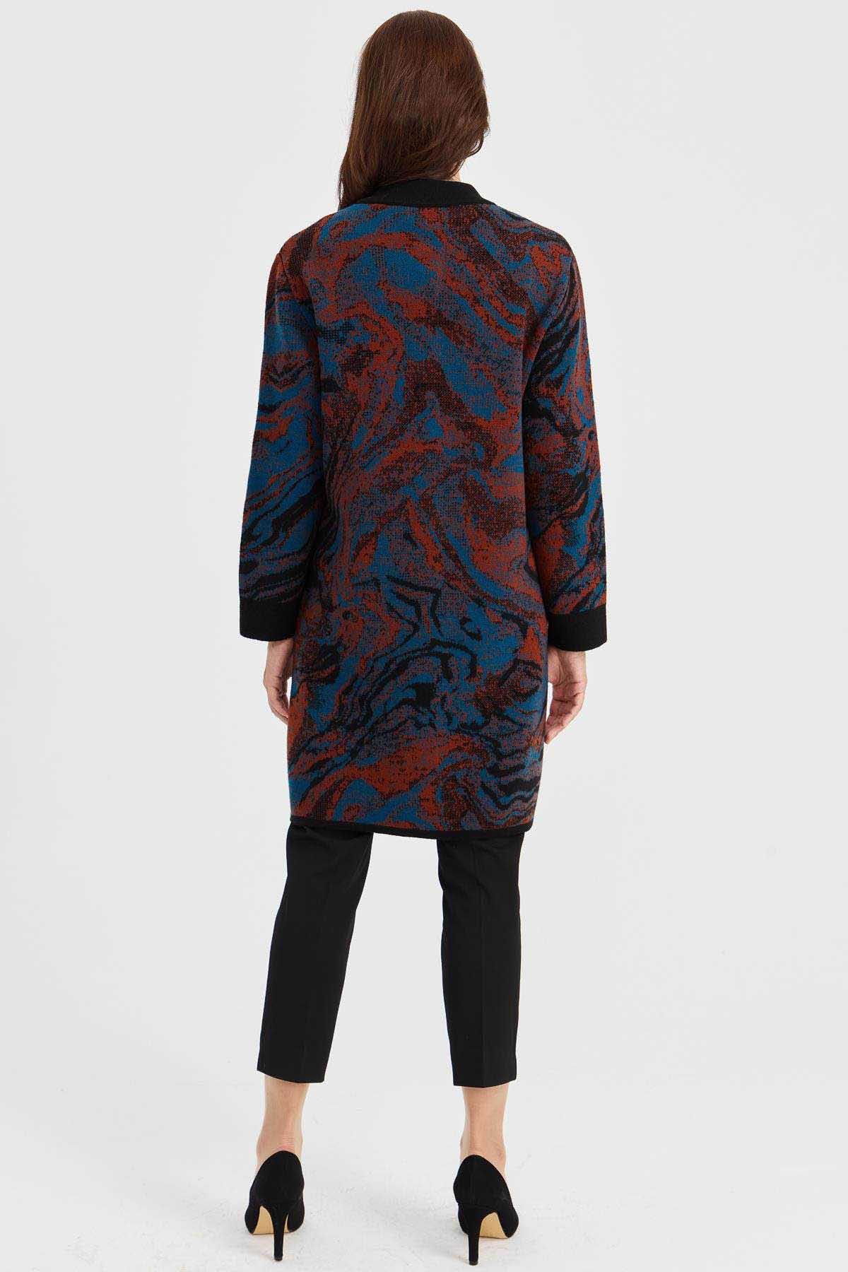 Desen Triko Kadın Dik Yaka Renkli Dalga Desenli Uzun Yün Kaban 23126 Siyah
