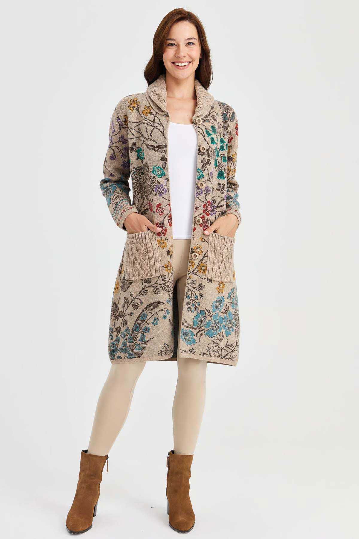 Detay: Dik yaka, uzun kollu, desenli kaban;