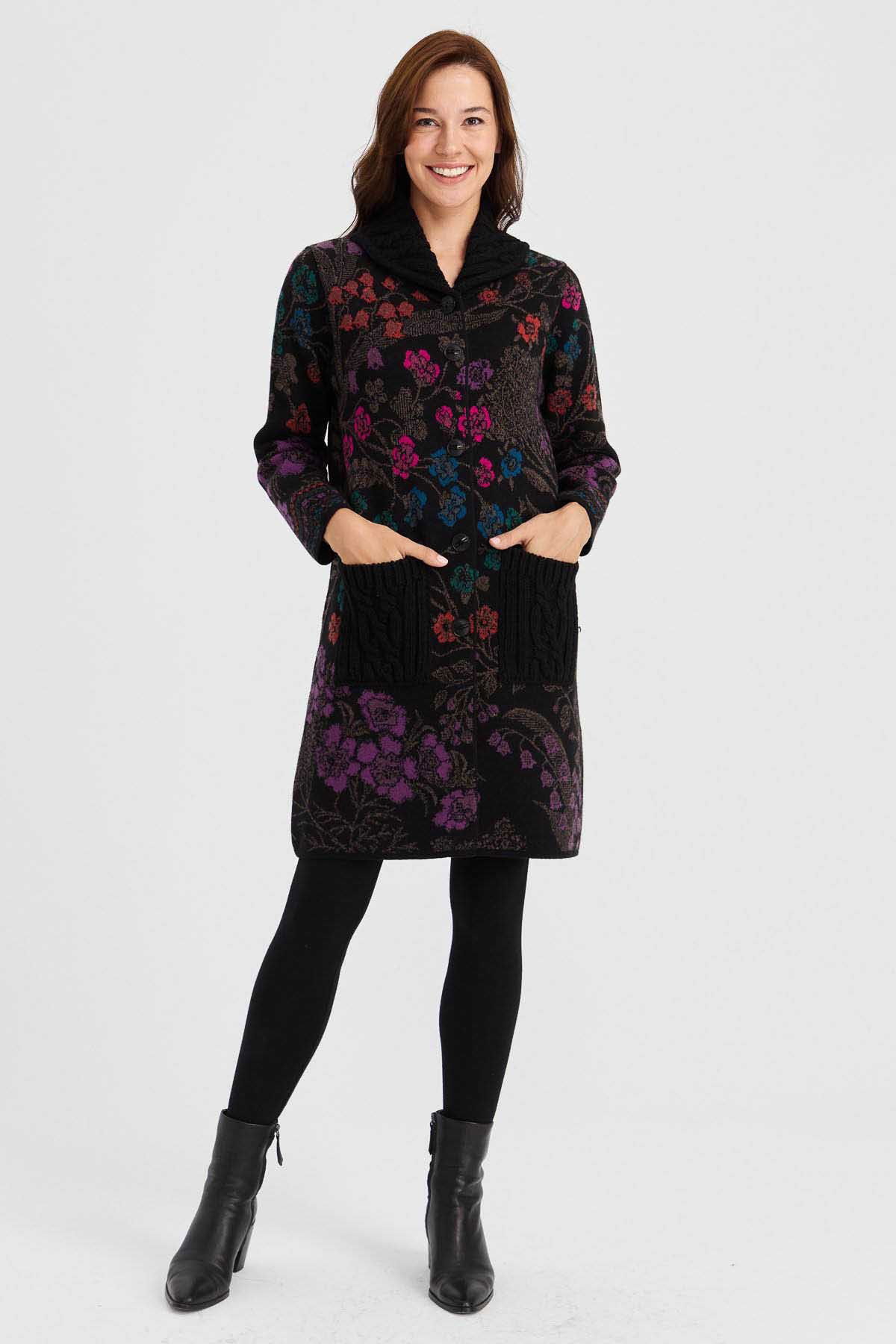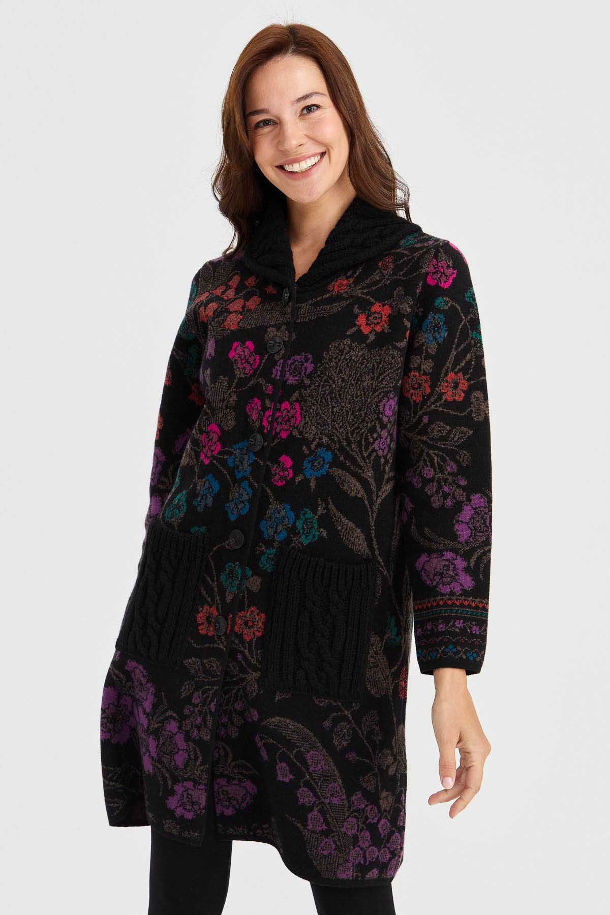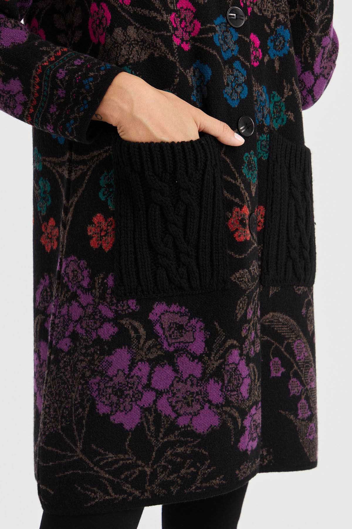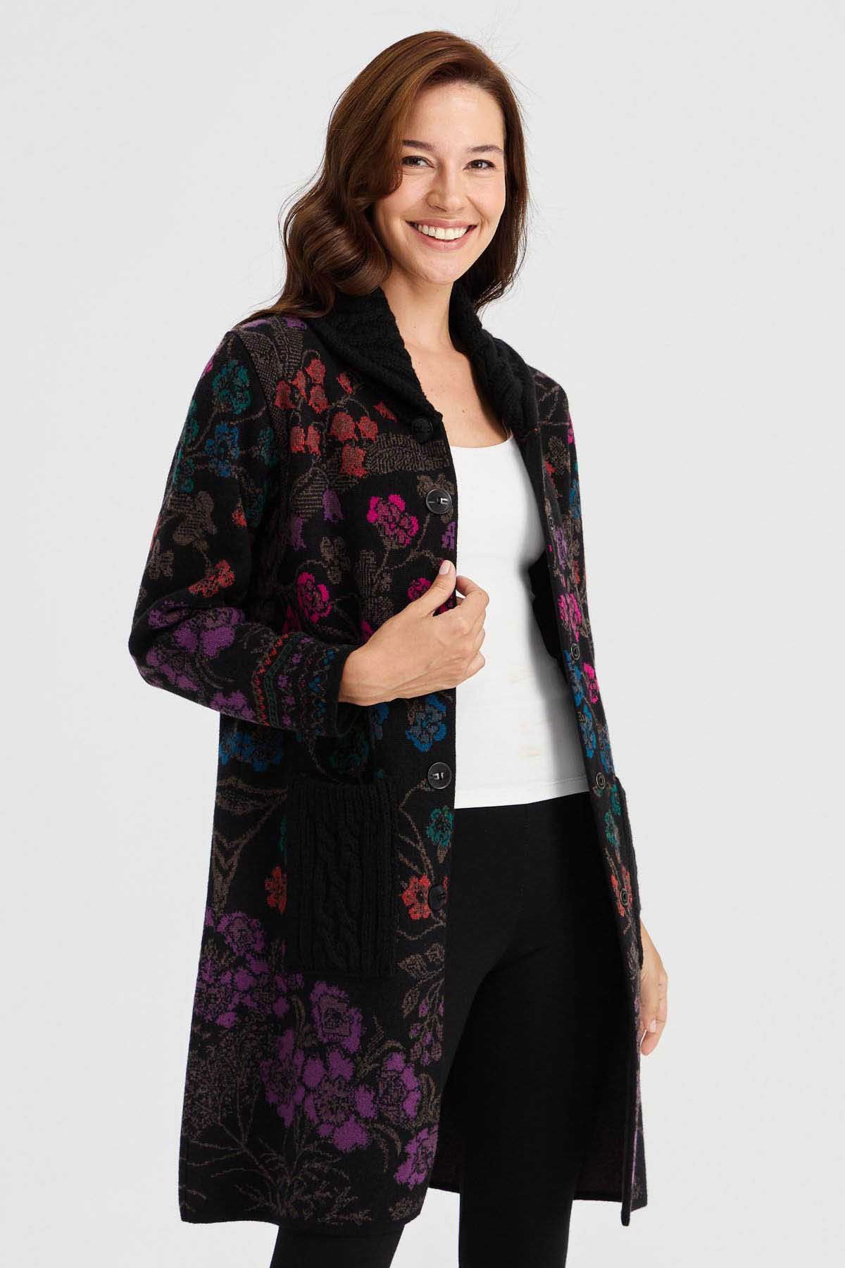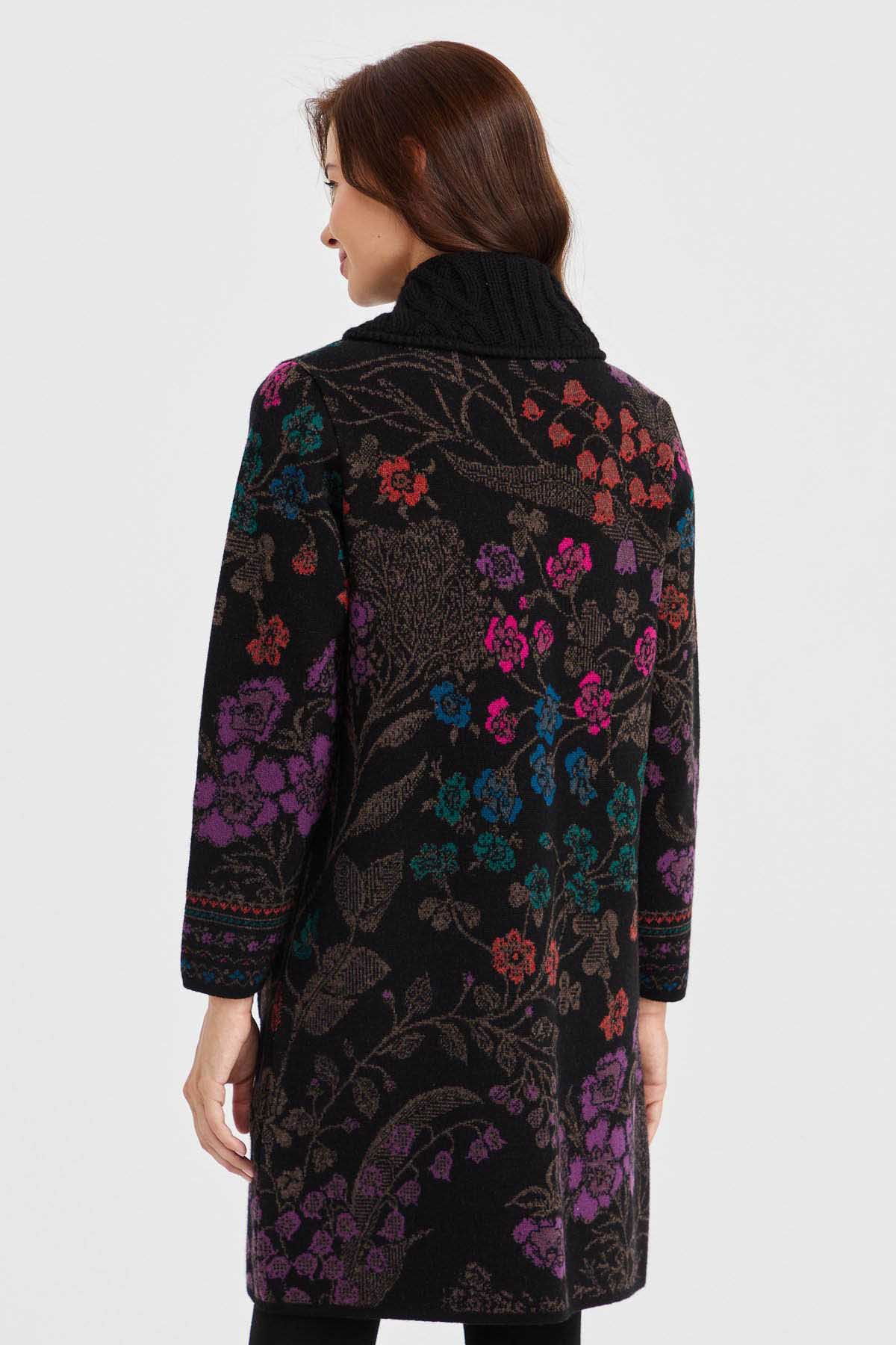 Desen Triko Kadın Dik Yaka Sarmaşık Çiçekli Uzun Yün Kaban 30189 Siyah
