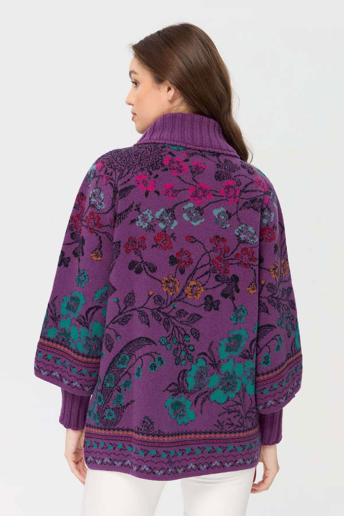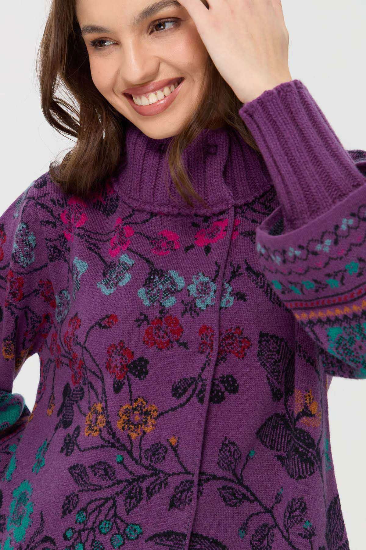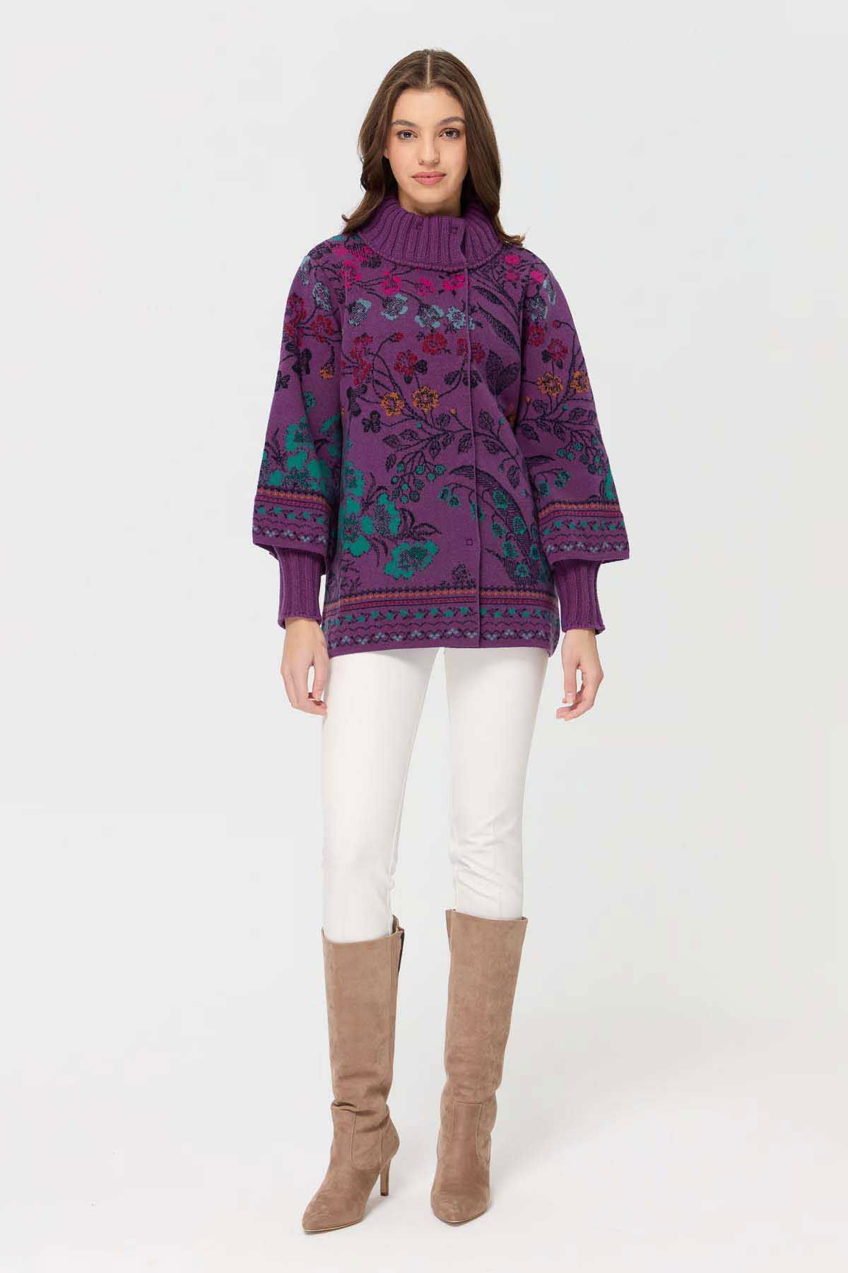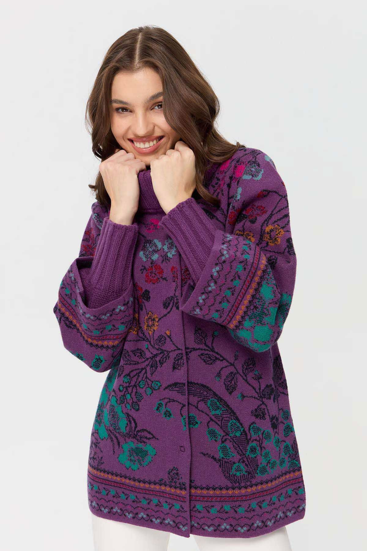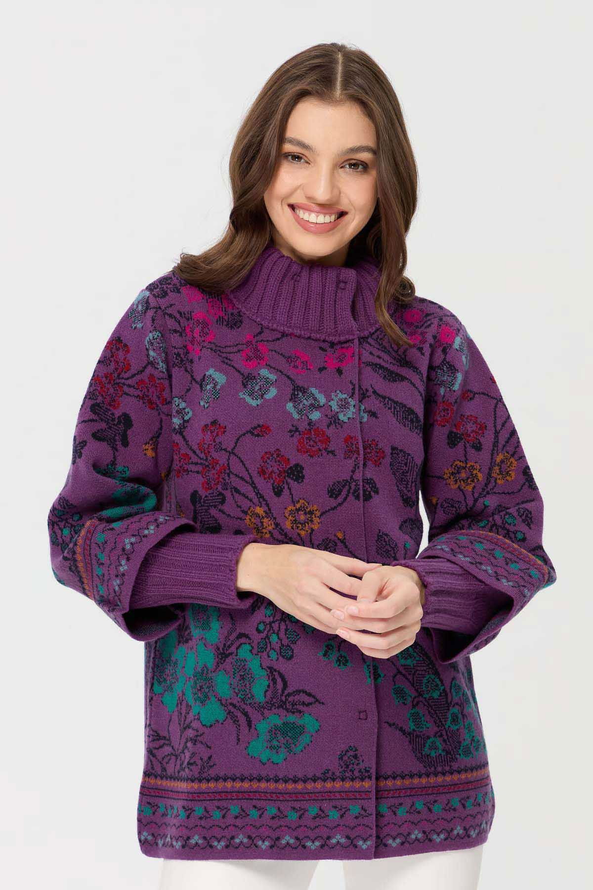 Desen Triko Kadın Dik Yaka Sarmaşık Çiçekli Yün Ceket 23017 A.Mor