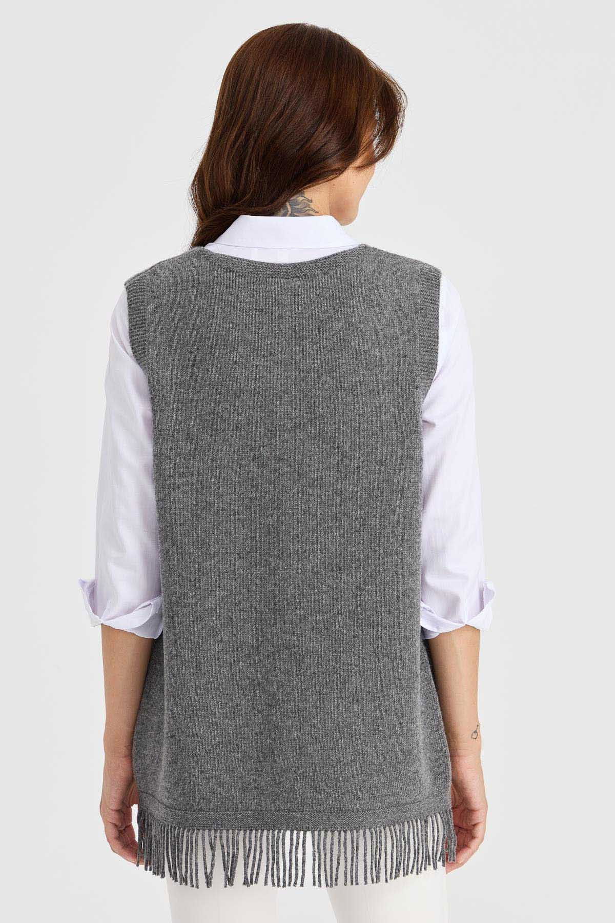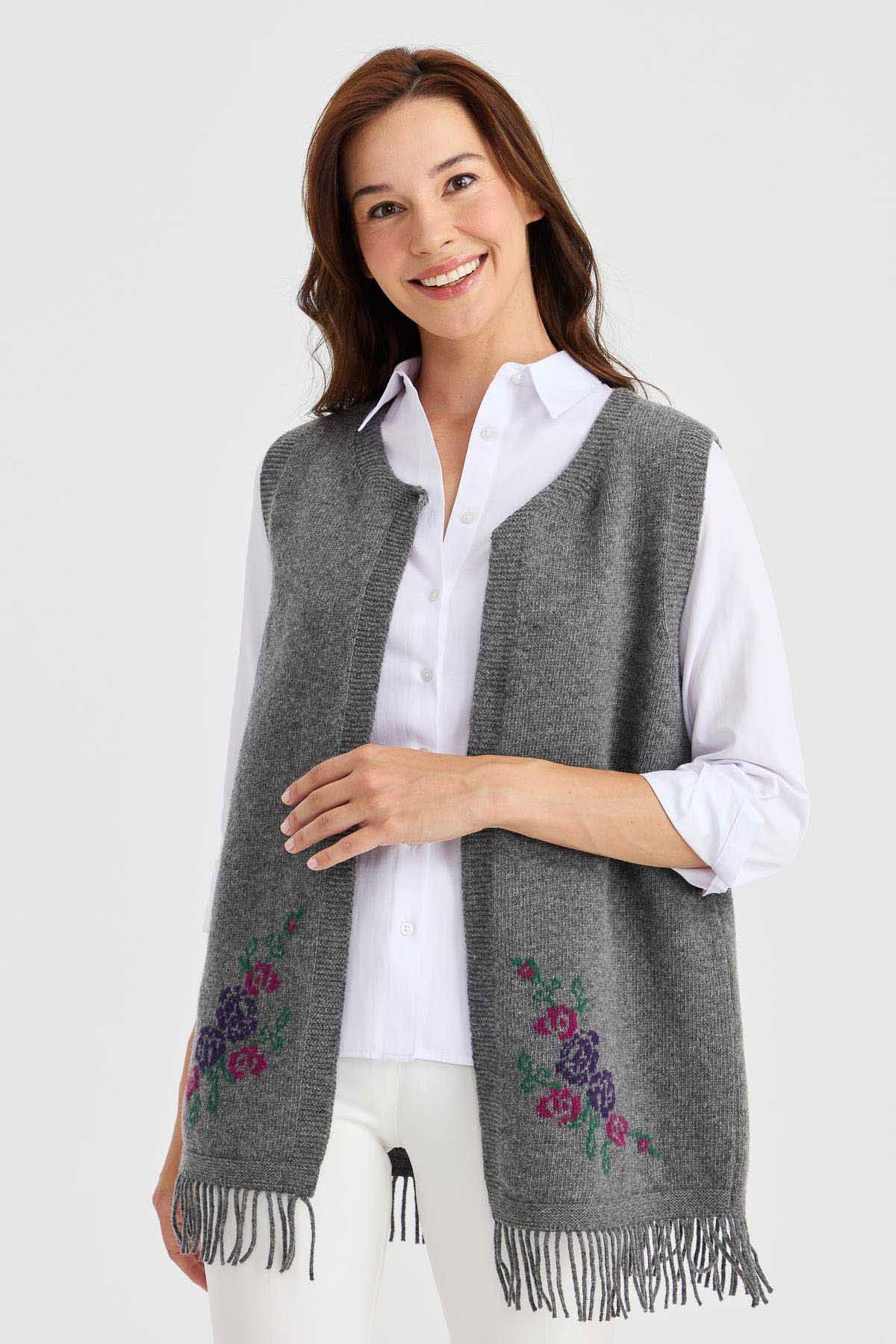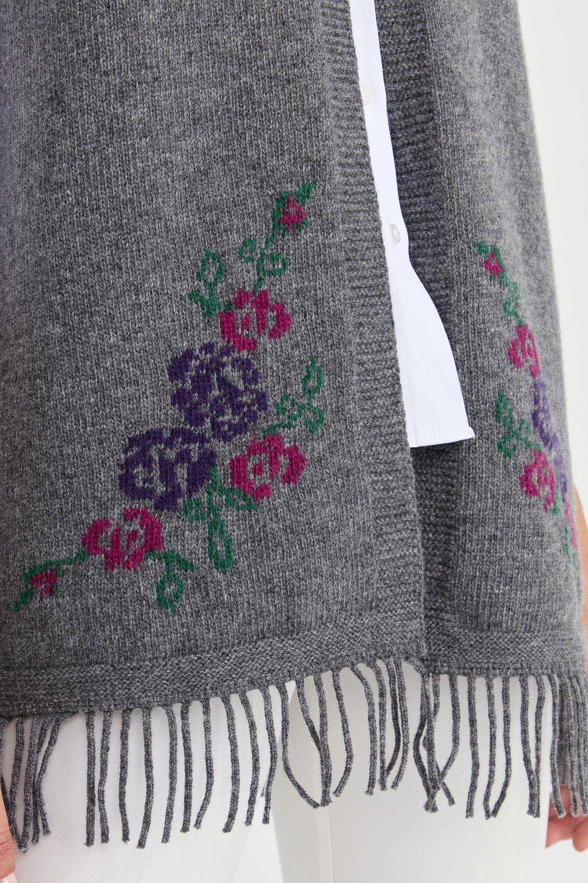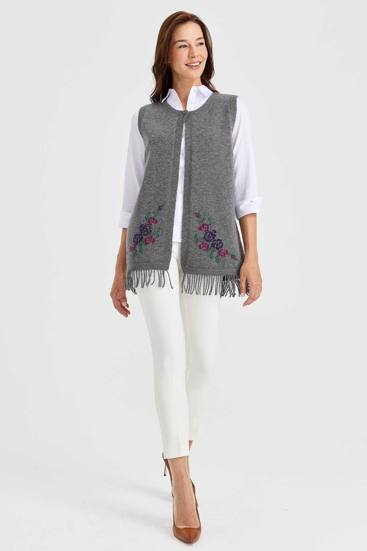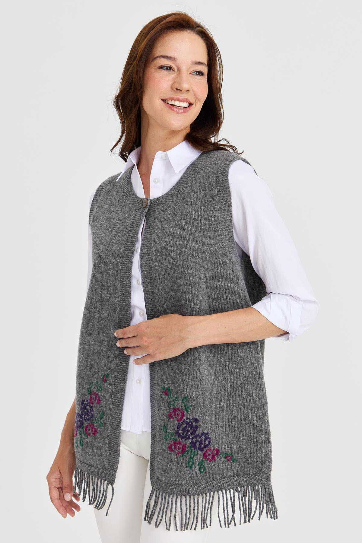 Desen Triko Kadın Eteği Çiçekli Püsküllü Yelek 23225 Füme