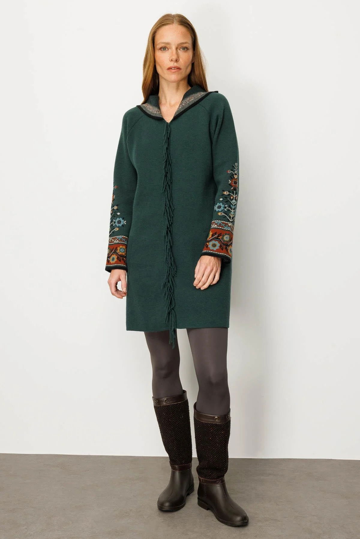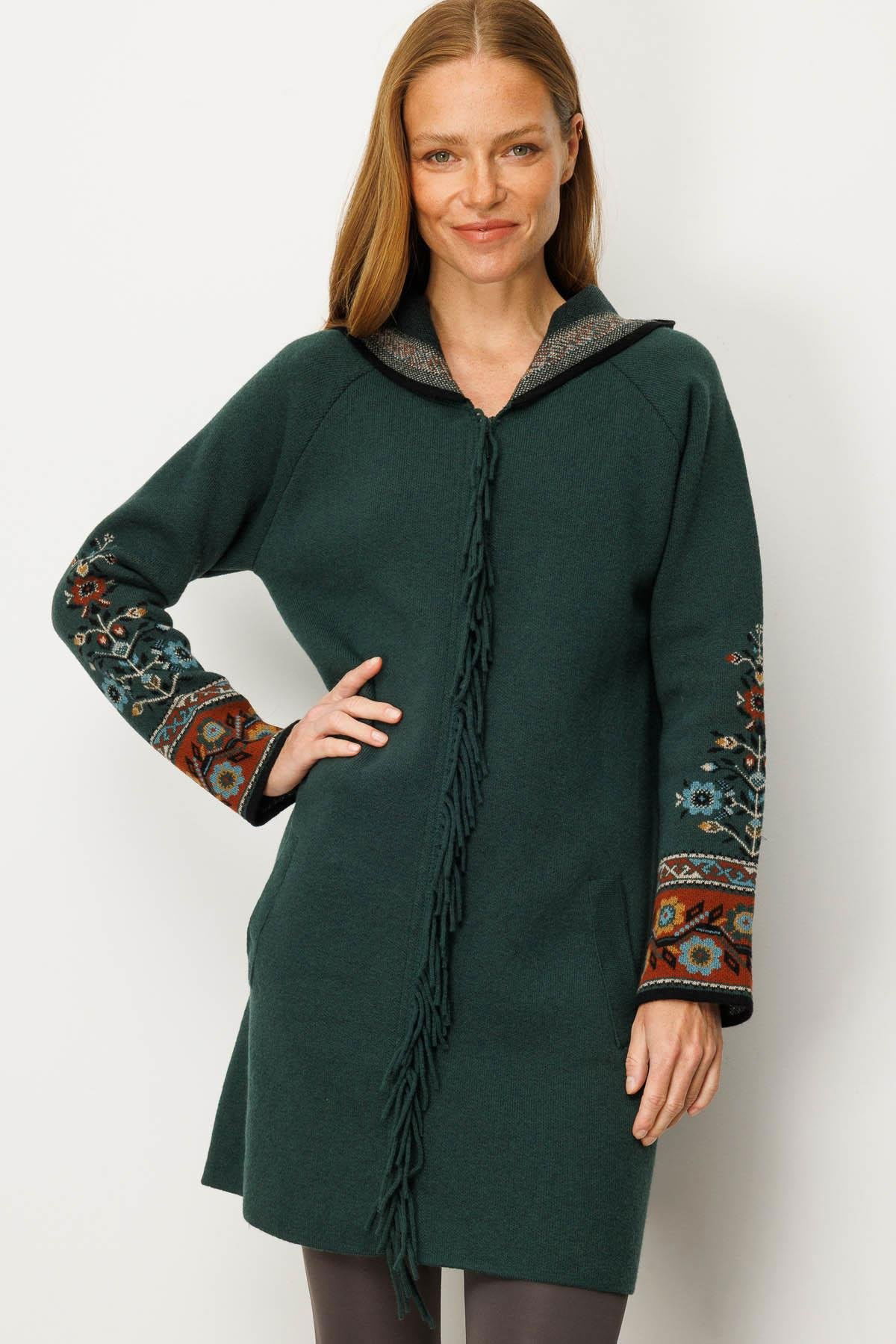 Desen Triko Kadın Kapüşonlu Kilim Jakarlı Püsküllü Yün Kaban 25056 Yeşil