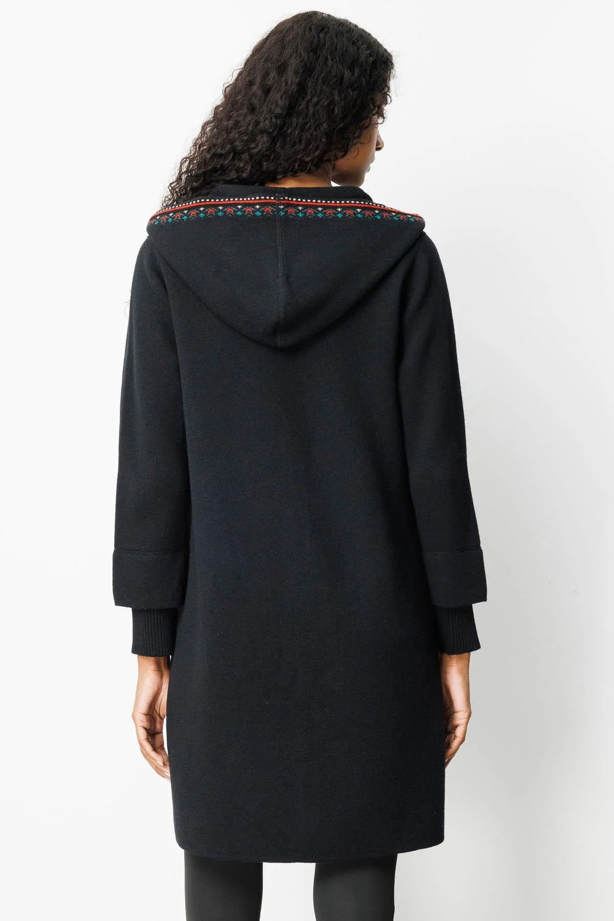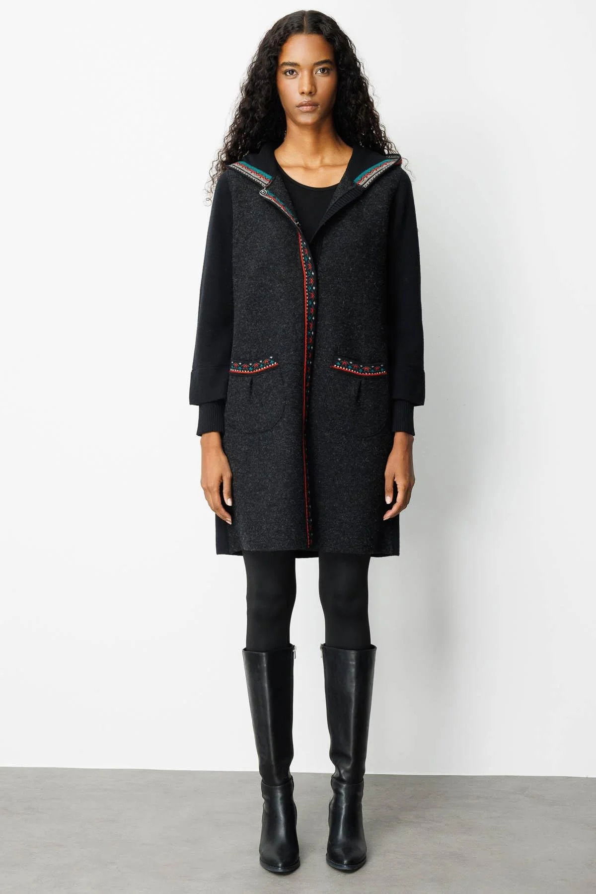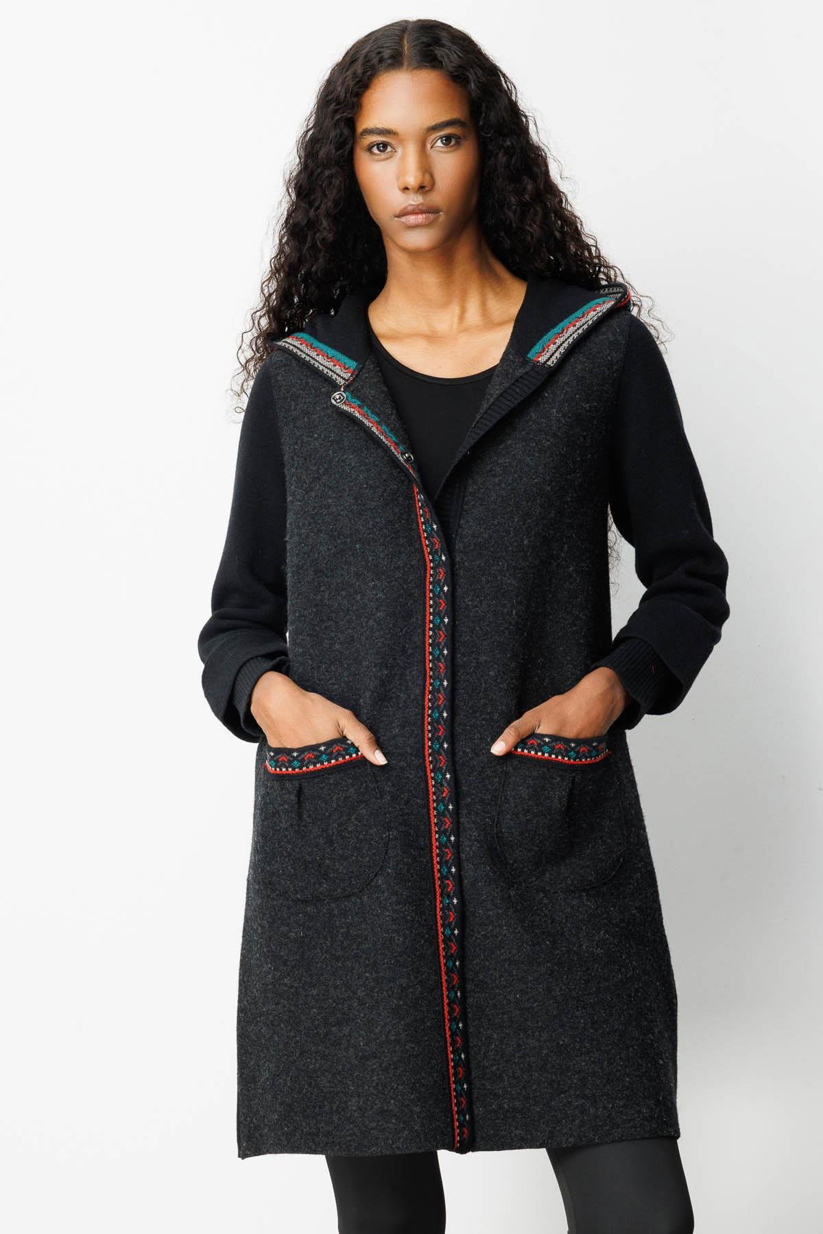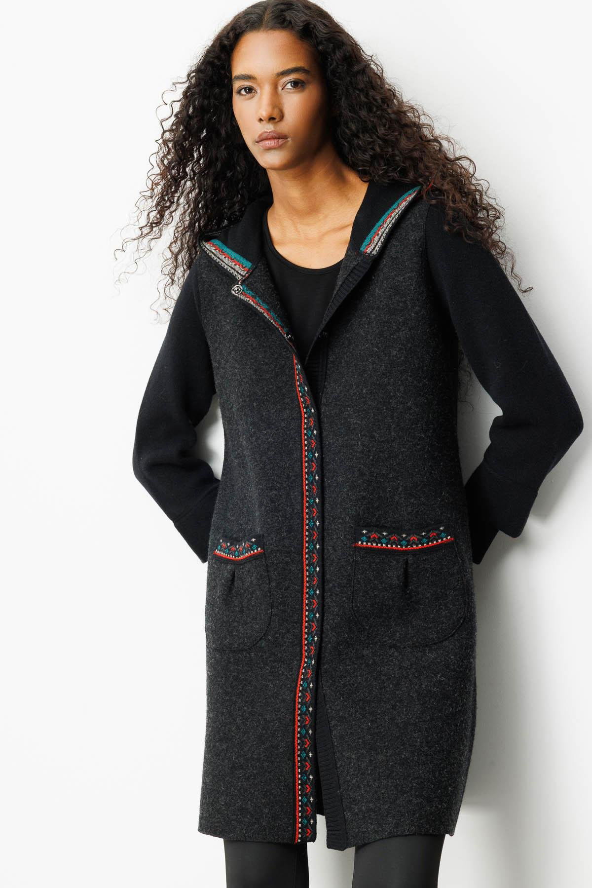 Desen Triko Kadın Kapüşonlu Önü Keçe Yün Kaban 25019 Siyah