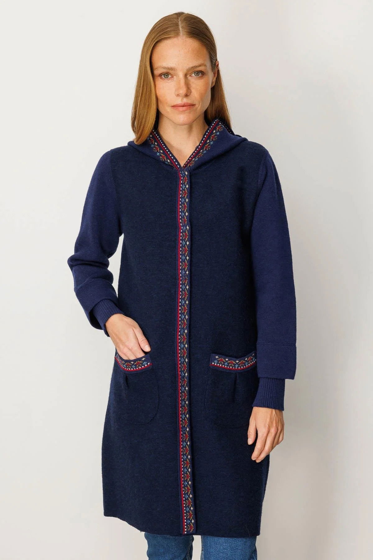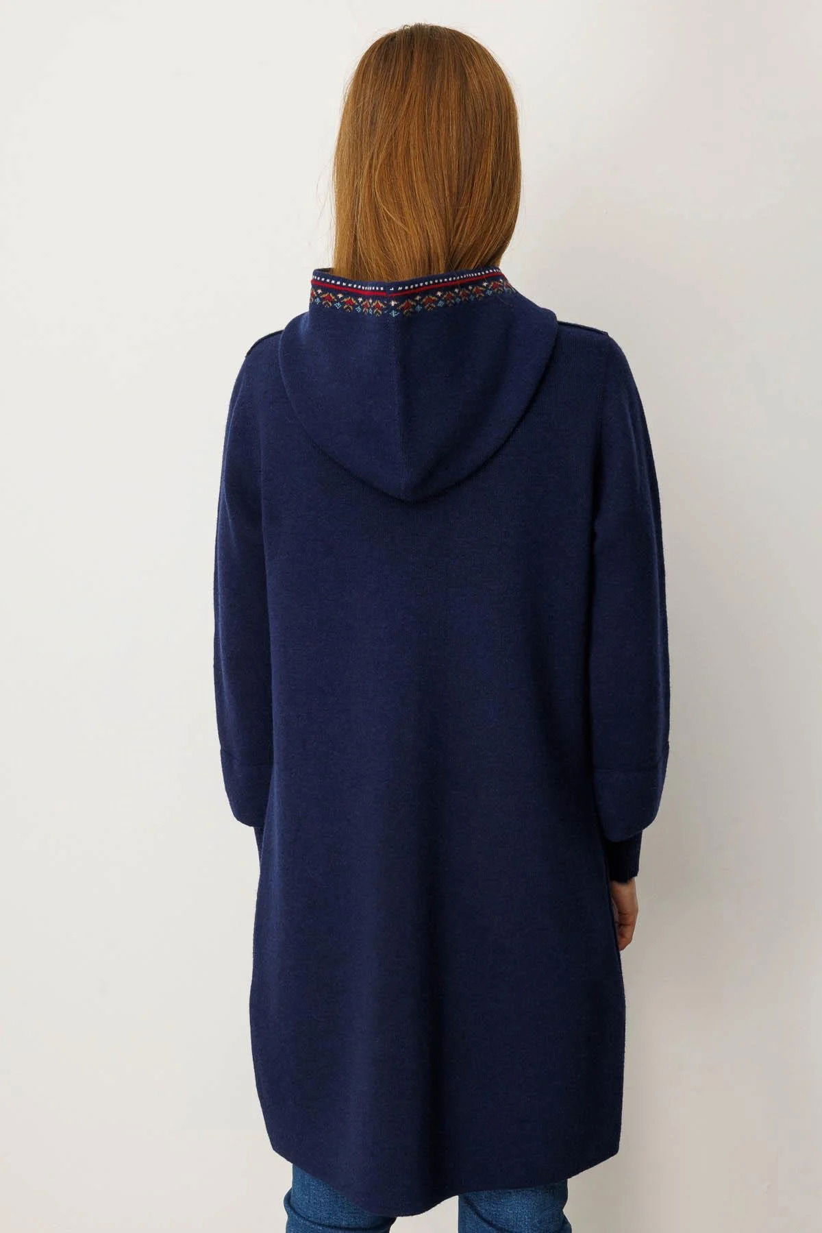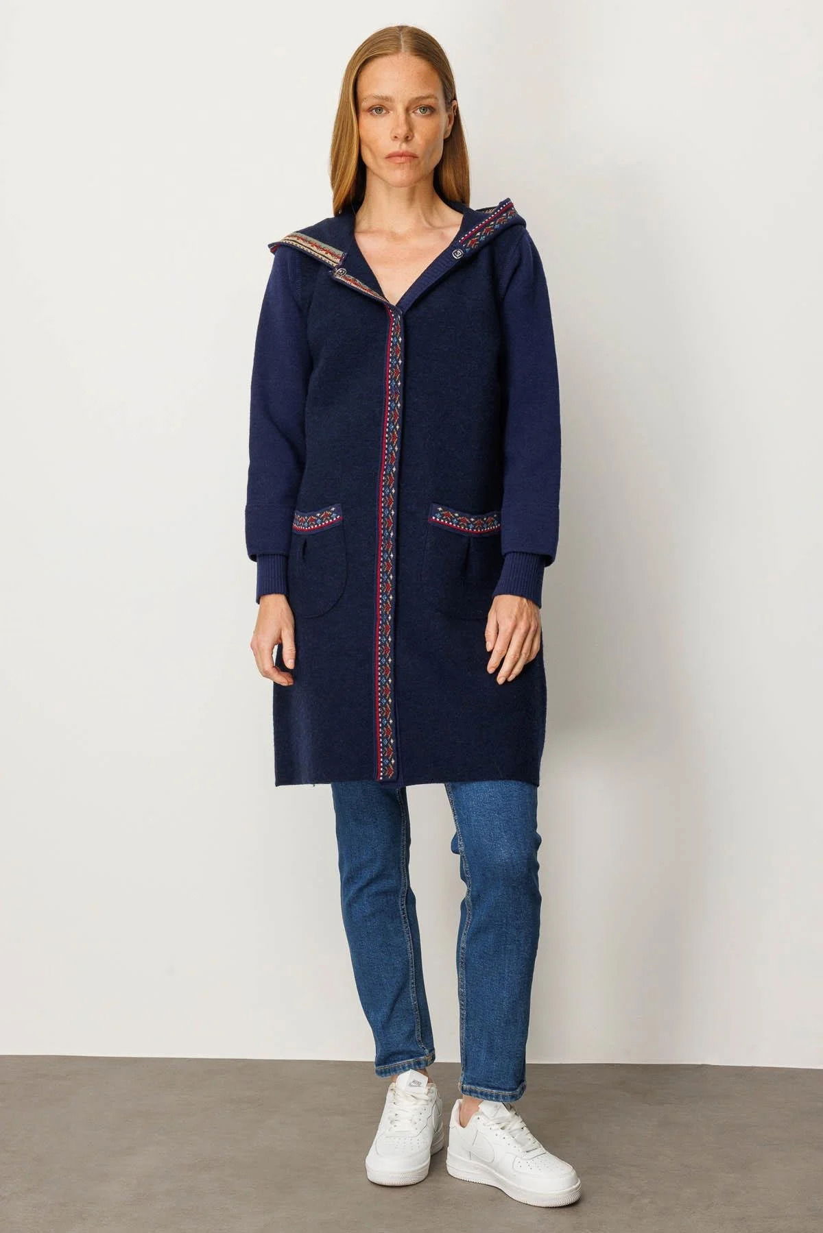 Desen Triko Kadın Kapüşonlu Önü Keçe Yün Kaban 25019 Y.A. Lacivert