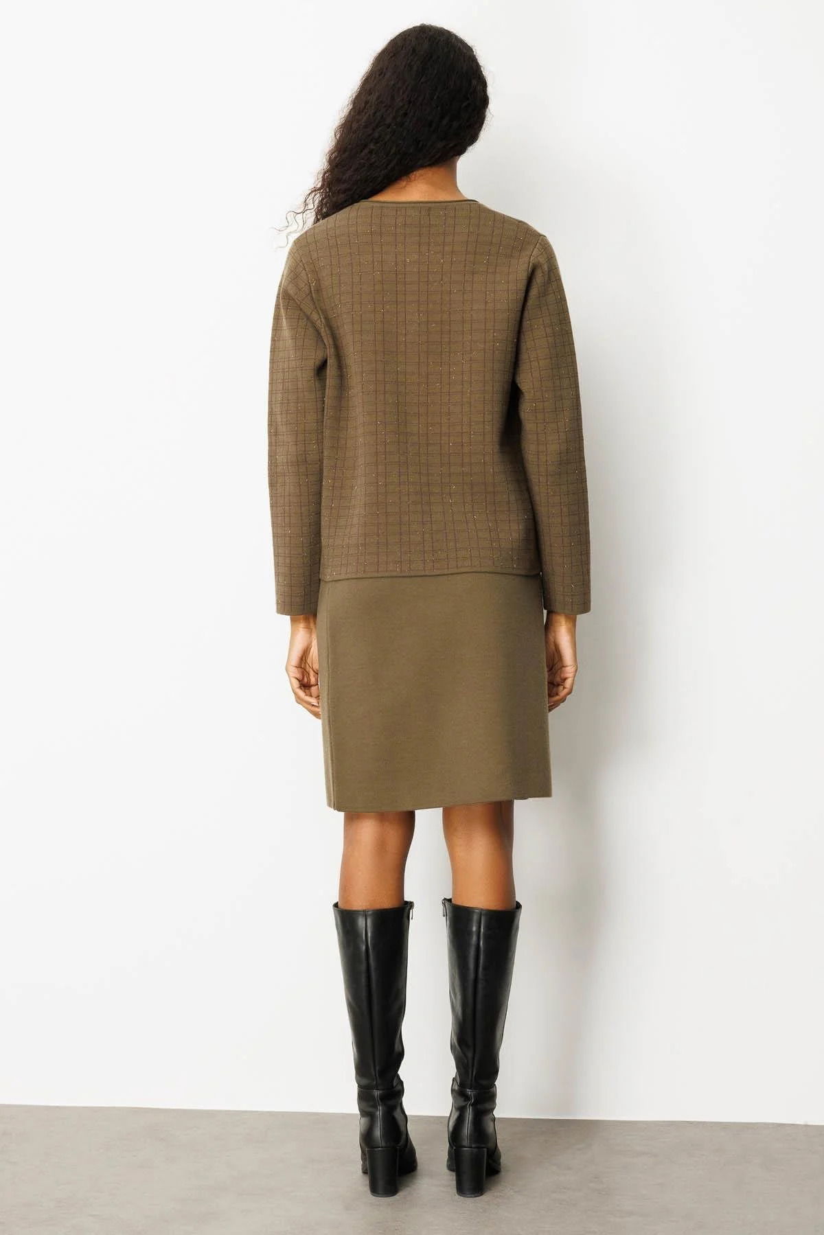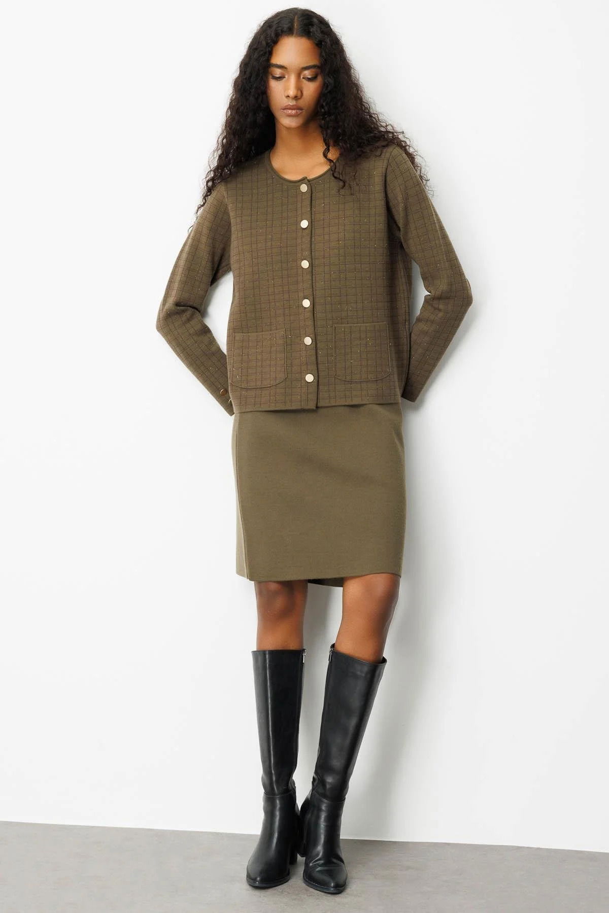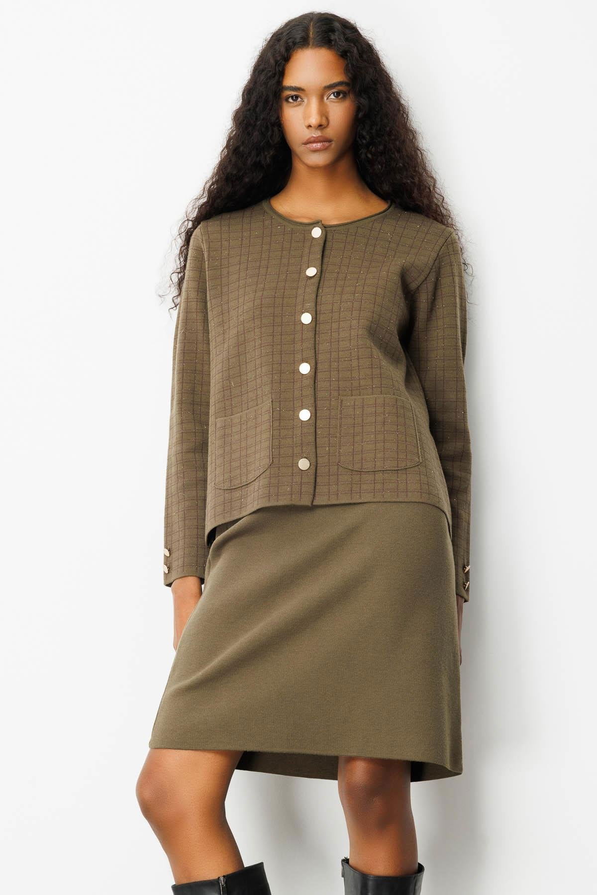 Desen Triko Kadın Kareli Simli Ceket 25065 Haki