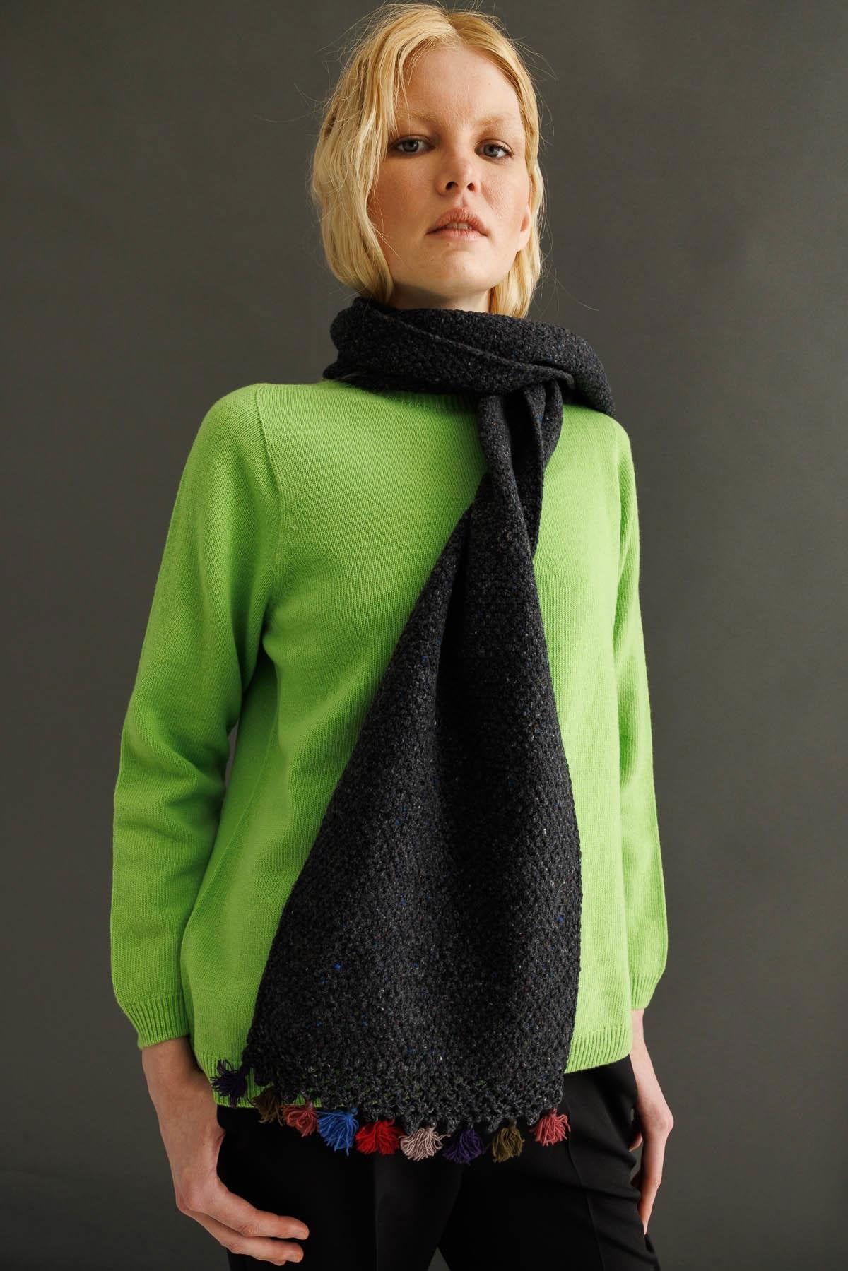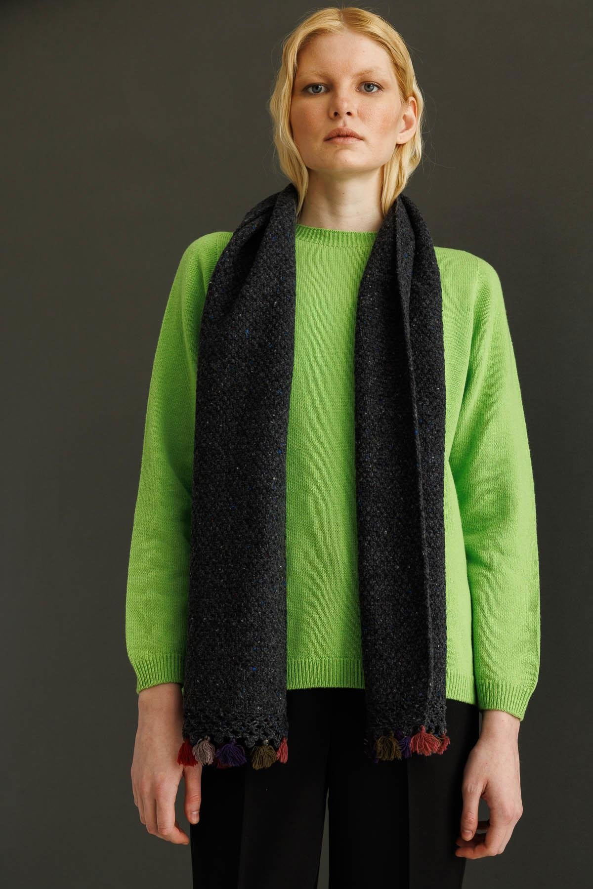 Desen Triko Kadın Kenarı Tığlamalı Püsküllü Yün Kaşkol 22033 K.Füme