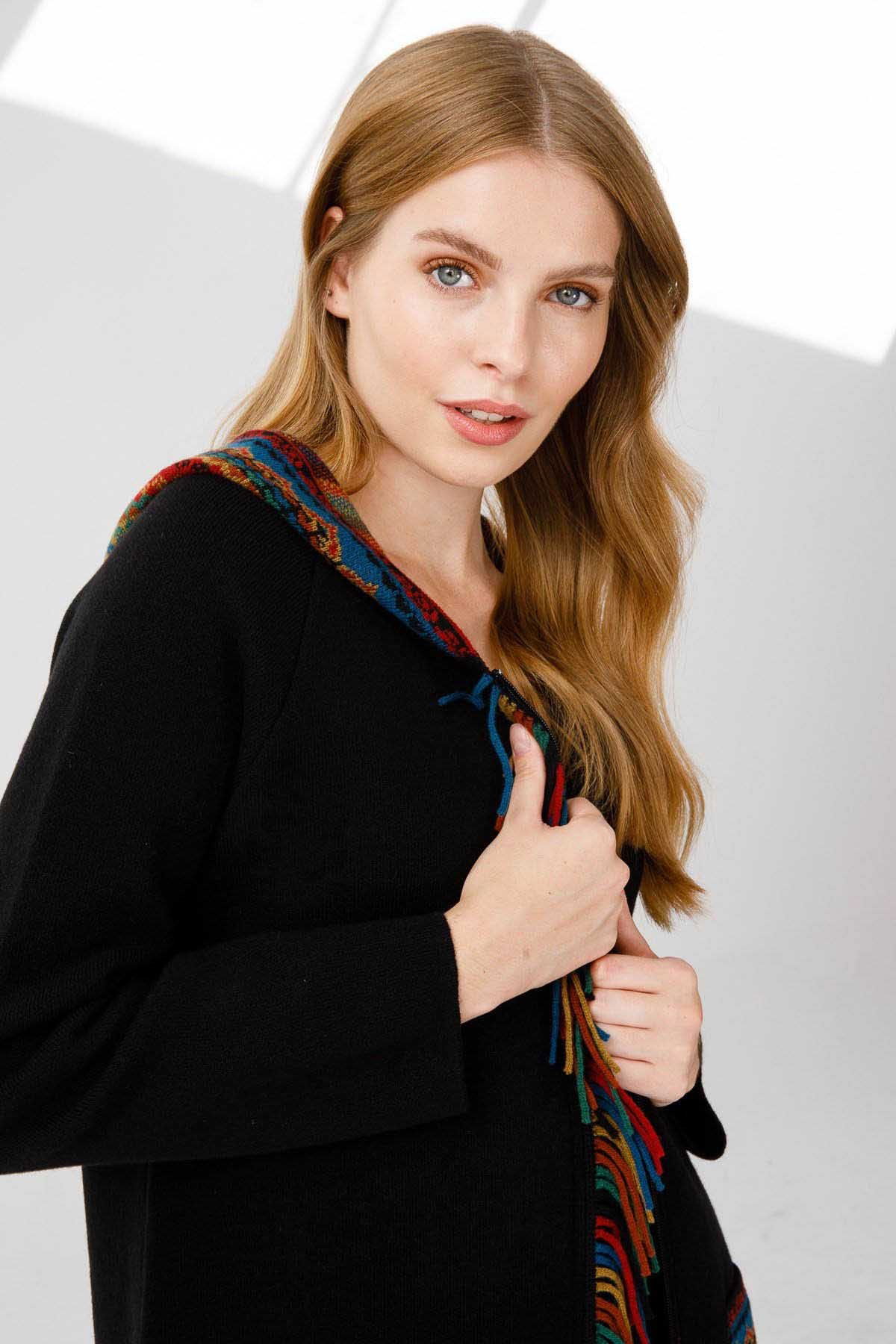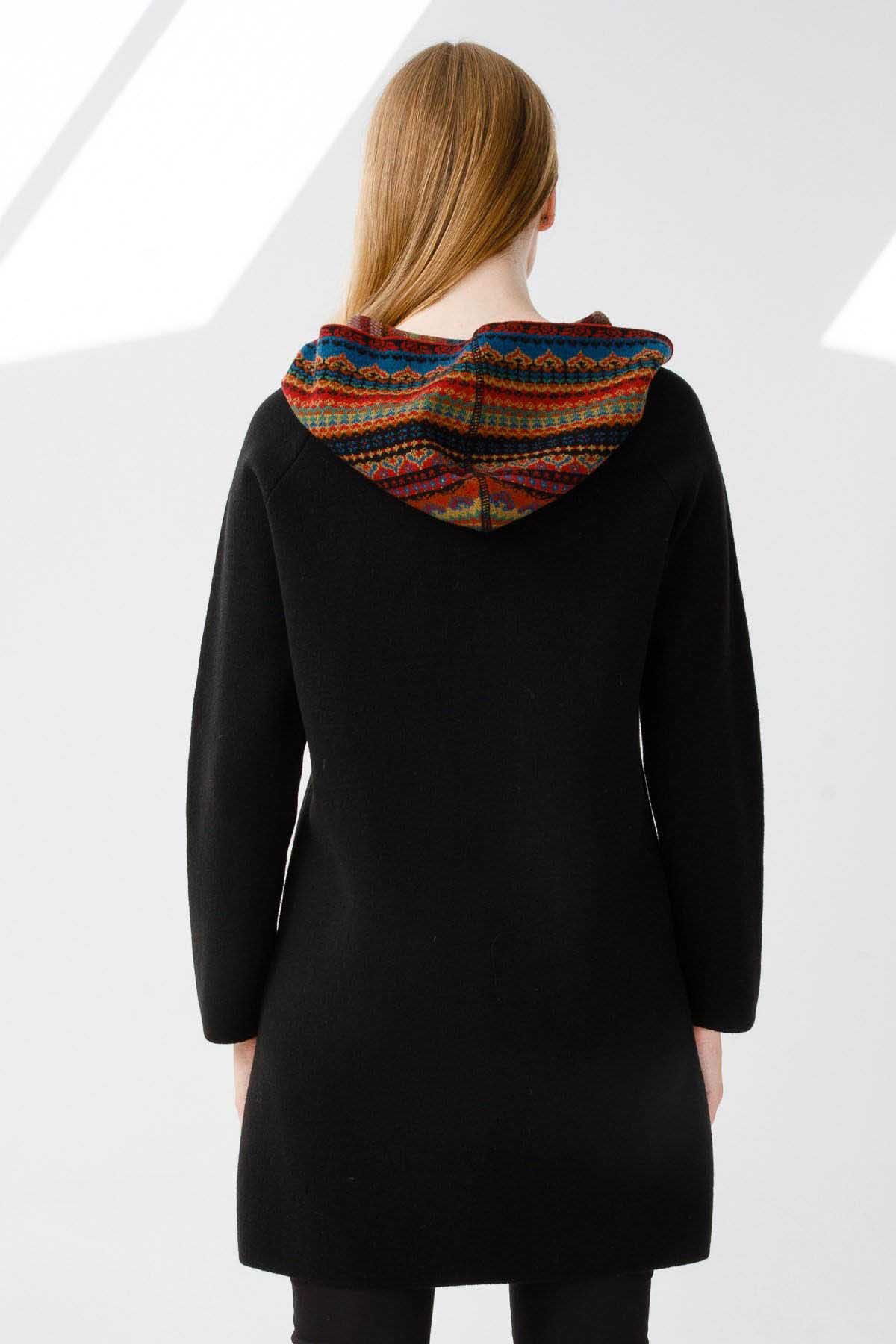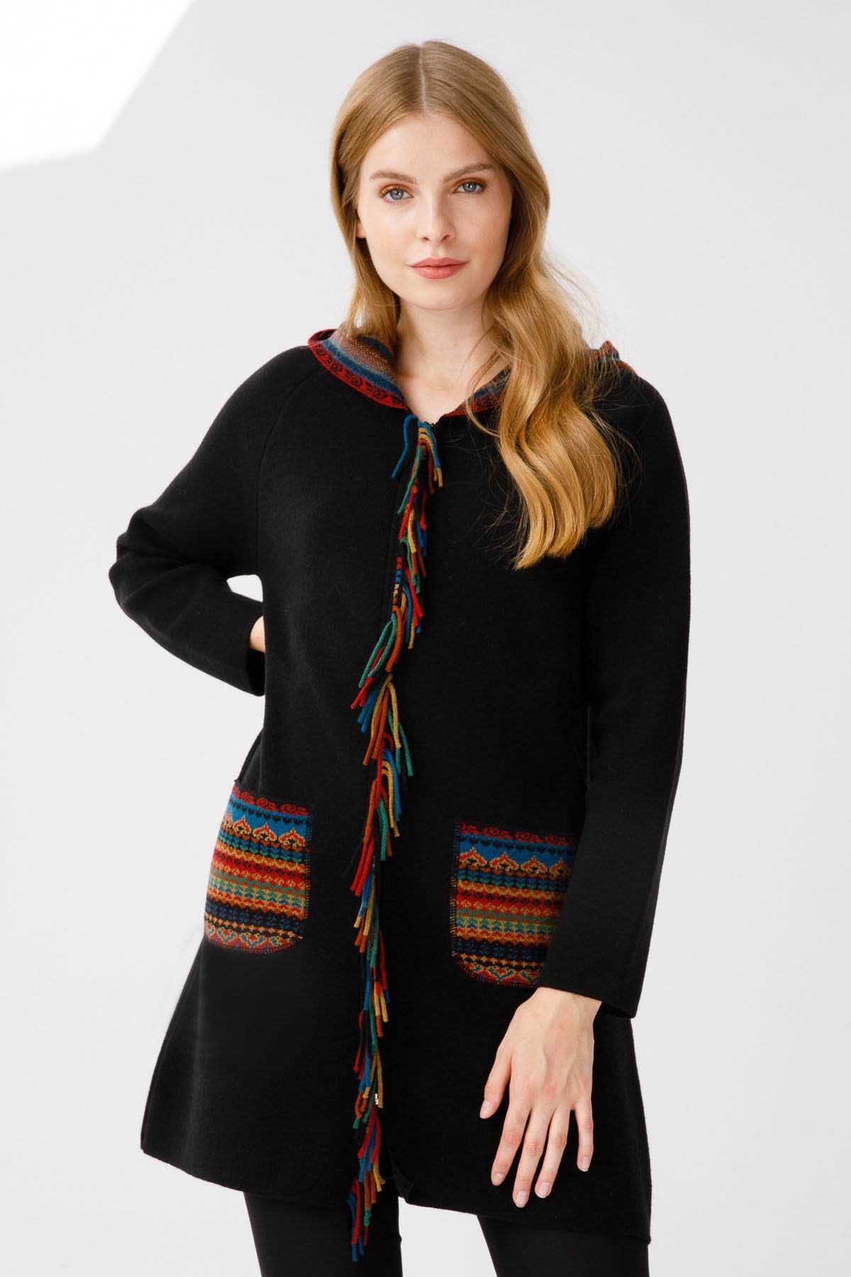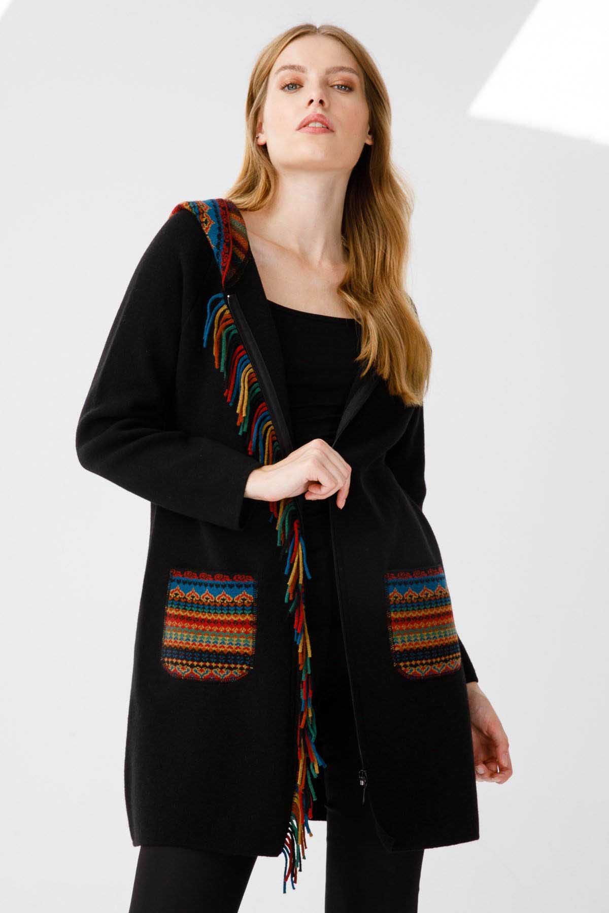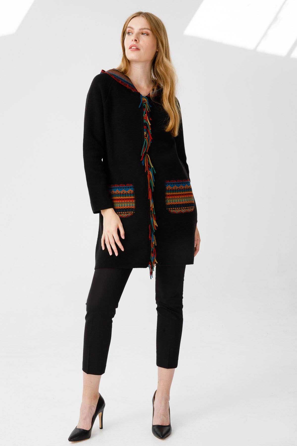 Detay: Desenli, püsküllü, kapüşonlu kaban;