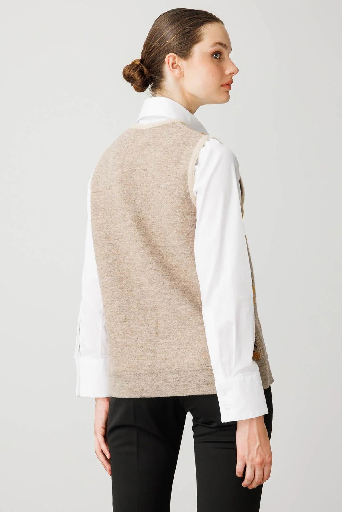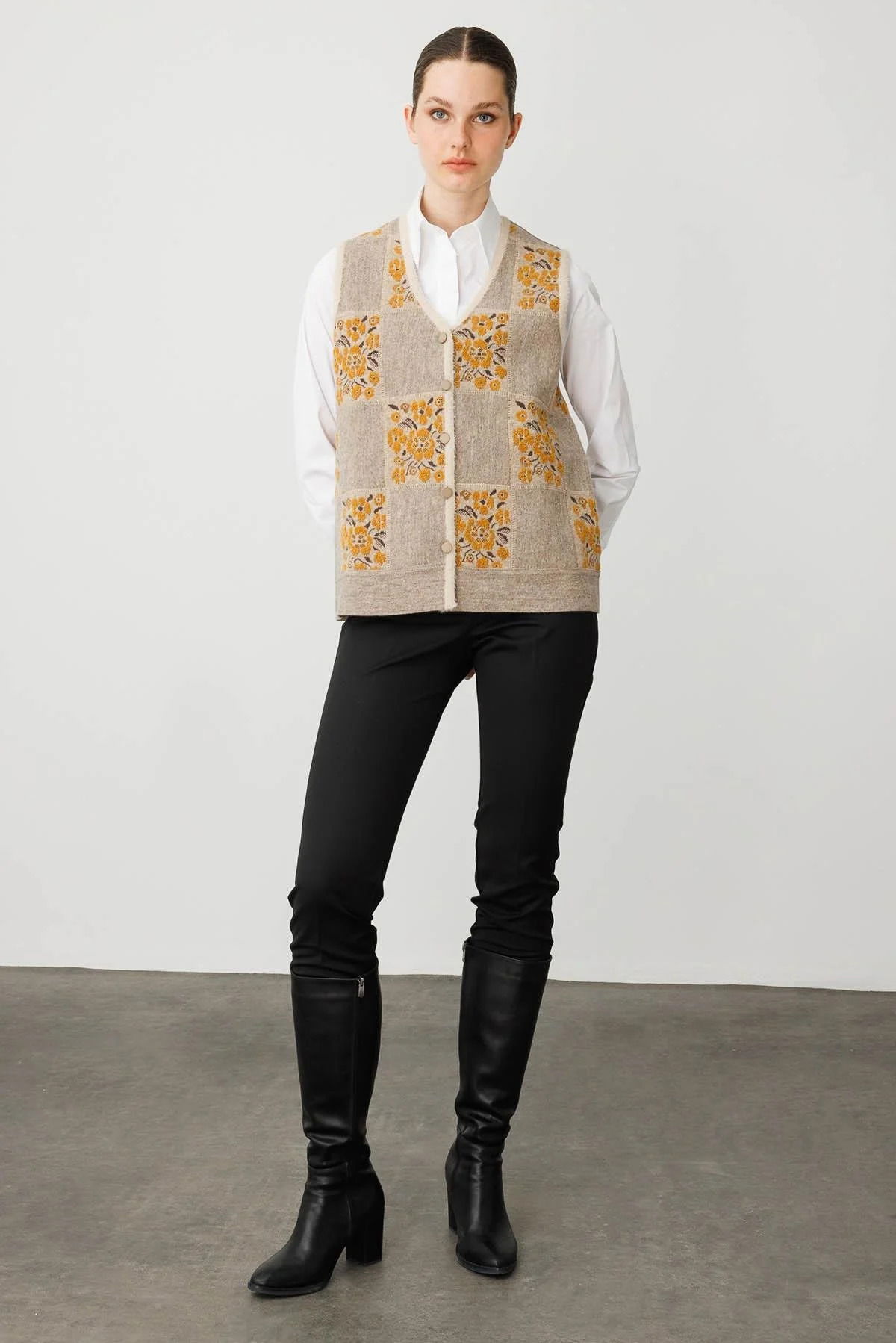 Desen Triko Kadın Pıtırcık Çiçekli Patchwork Keçe Yün Yelek 24084 Bej-Hardal