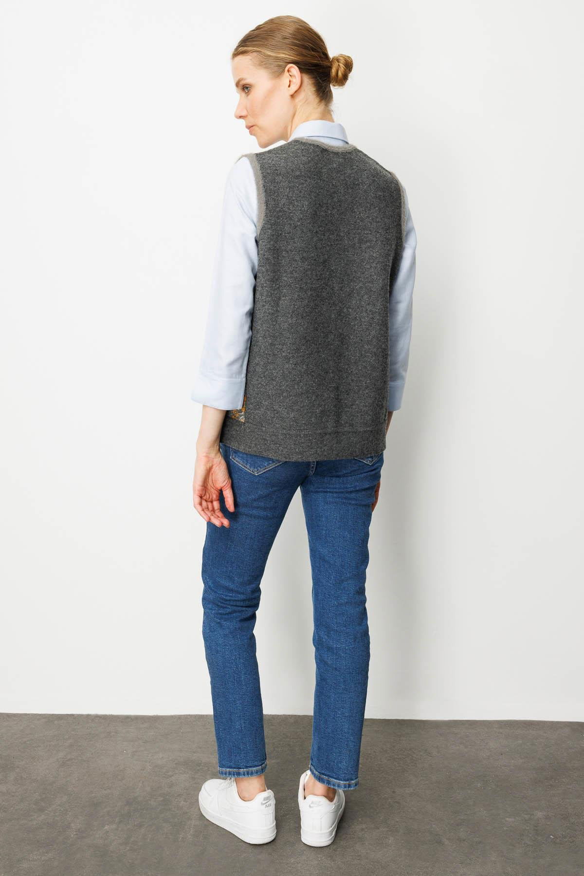 Desen Triko Kadın Pıtırcık Çiçekli Patchwork Keçe Yün Yelek 24084 Füme-Hardal