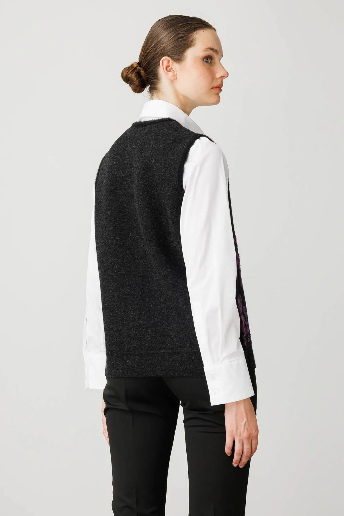 Desen Triko Kadın Pıtırcık Çiçekli Patchwork Keçe Yün Yelek 24084 Siyah-A.Mor