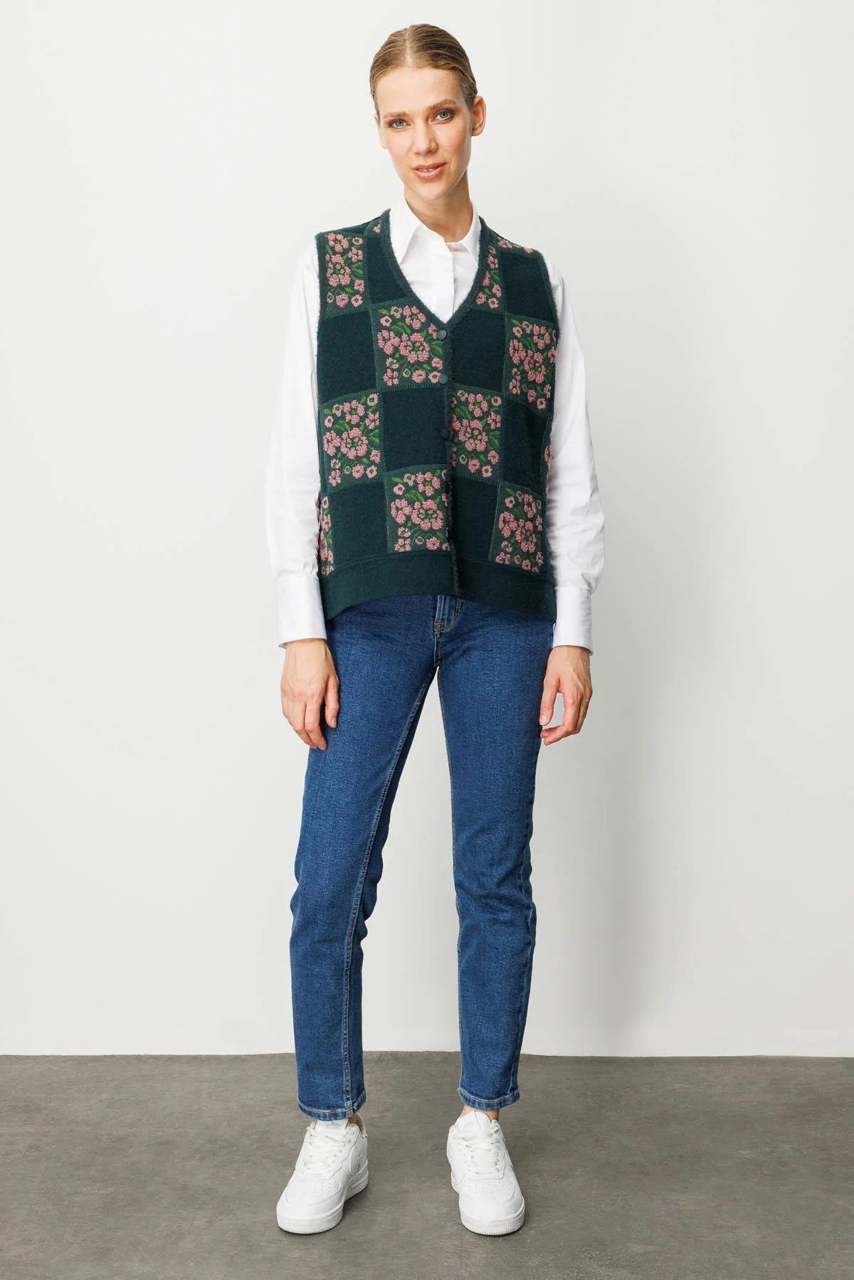 Desen Triko Kadın Pıtırcık Çiçekli Patchwork Keçe Yün Yelek 24084 Yeşil G.Kurusu