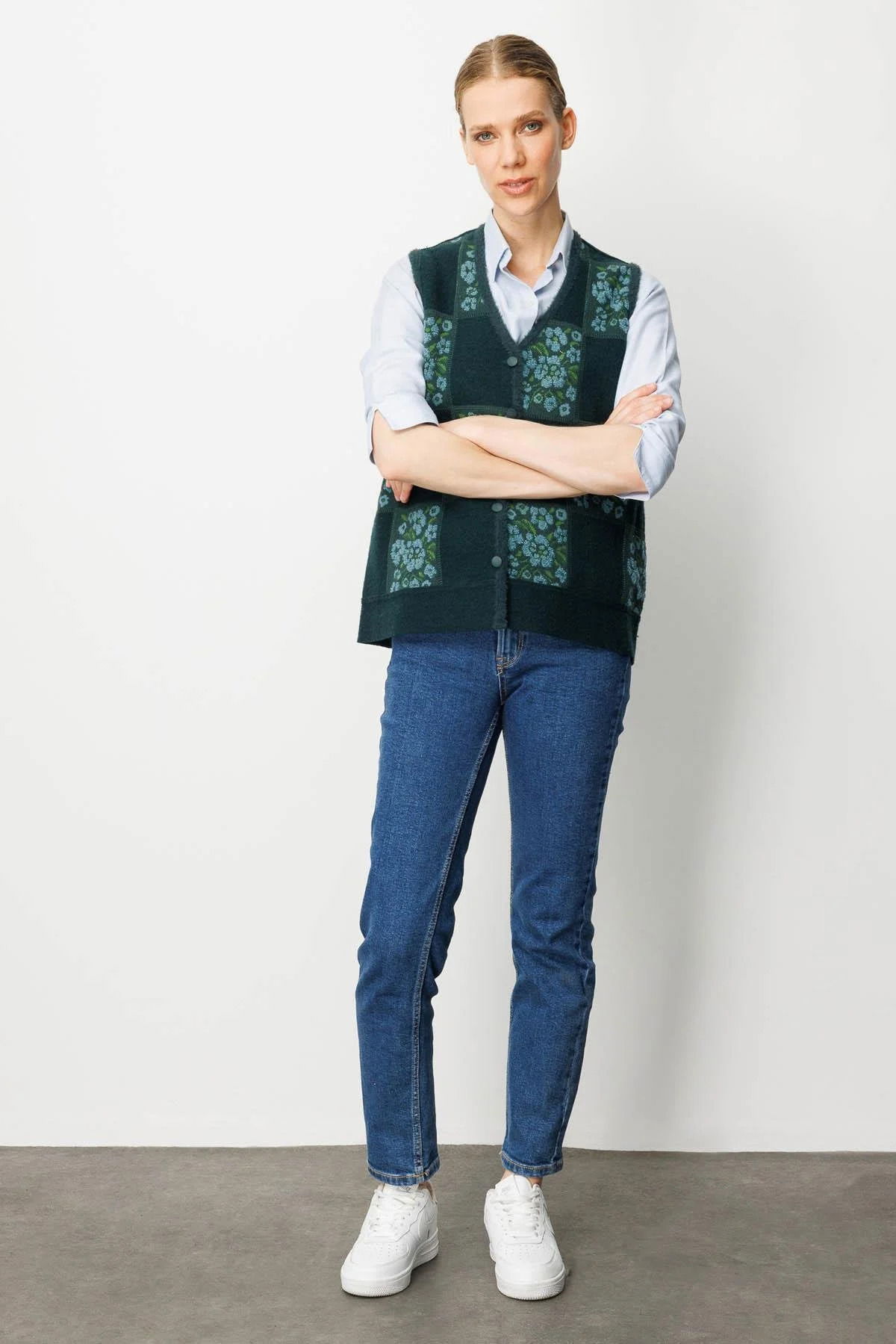 Desen Triko Kadın Pıtırcık Çiçekli Patchwork Keçe Yün Yelek 24084 Yeşil-Mint