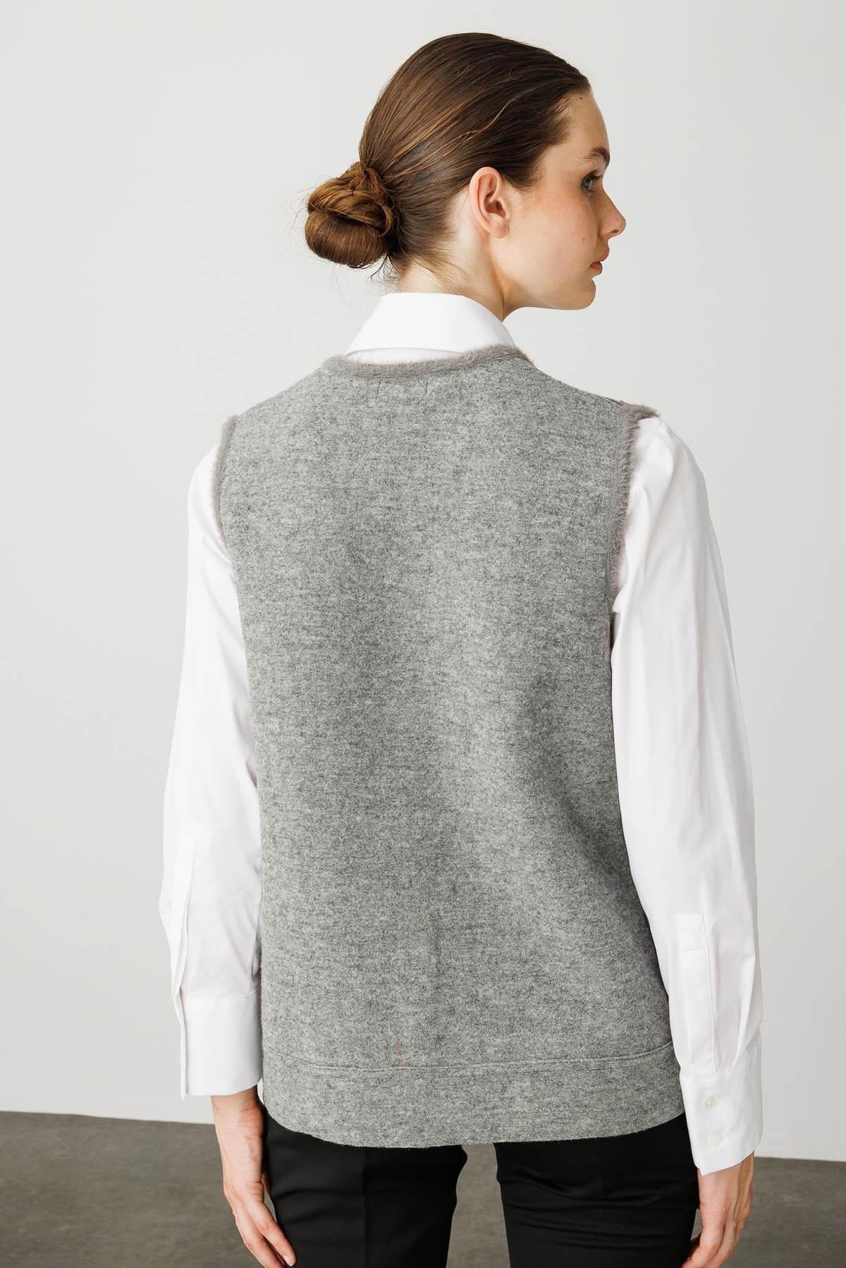 Detay: Desenli yapısı ve V yaka tasarımıyla dikkat çeken bu kolsuz yünlü yelek, standart kalıbıyla konforlu bir şıklık sunar. Yünlü materyali sayesinde hem sıcak tutar hem de zarif bir duruş sergiler. Modern ve klasik tarzları bir araya getiren bu yelek, stil sahibi kombinlerin vazgeçilmez parçasıdır;