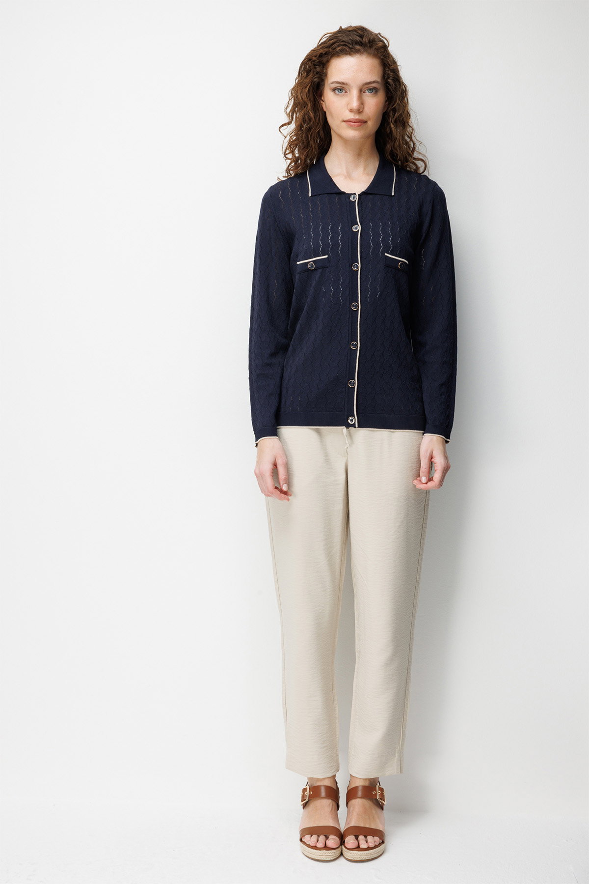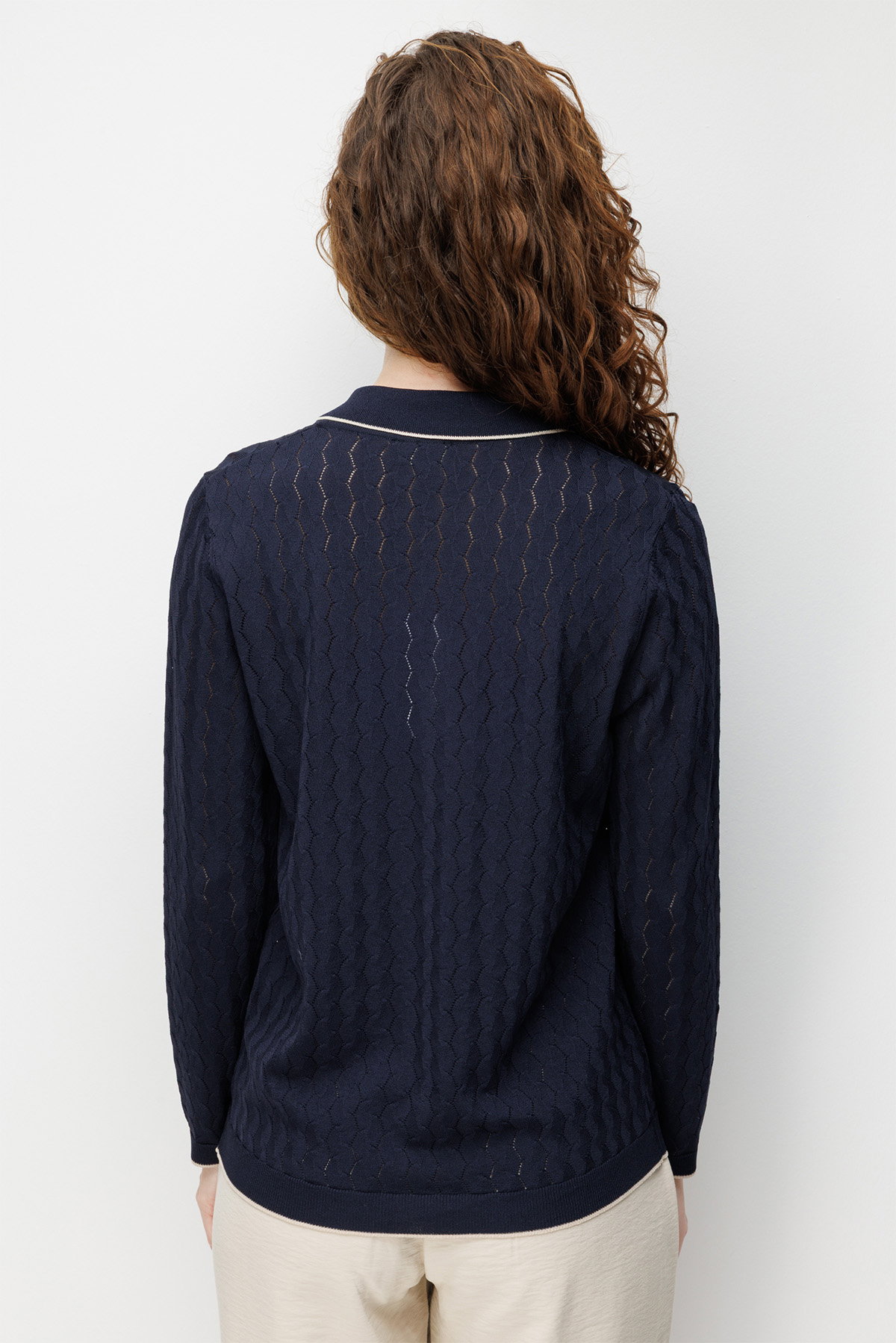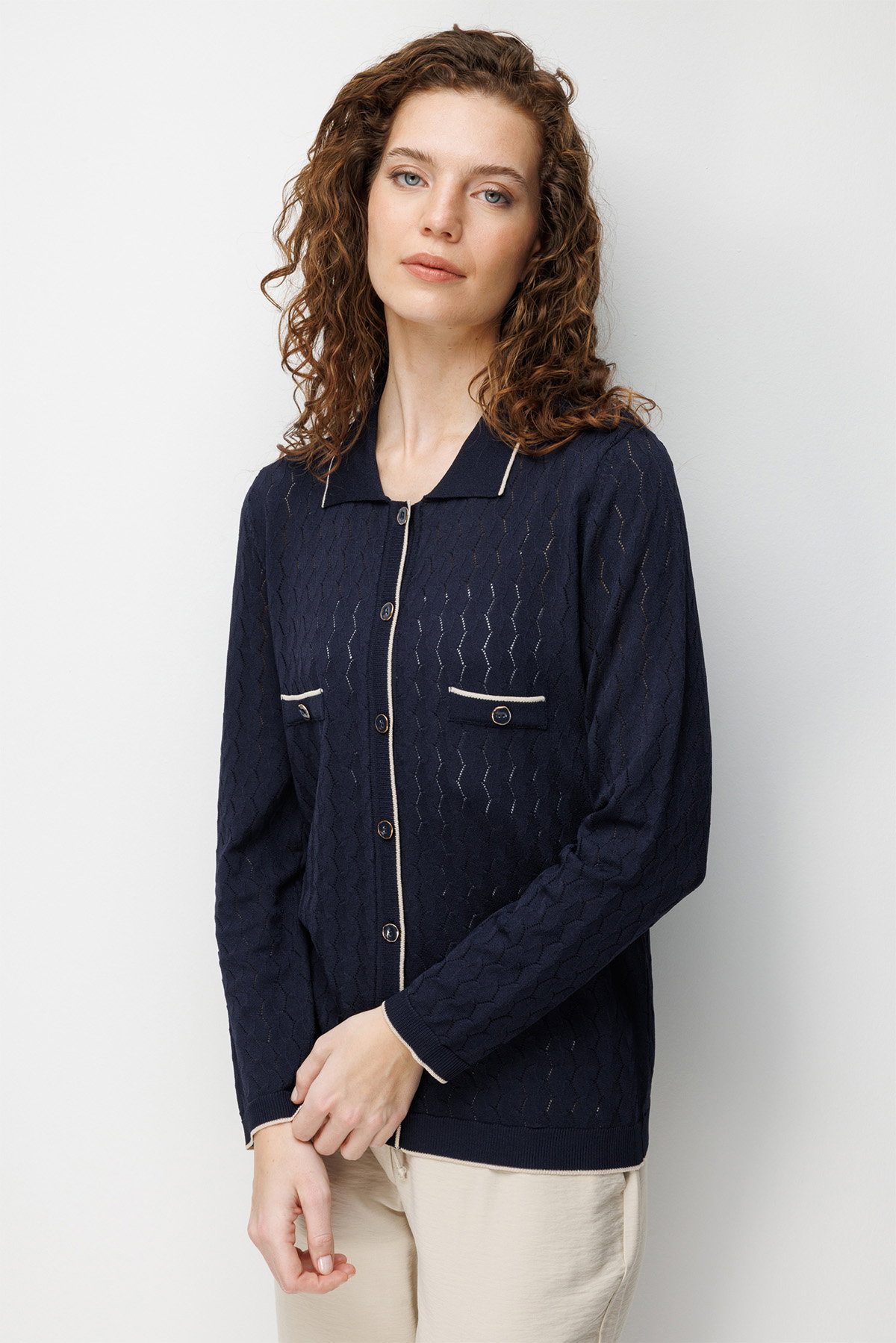 Desen Triko Kadın Polo Yaka Ajurlu Araboy İnce Triko Hırka 26356 Koyu Lacivert