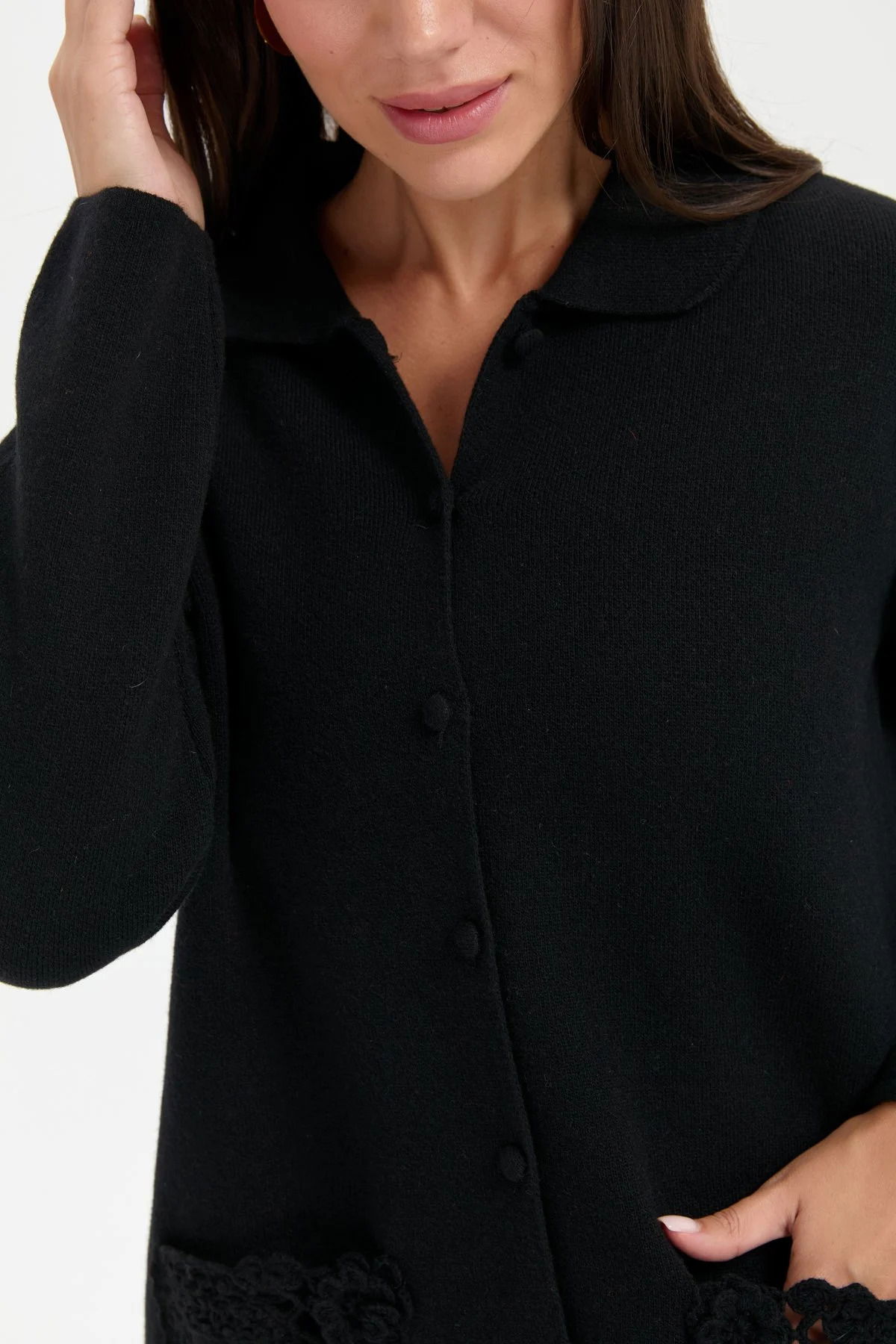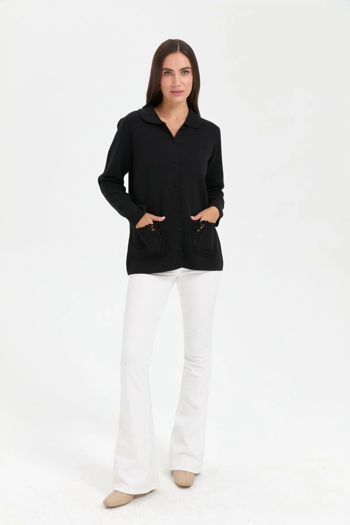 Desen Triko Kadın Polo Yaka Cebi Gül İşlemeli Kısa Yün Hırka 24015 Siyah