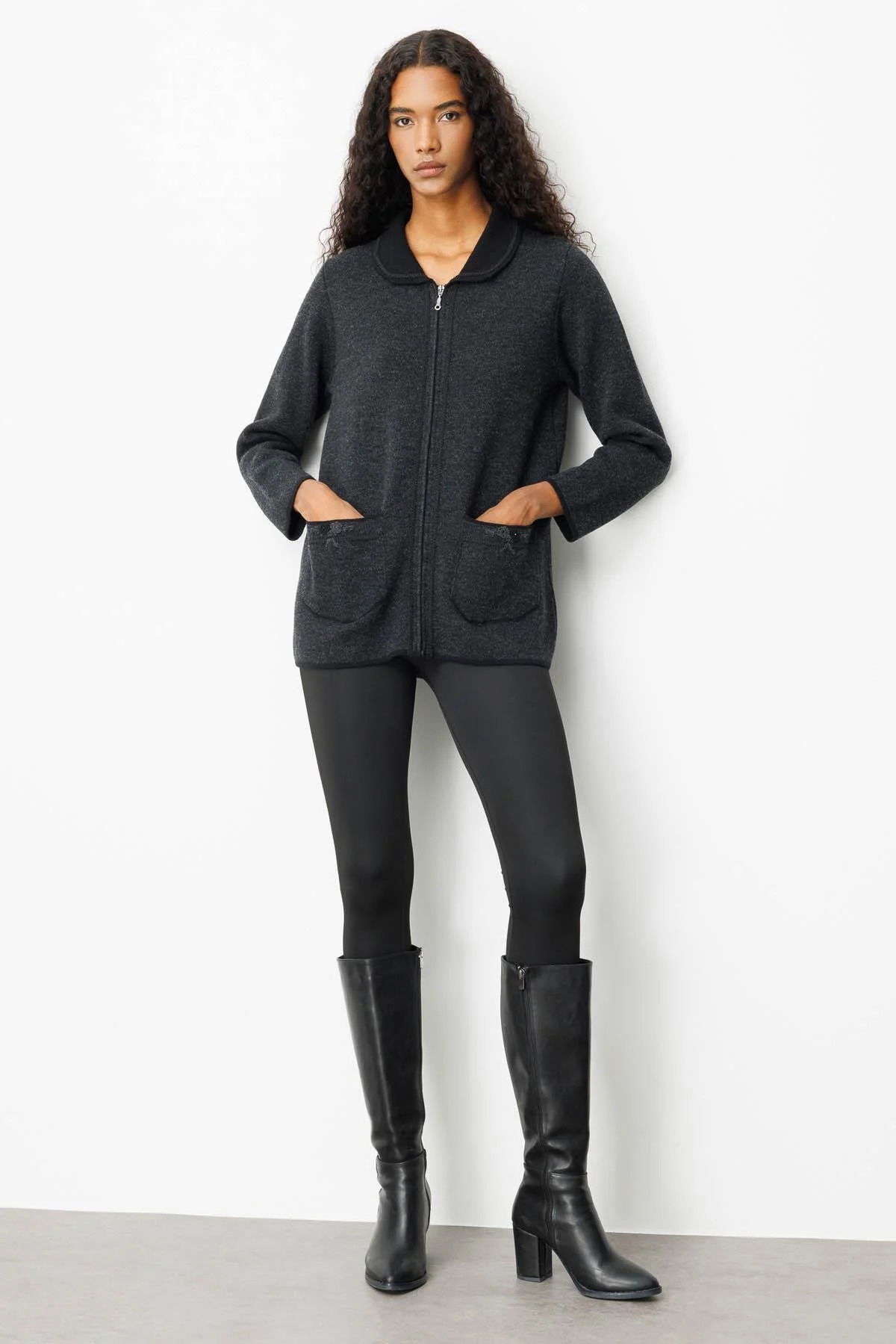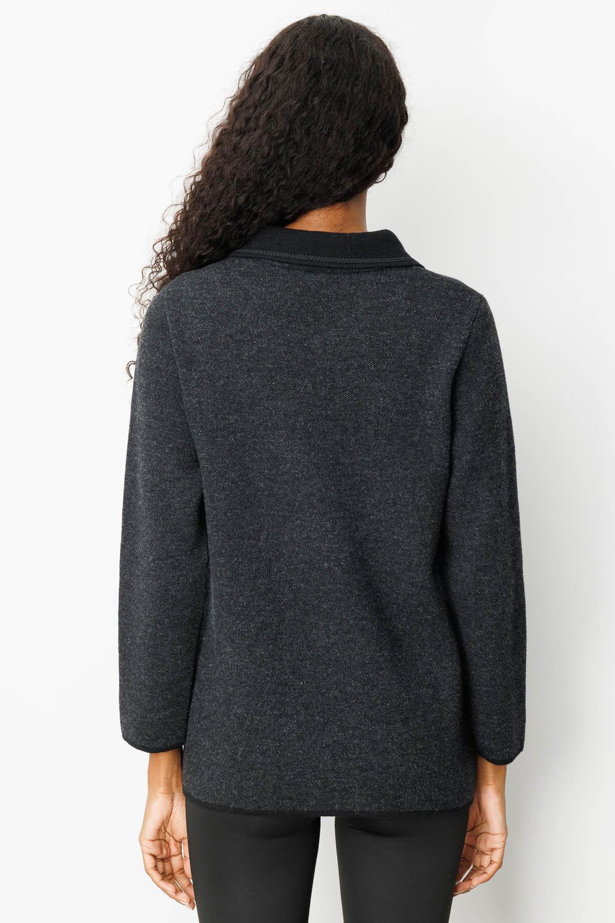 Desen Triko Kadın Polo Yaka Cebi Nakış İşlemeli Yün Hırka 25032 Siyah