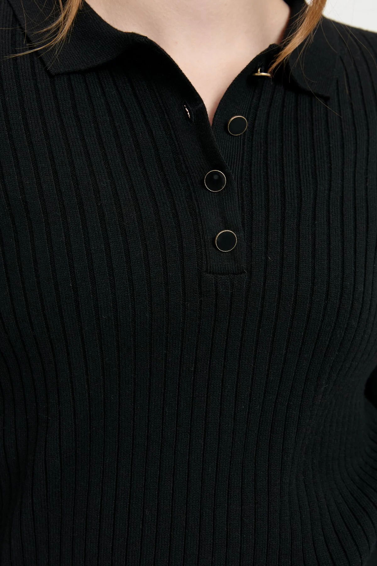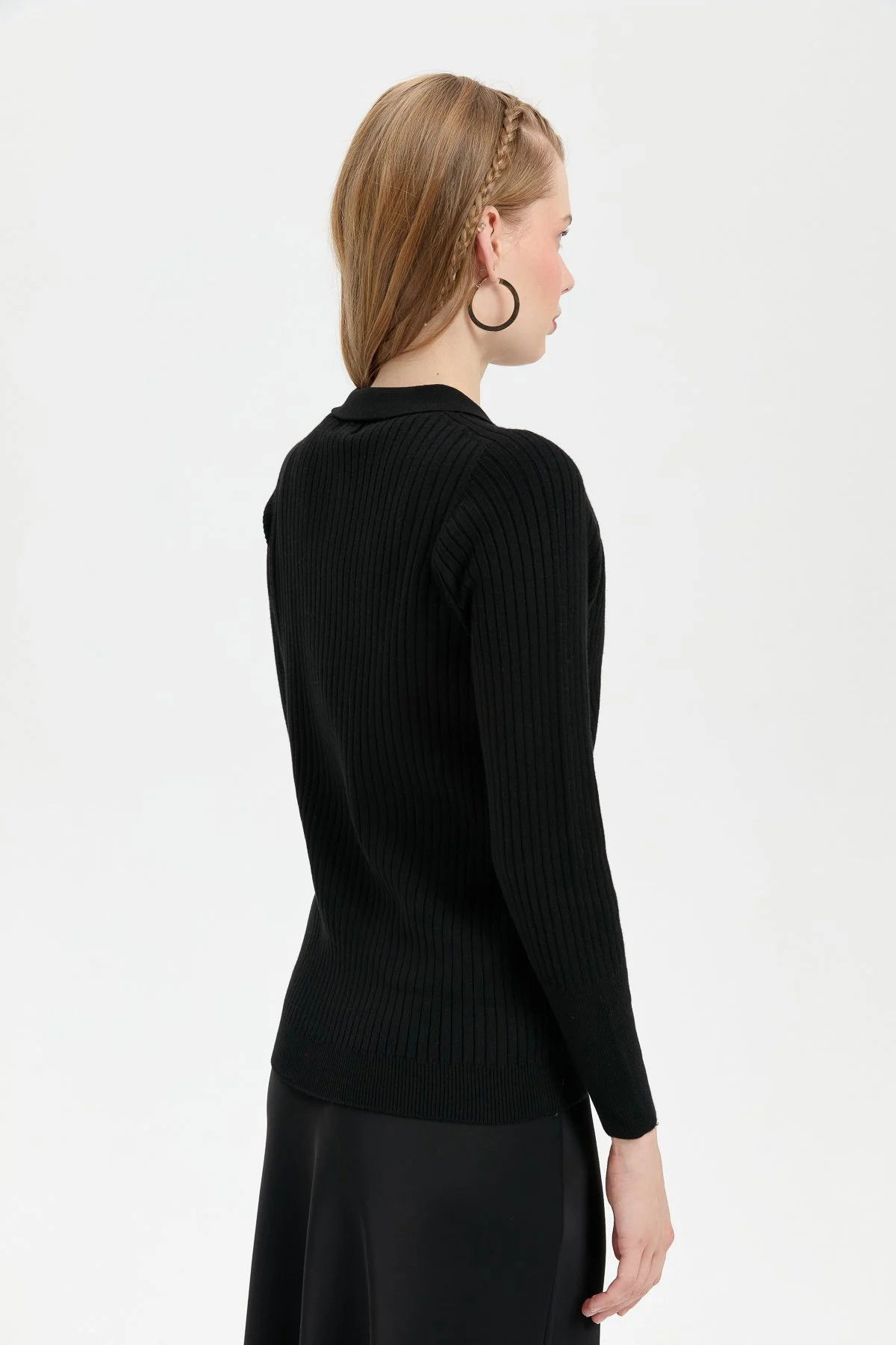 Detay: Uzun kollu, polo yaka, düz renk kazak;