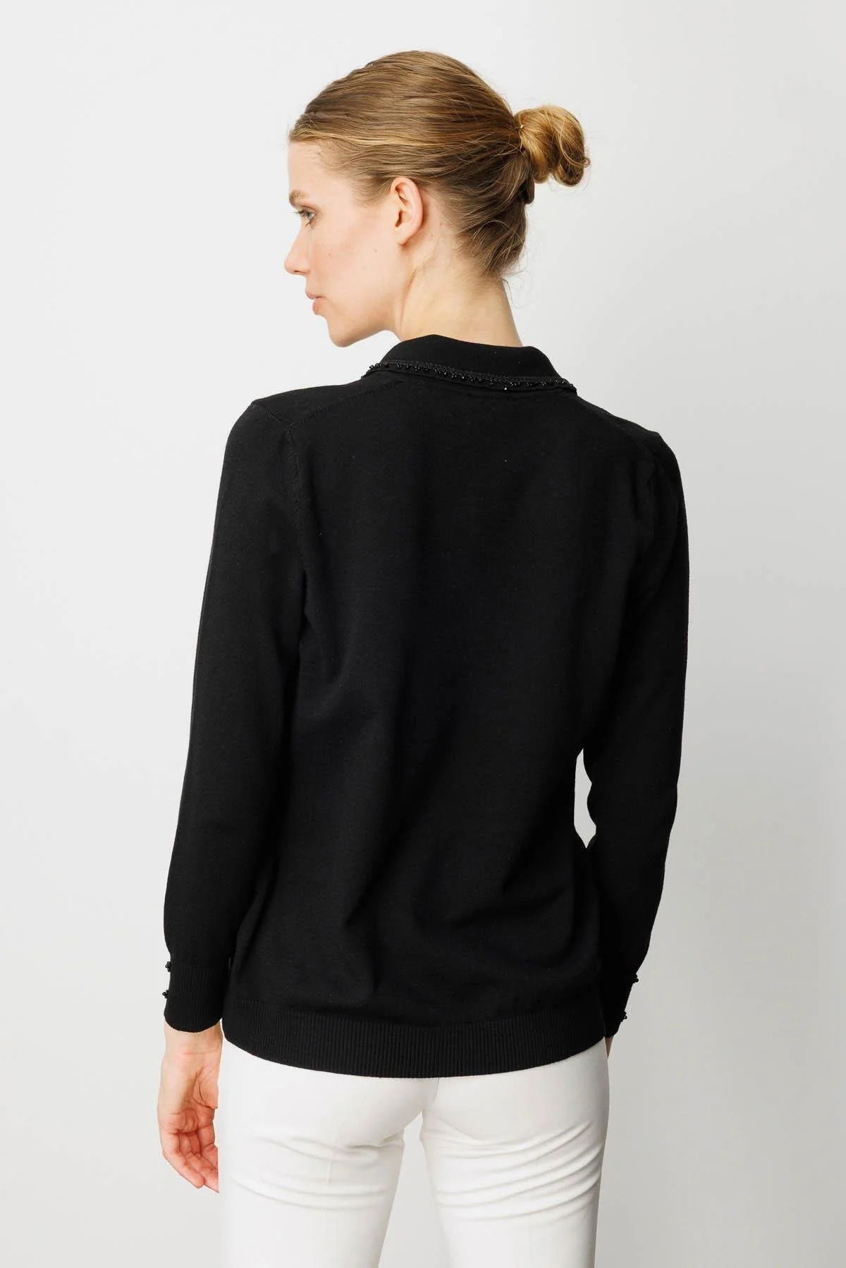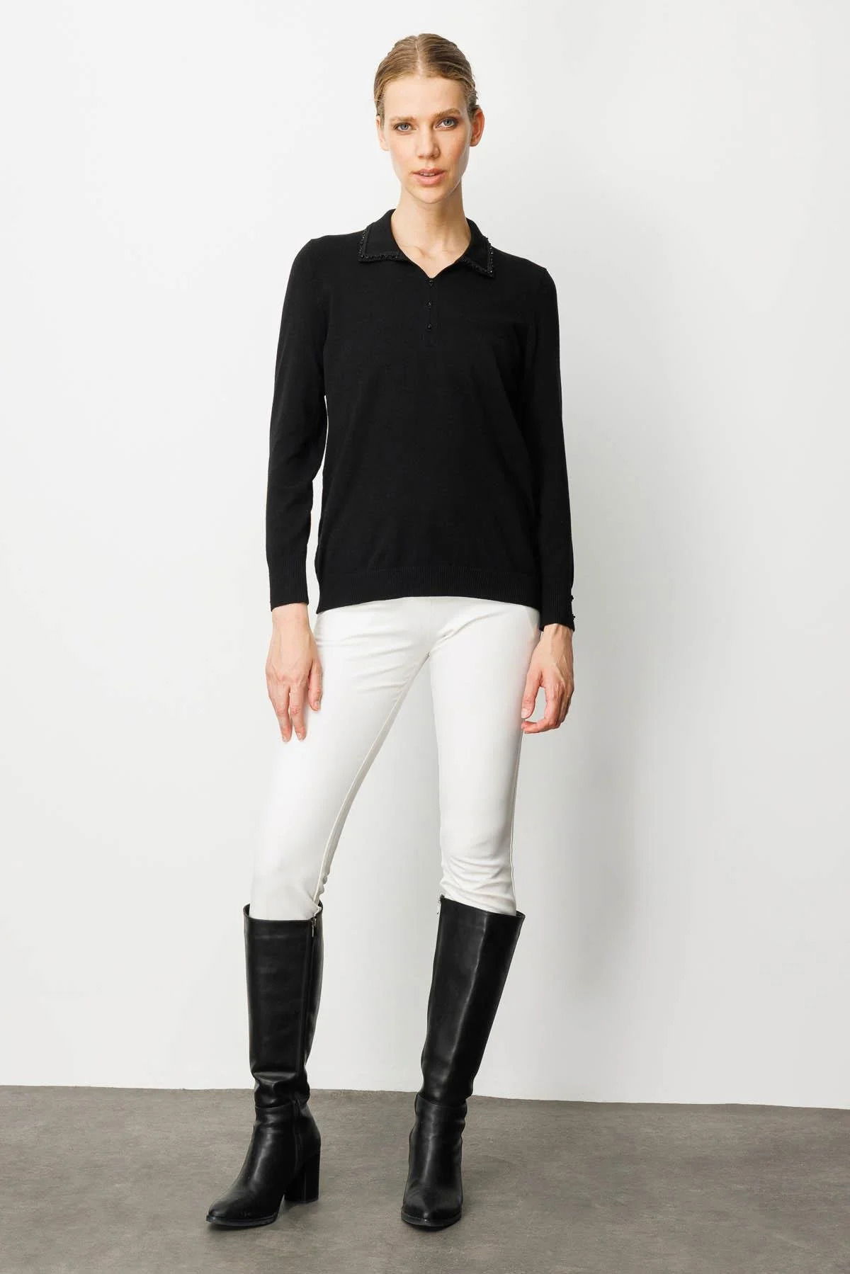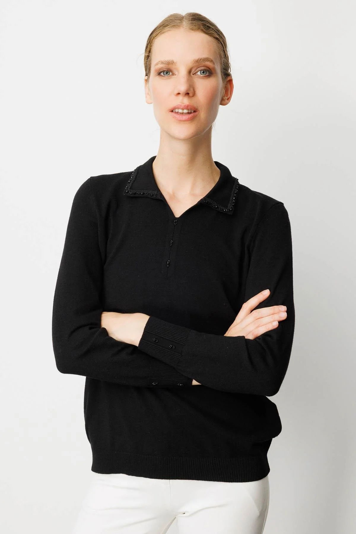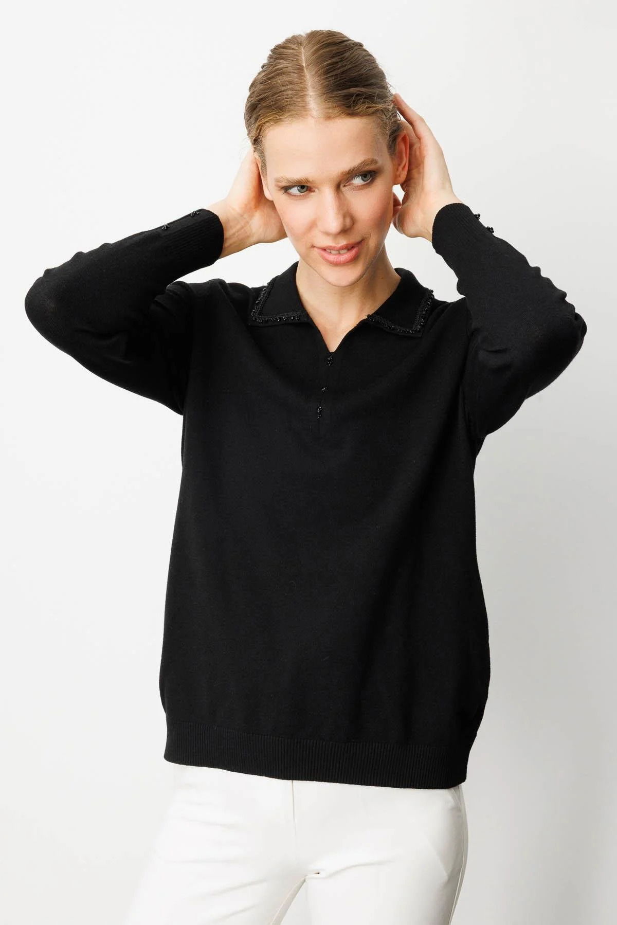 Desen Triko Kadın Polo Yaka Nakış İşlemeli Ligralı Bluz 25092 Siyah