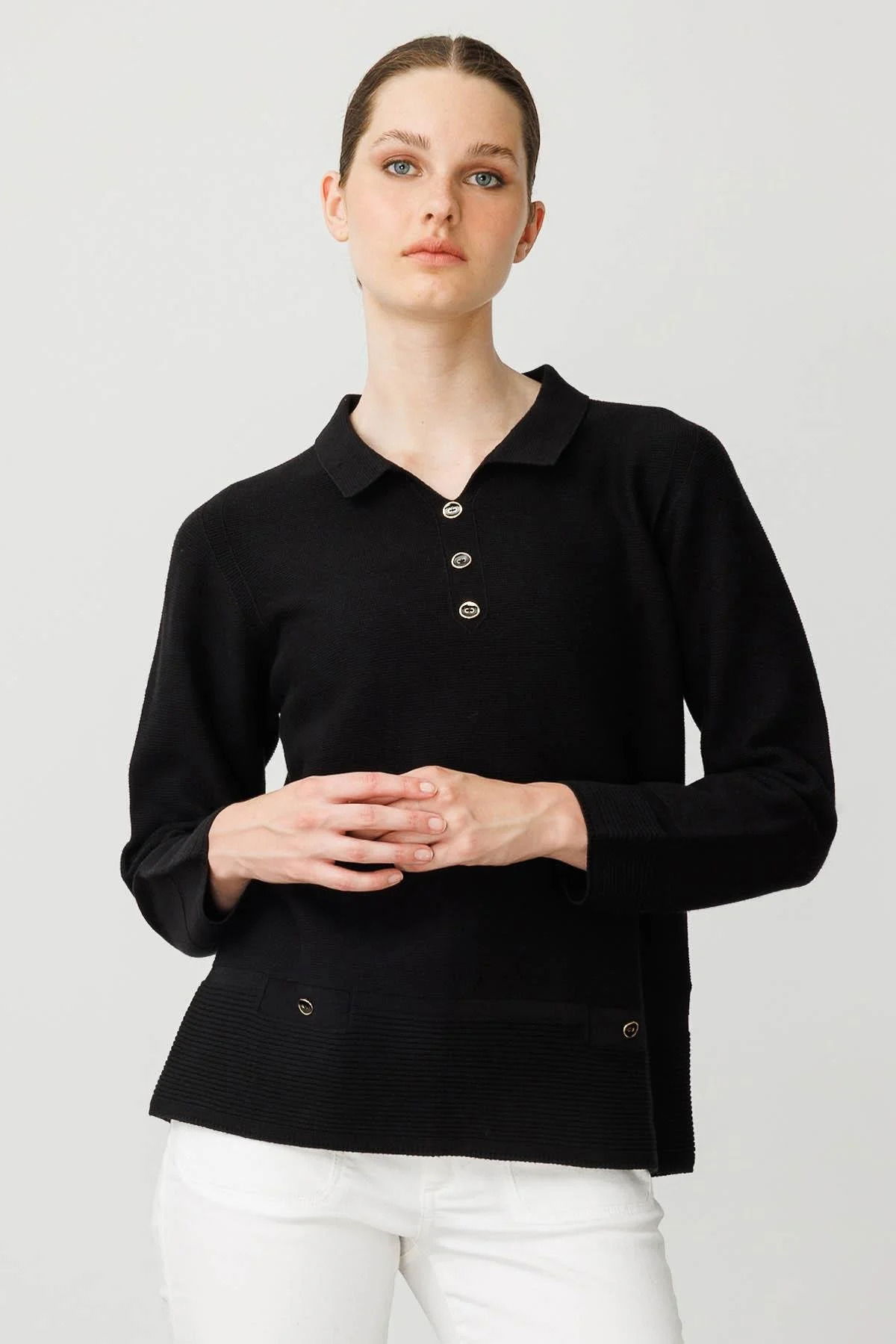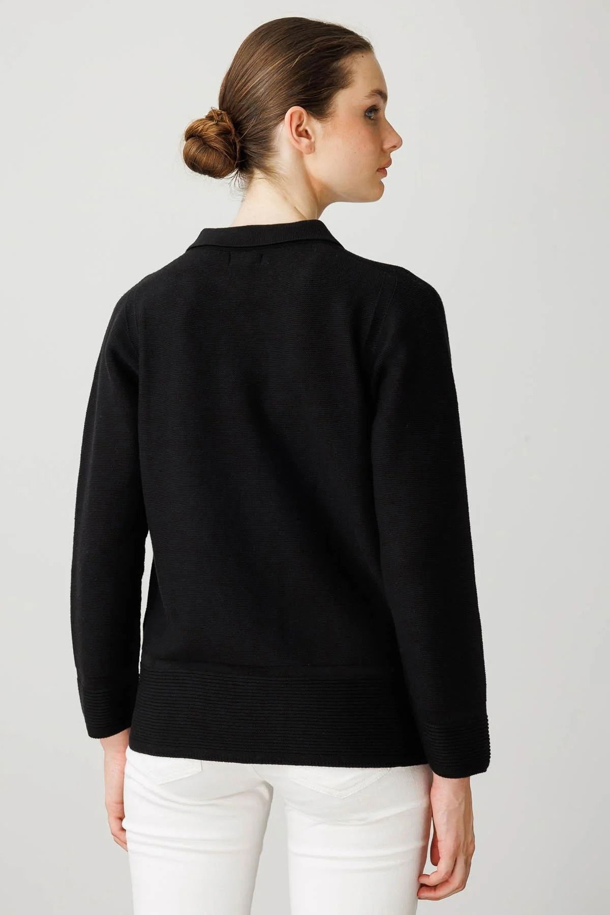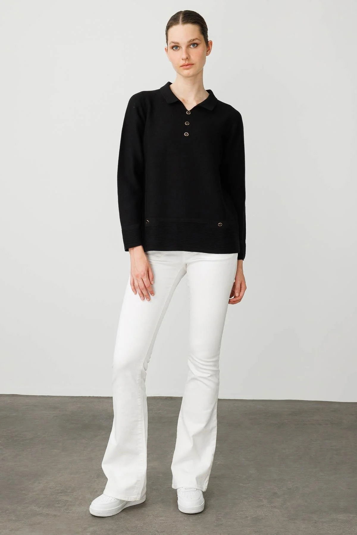 Desen Triko Kadın Polo Yaka Sahte Cepli Bluz 25243 Siyah