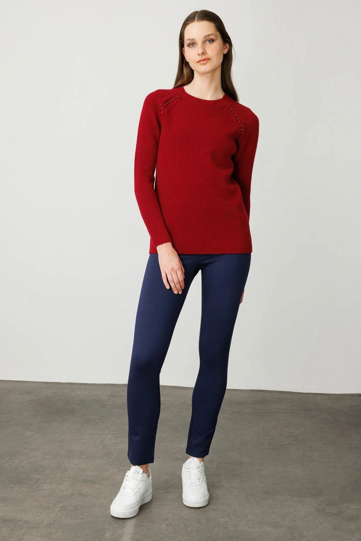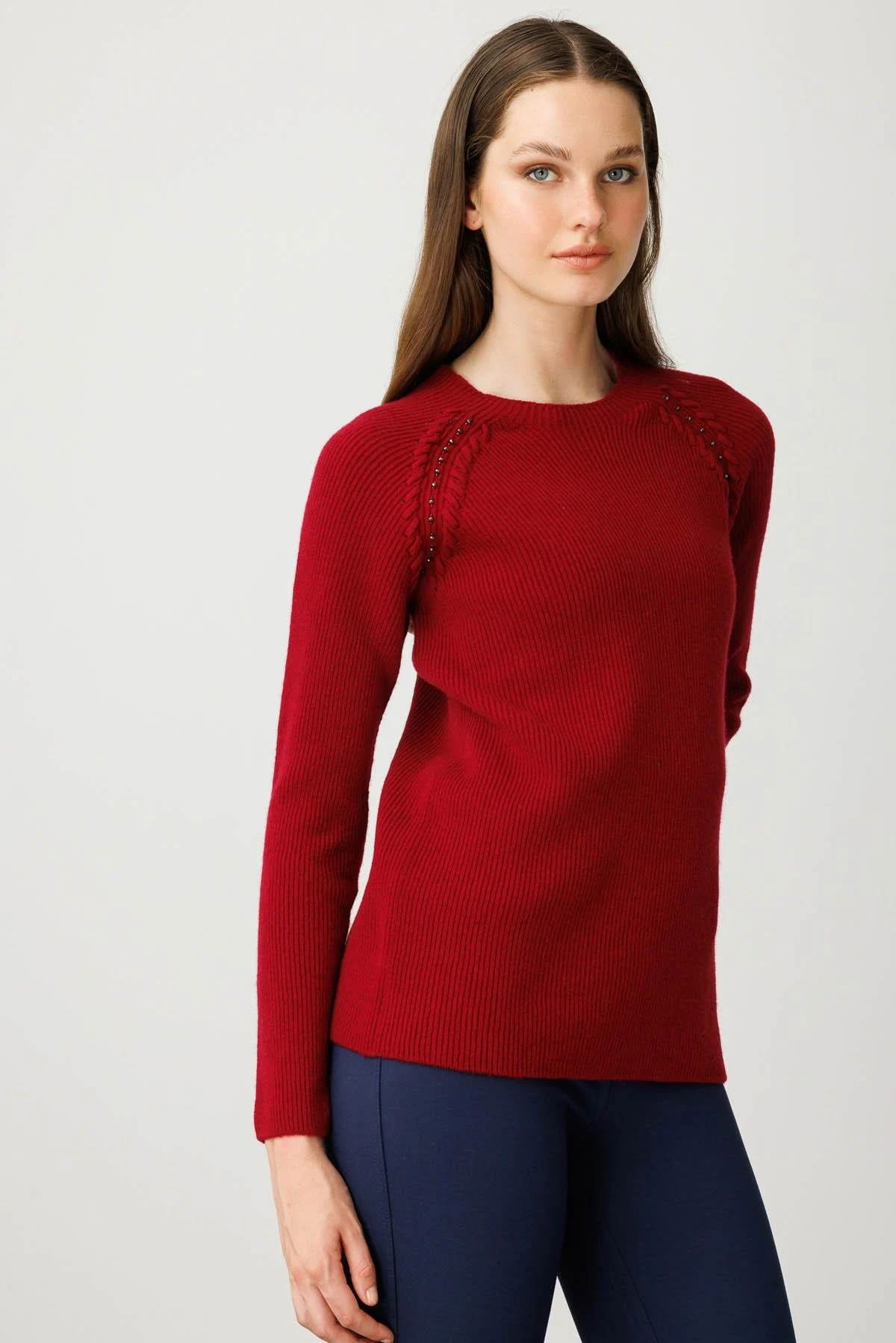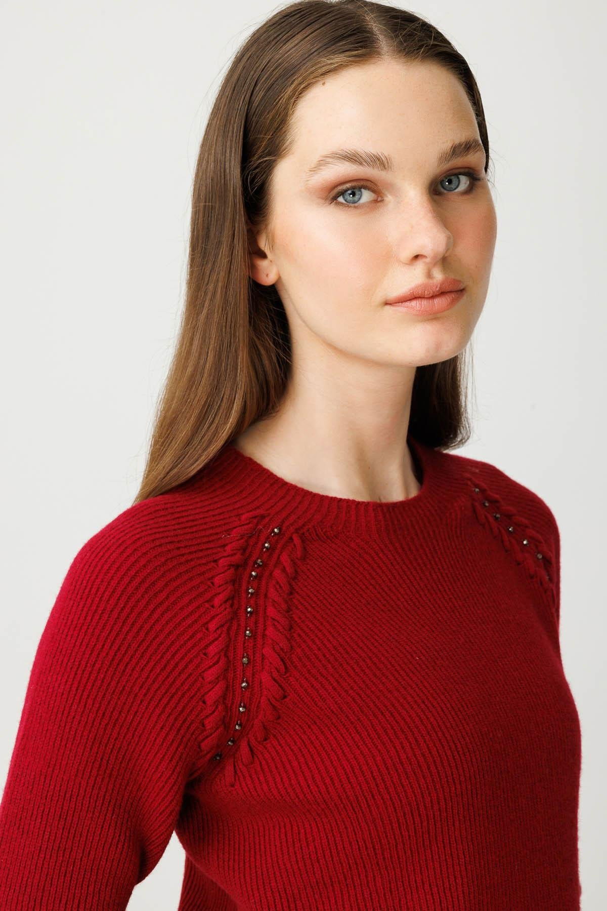 Desen Triko Kadın Sıfır Yaka Boncuklu Yün Kazak 25206 Vişne Çürüğü