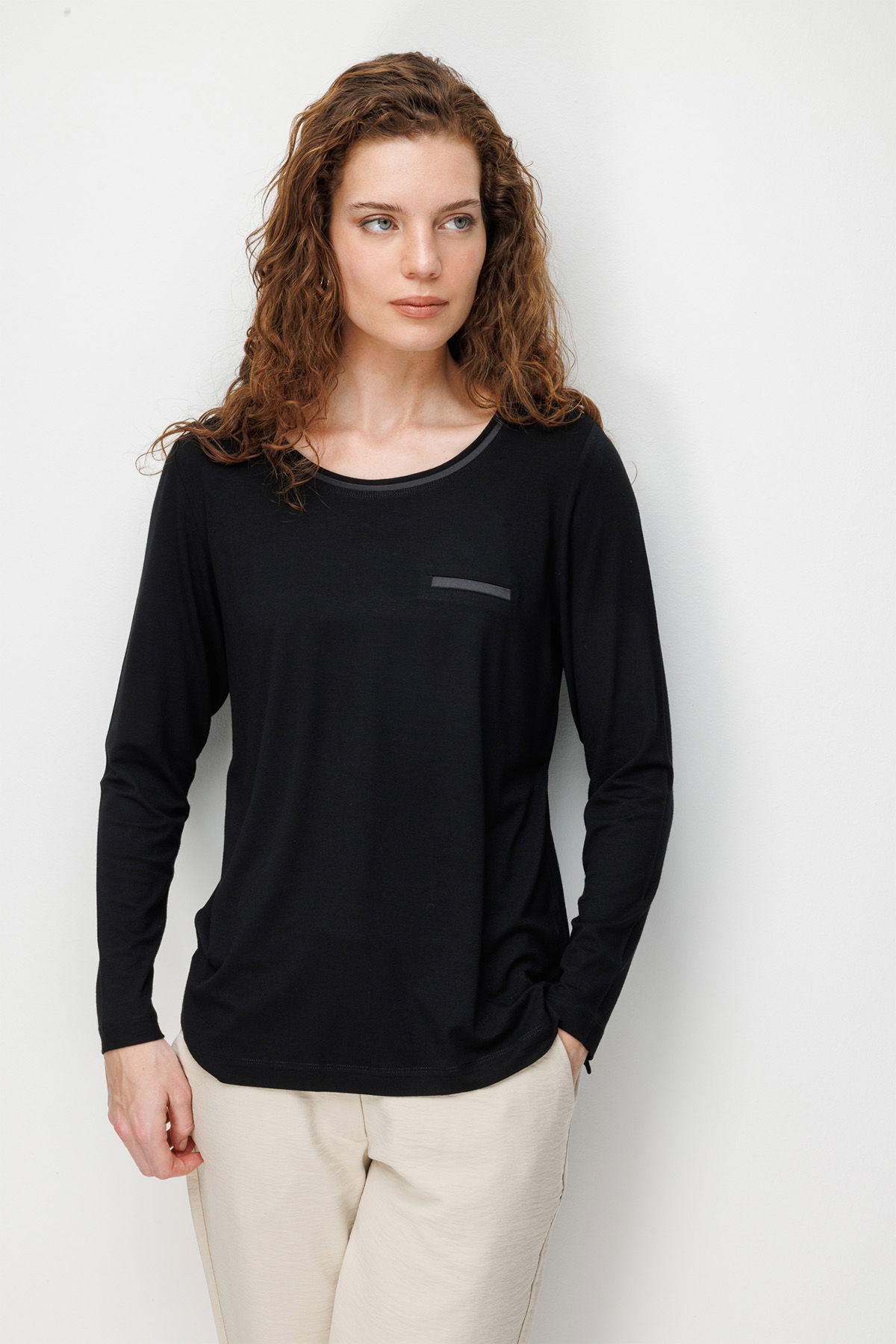 Desen Triko Kadın Sıfır Yaka Cebi Saten Şeritli Penye Bluz 26832 Siyah