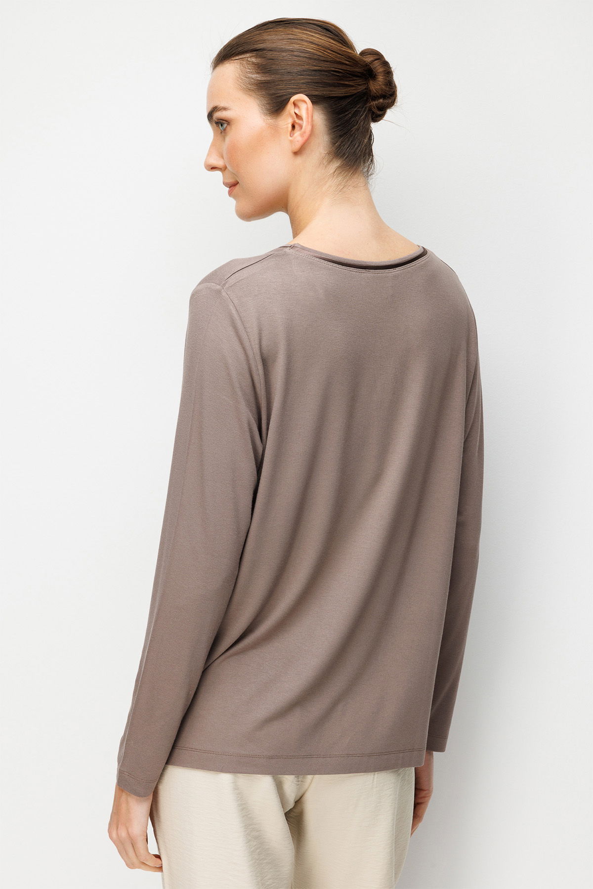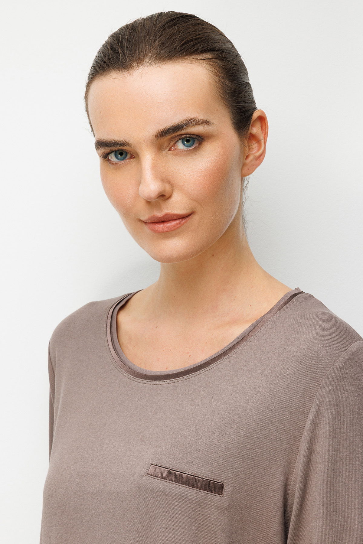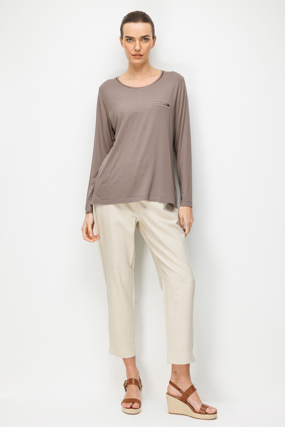 Desen Triko Kadın Sıfır Yaka Cebi Saten Şeritli Penye Bluz 26832 Vizon