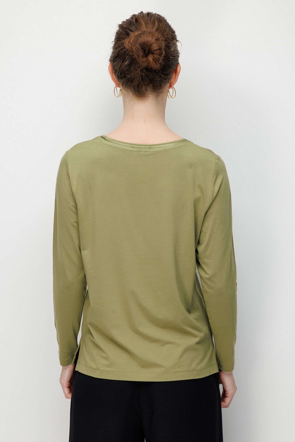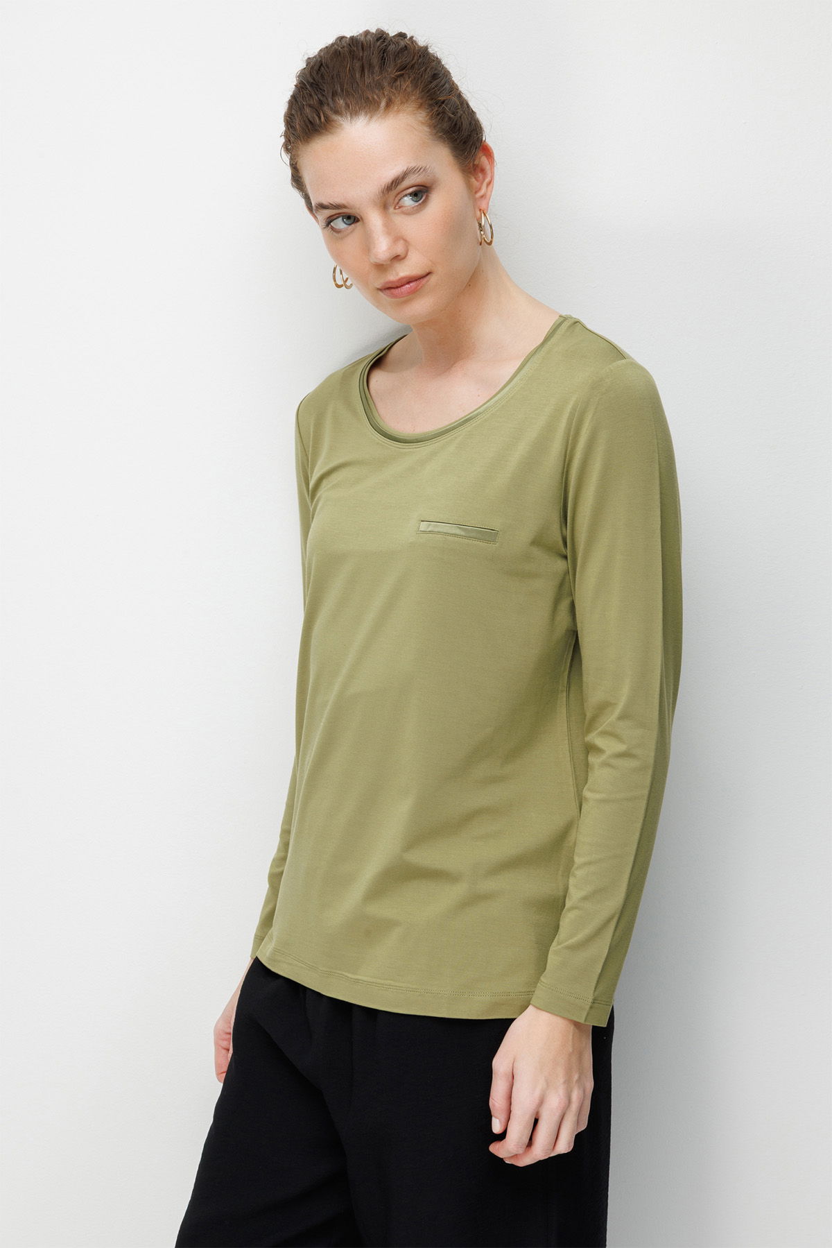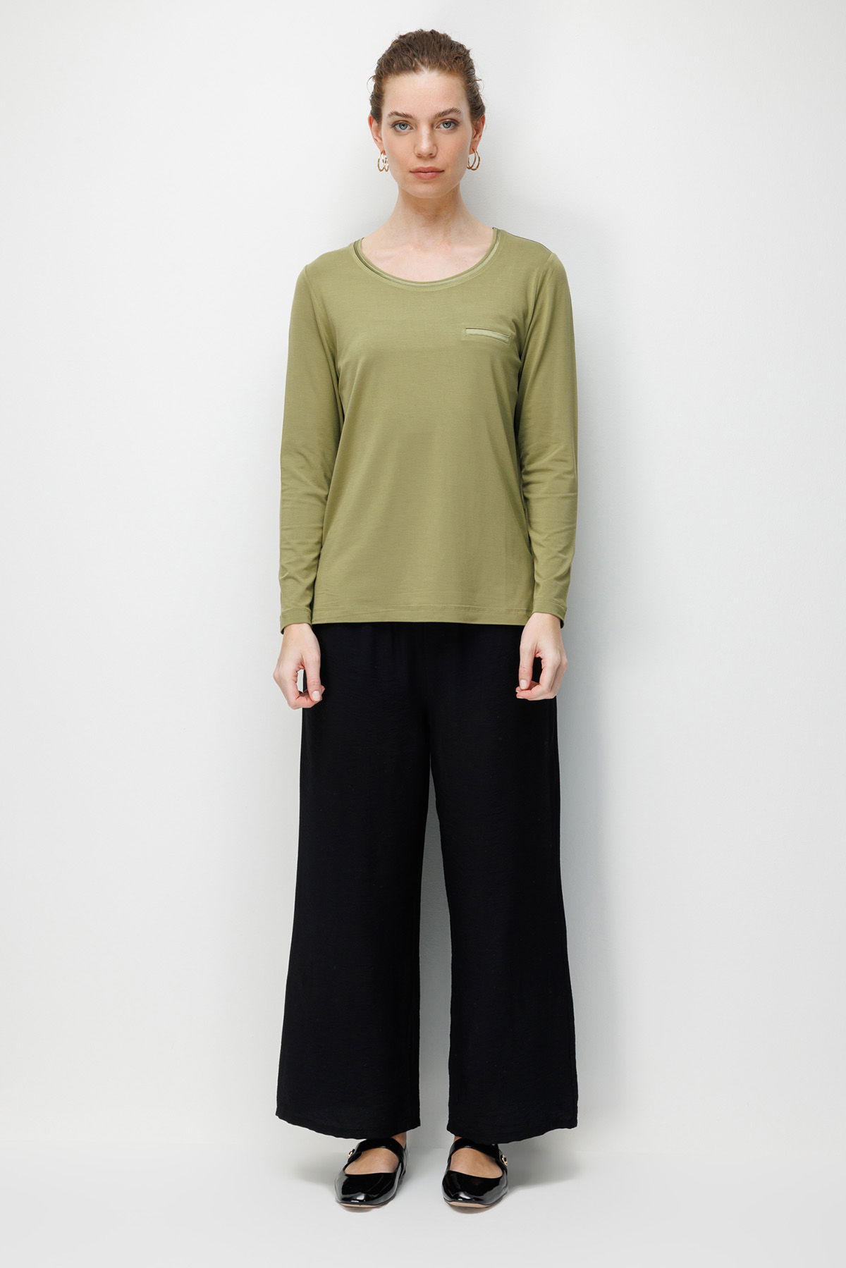 Desen Triko Kadın Sıfır Yaka Cebi Saten Şeritli Penye Bluz 26832 Yeşil