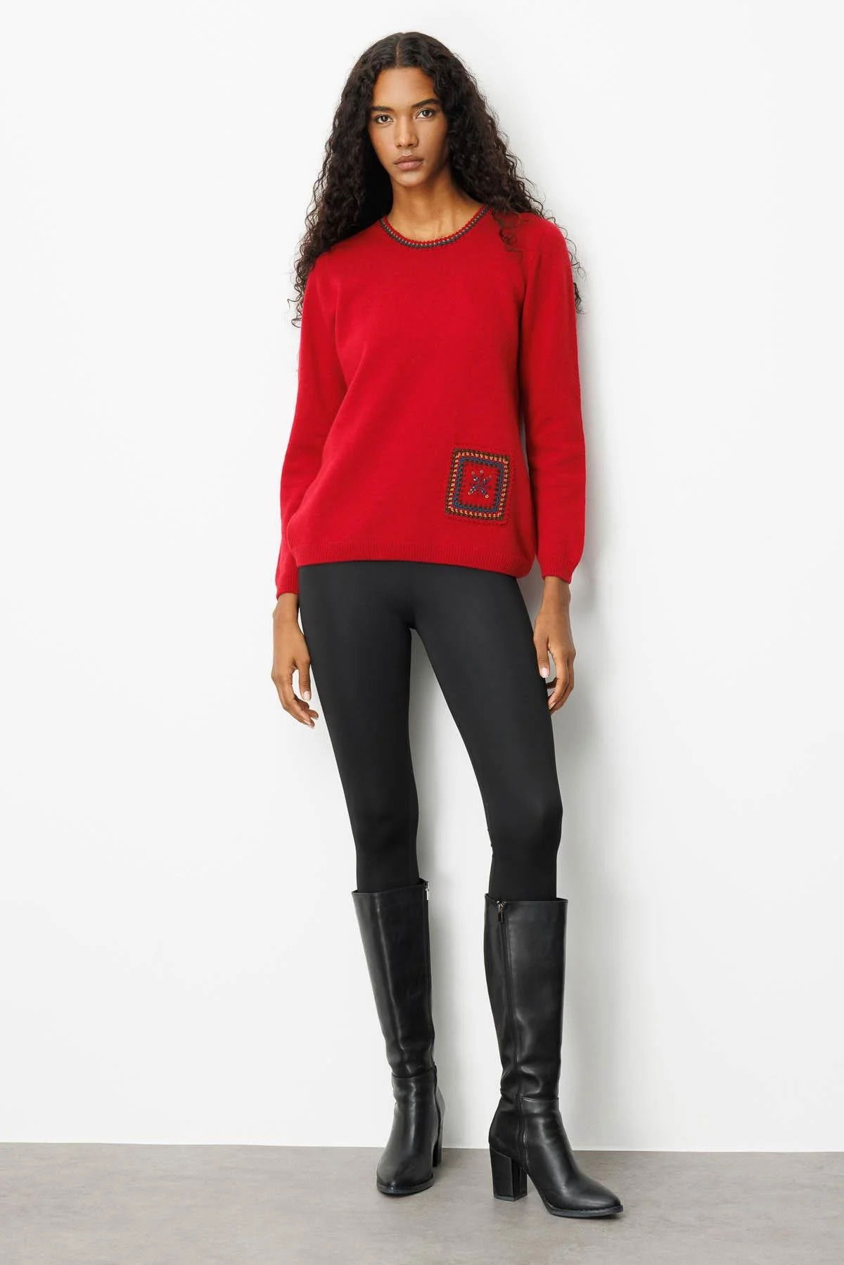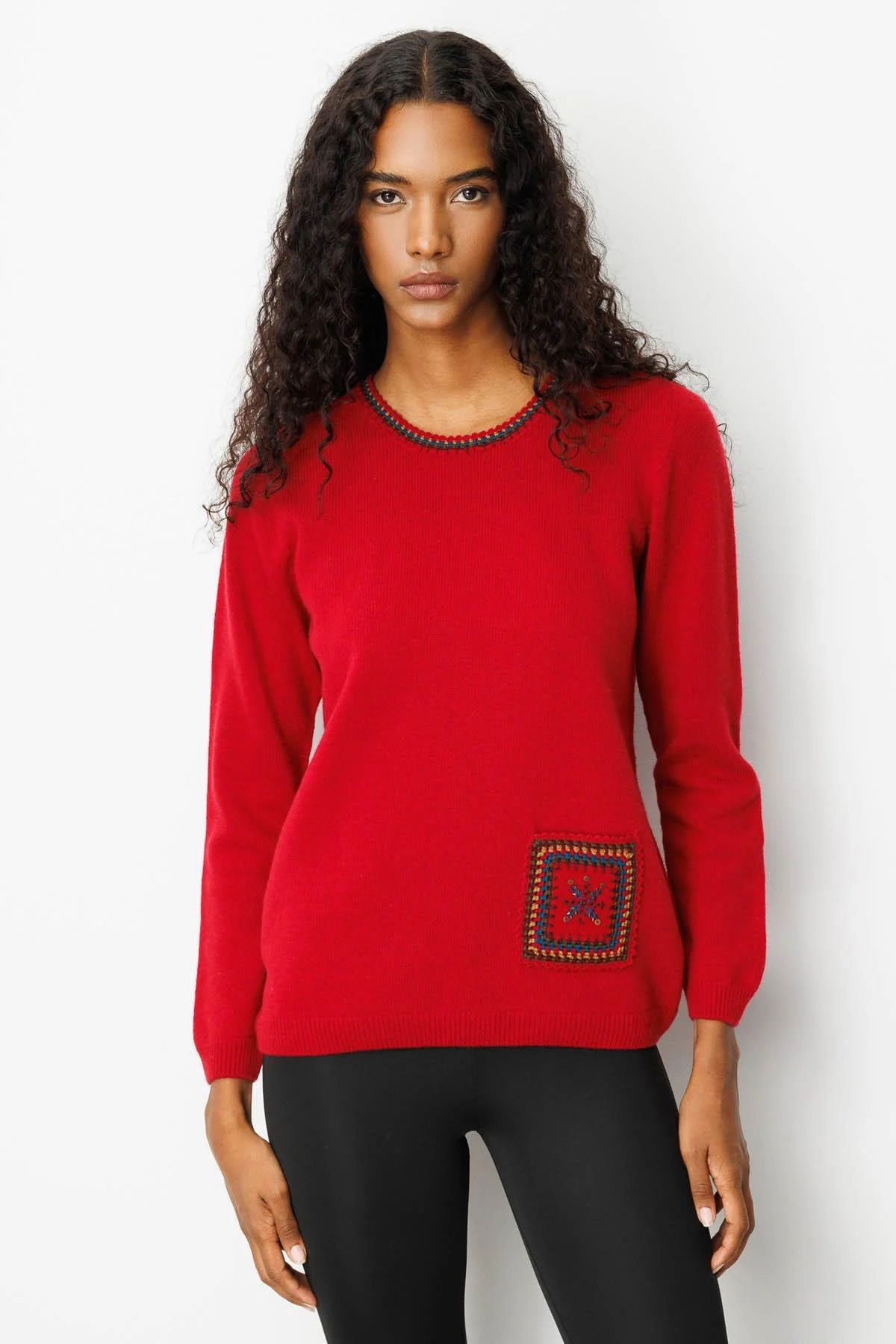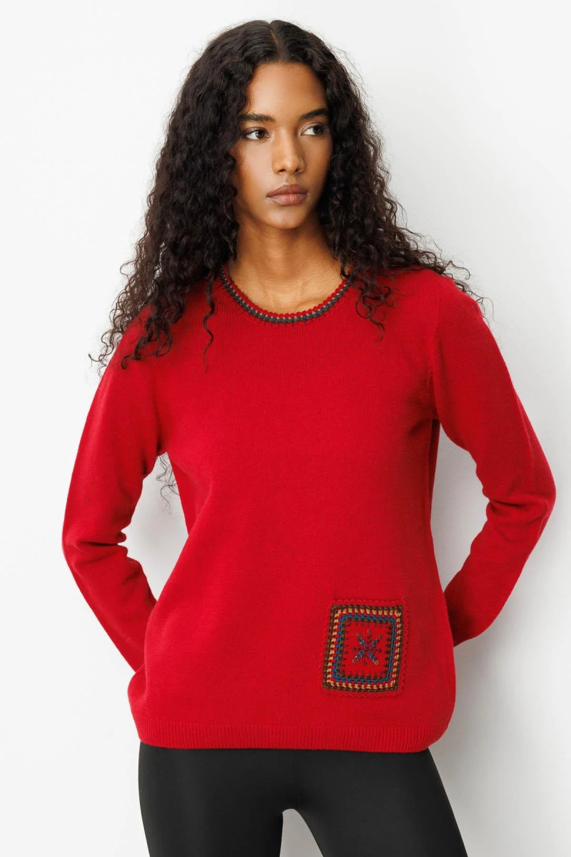 Desen Triko Kadın Sıfır Yaka Cebi ve Yakası Tığlamalı Yün Kazak 25201 K.Kırmızı