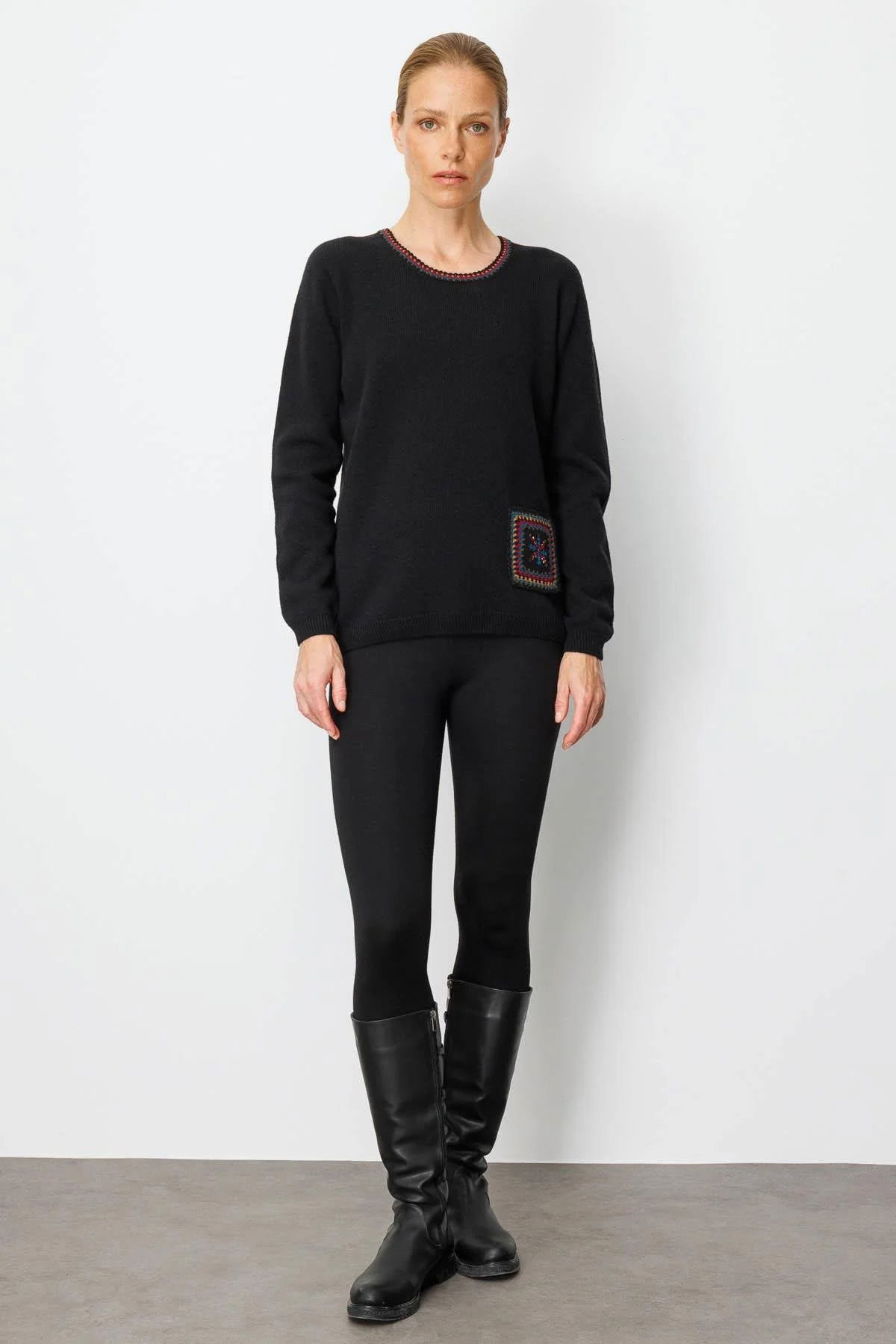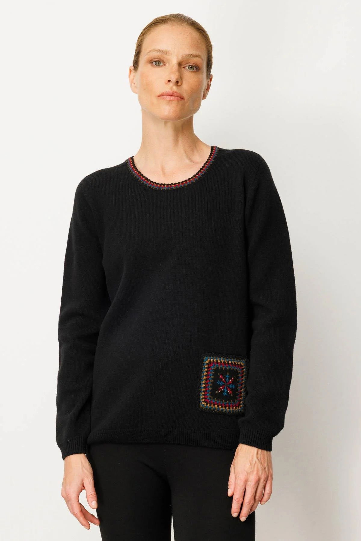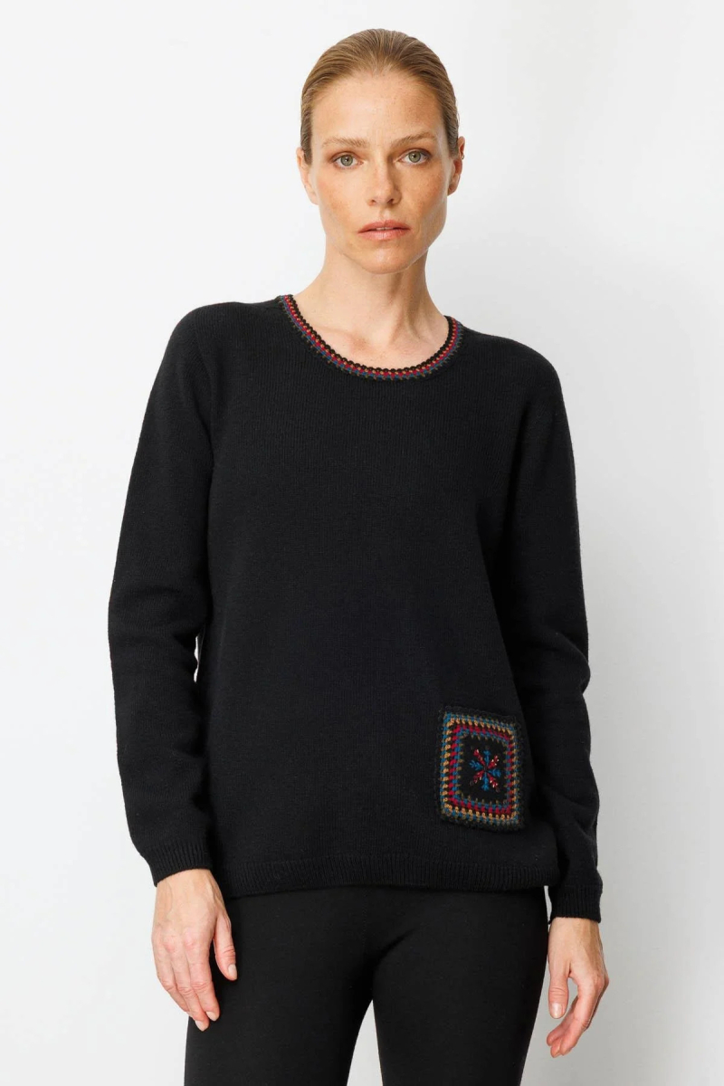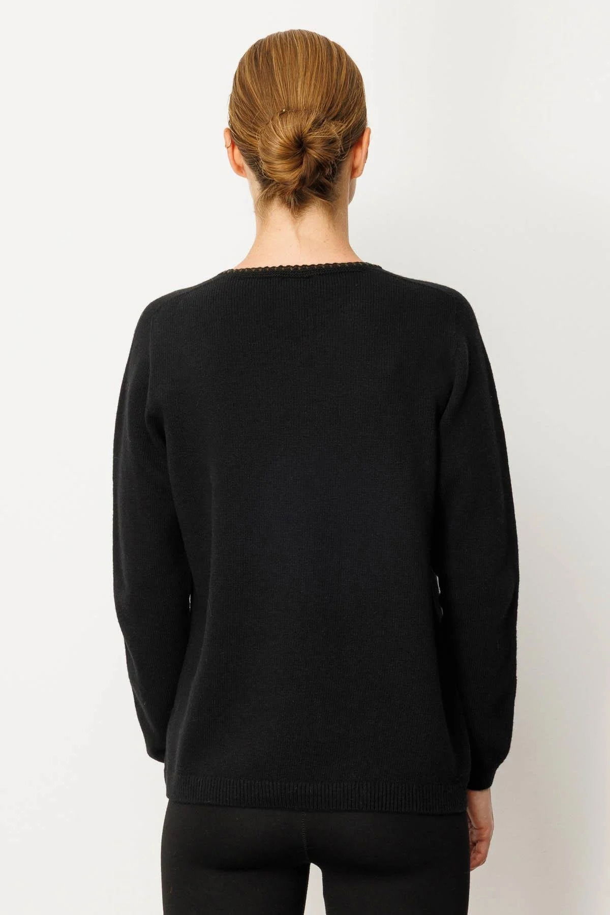 Desen Triko Kadın Sıfır Yaka Cebi ve Yakası Tığlamalı Yün Kazak 25201 Siyah
