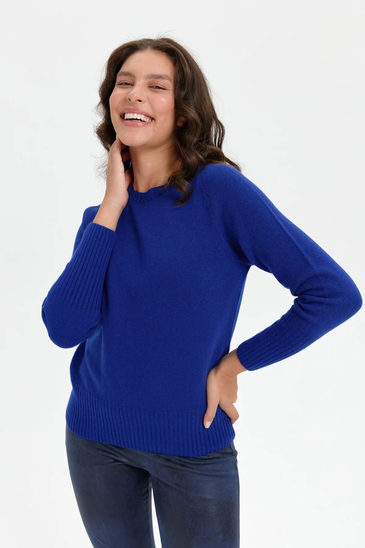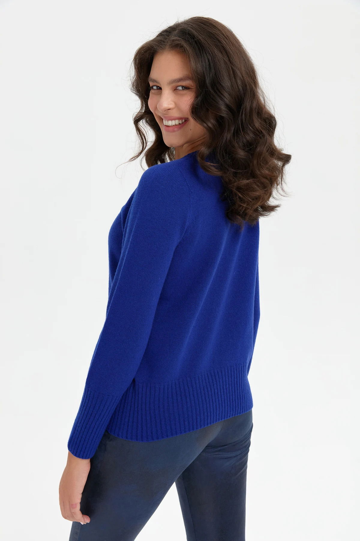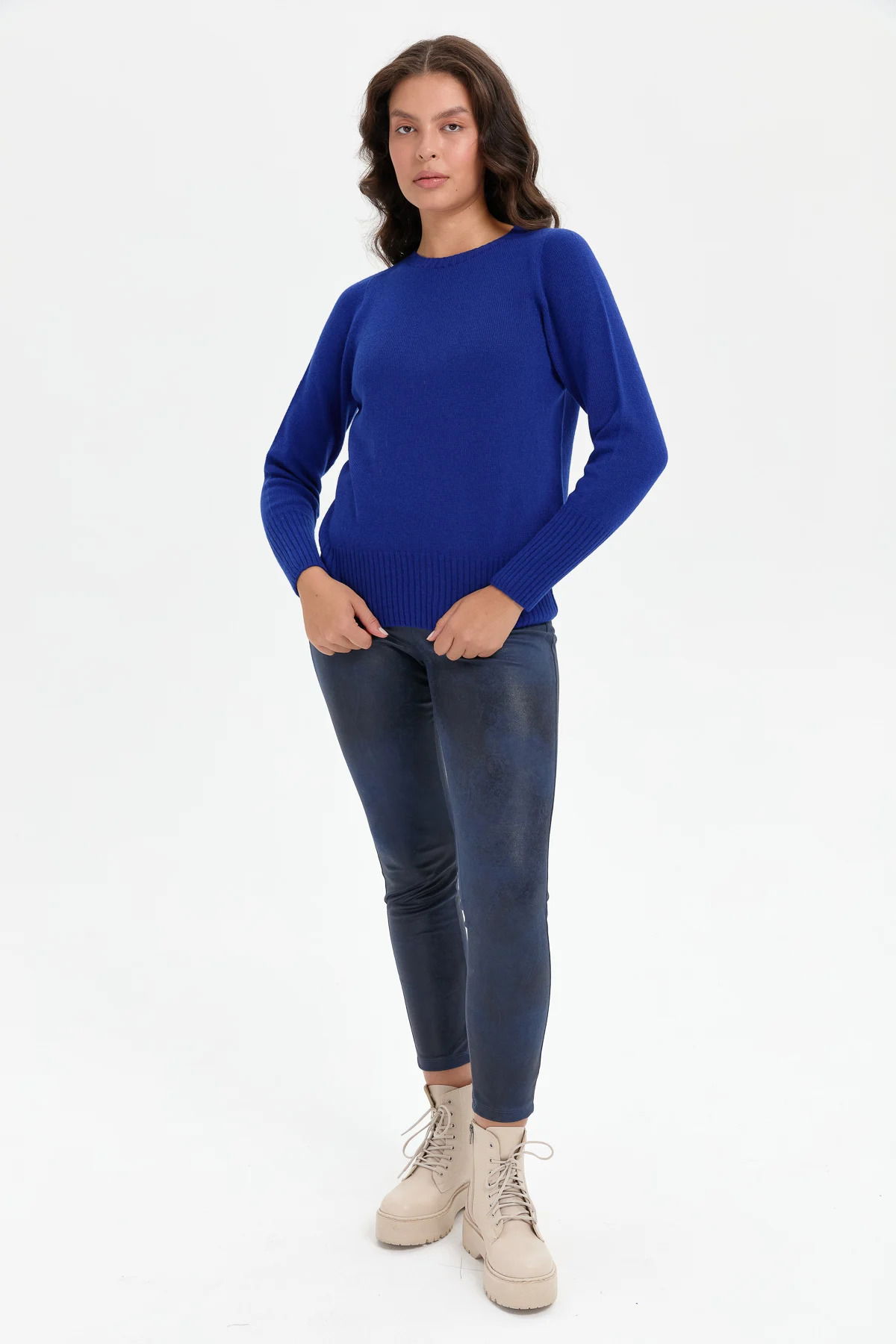 Desen Triko Kadın Sıfır Yaka Dikişsiz Eteği ve Kolu Uzun Lastik Yün Kazak 24210 K.S. Mavi