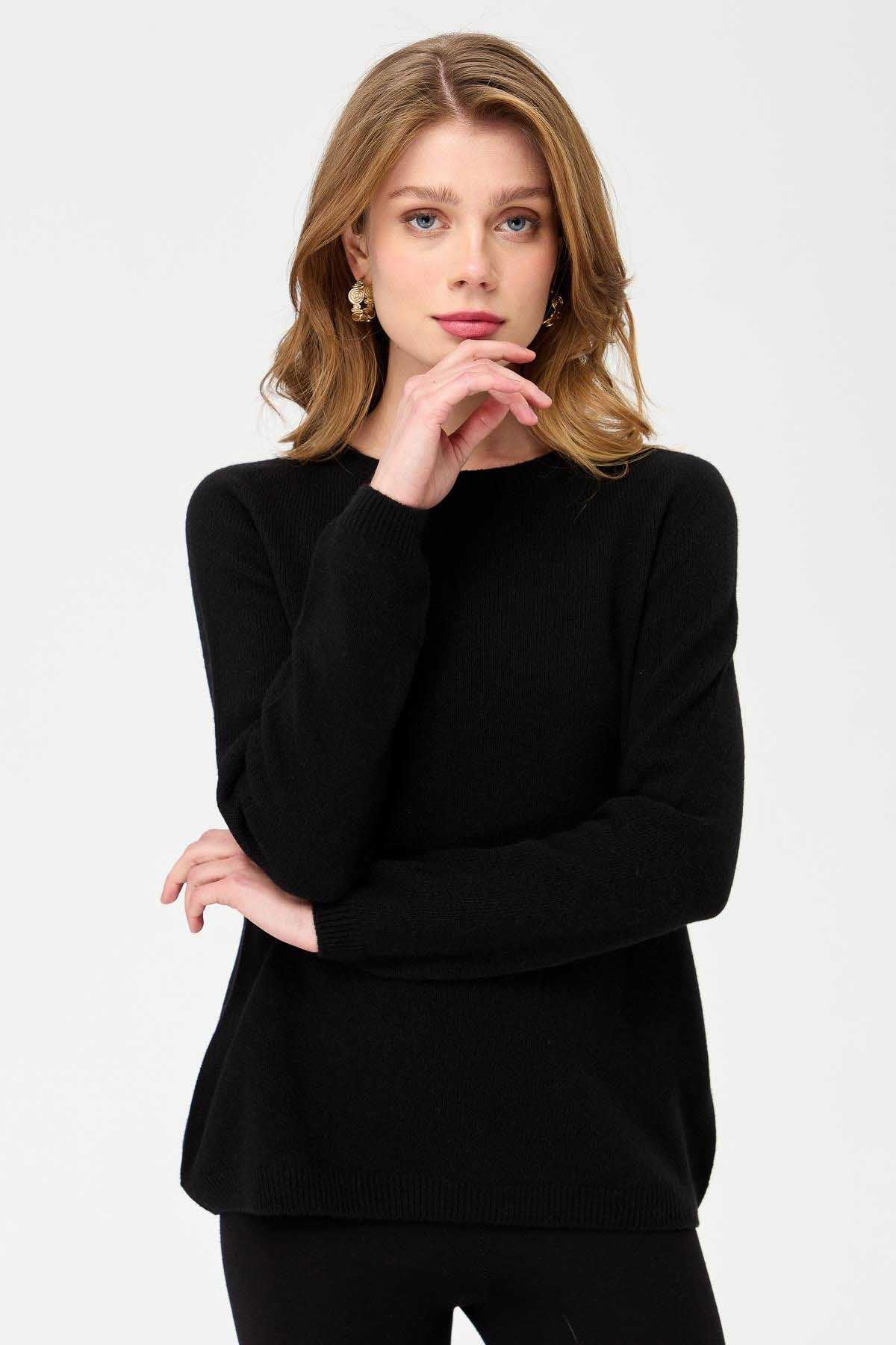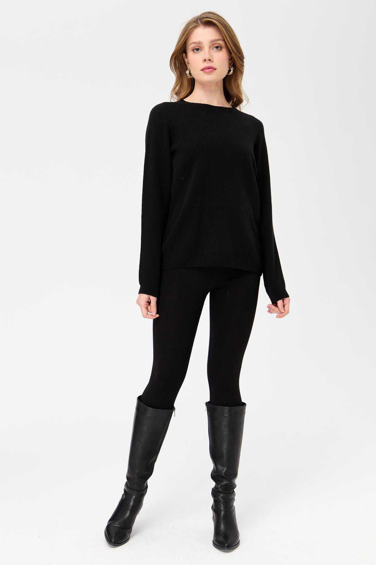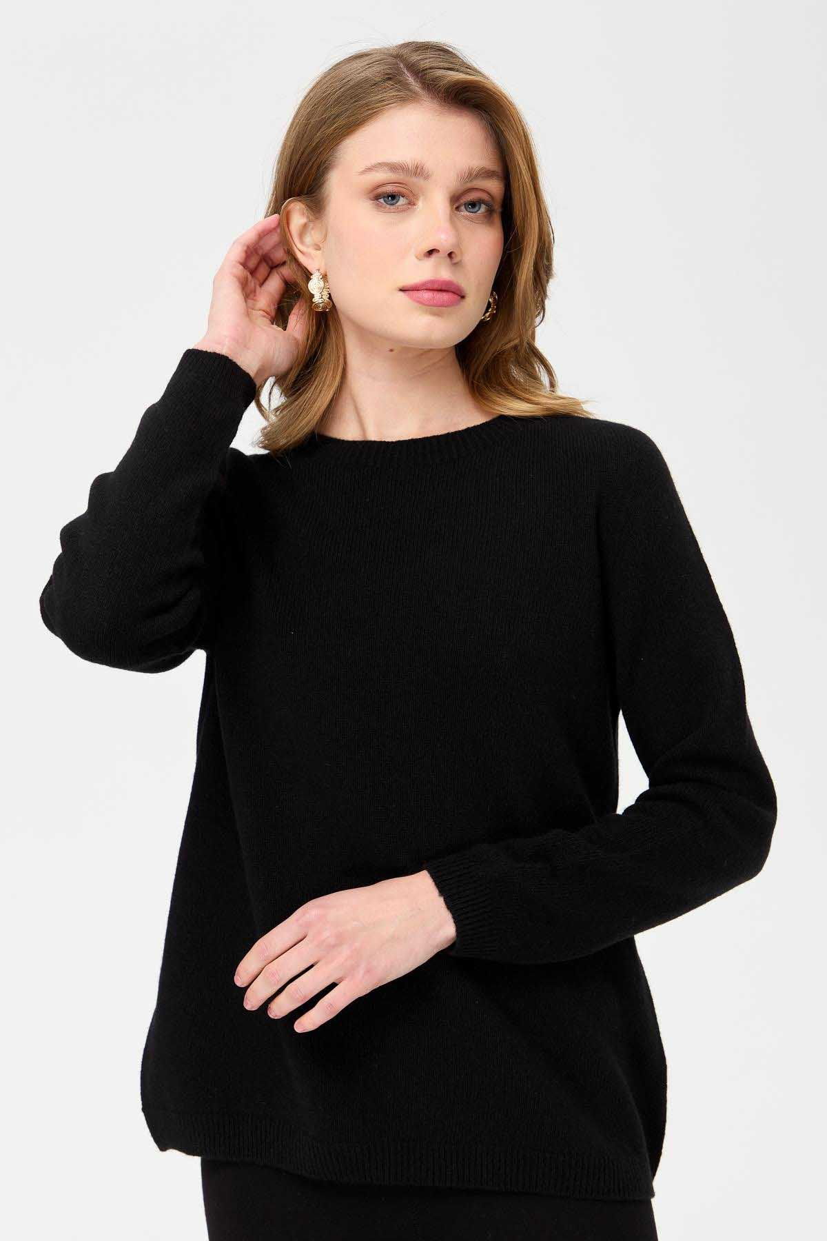 Desen Triko Kadın Sıfır Yaka Klasik Yün Kazak 23163 Siyah