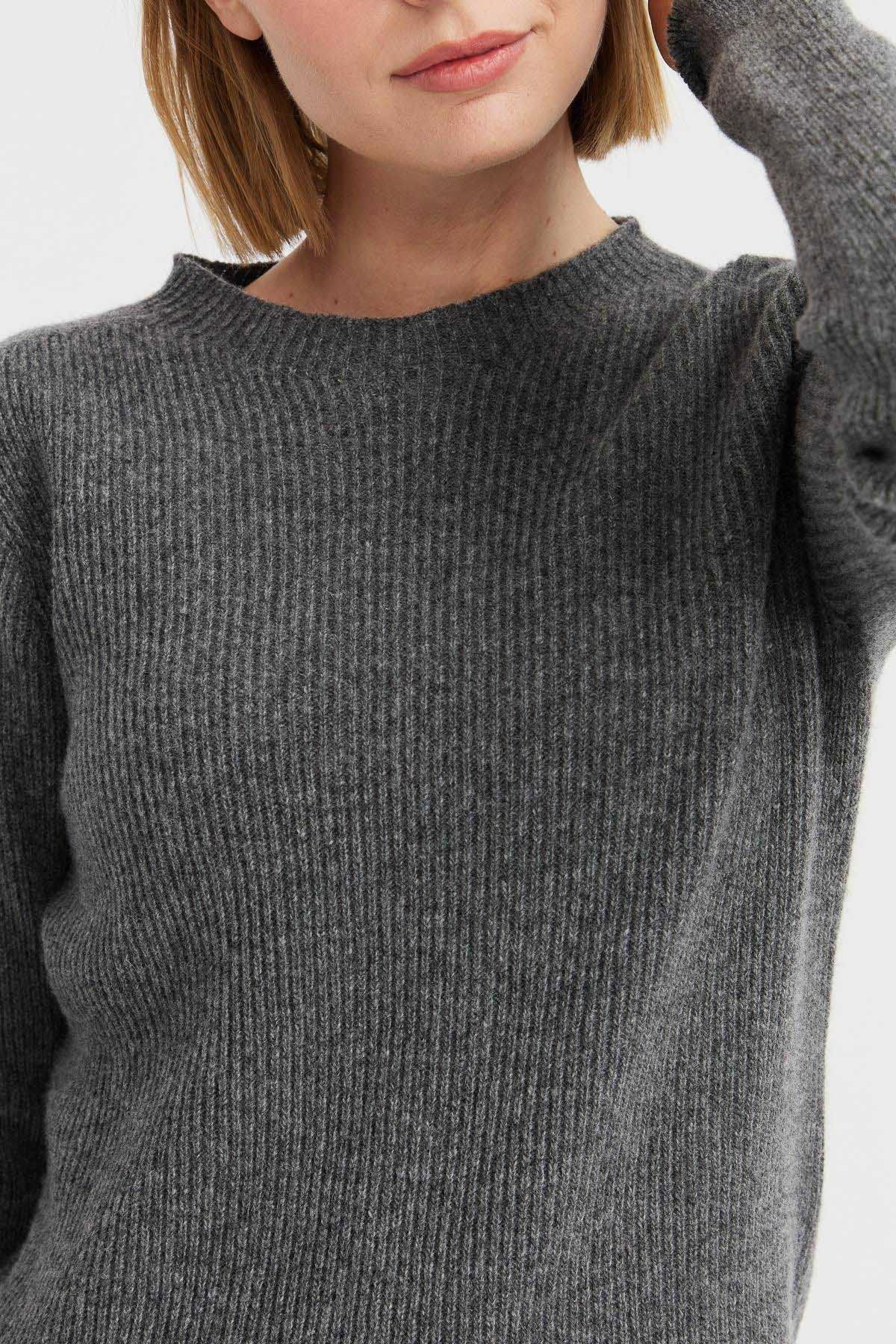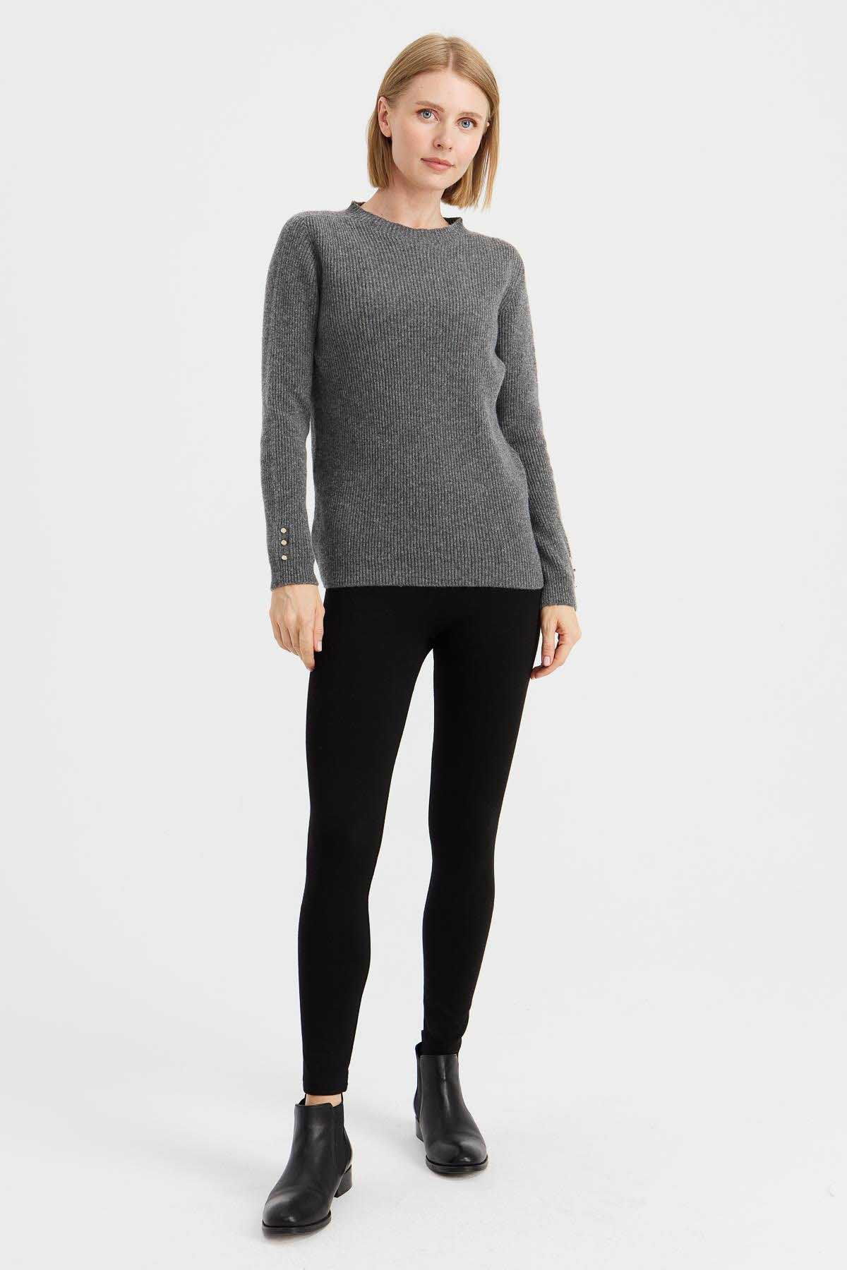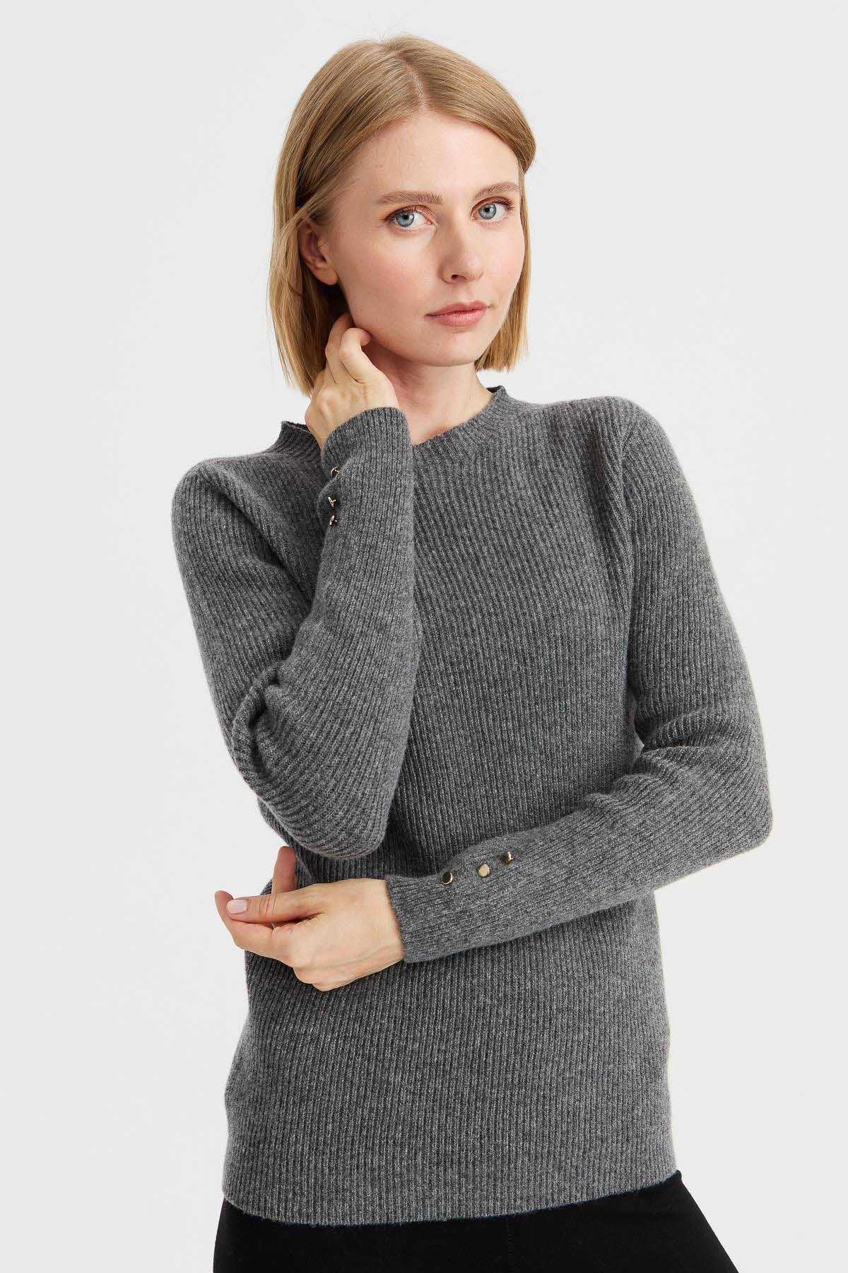 Desen Triko Kadın Sıfır Yaka Kol Ucu Düğmeli Yün Kazak 23158 Füme