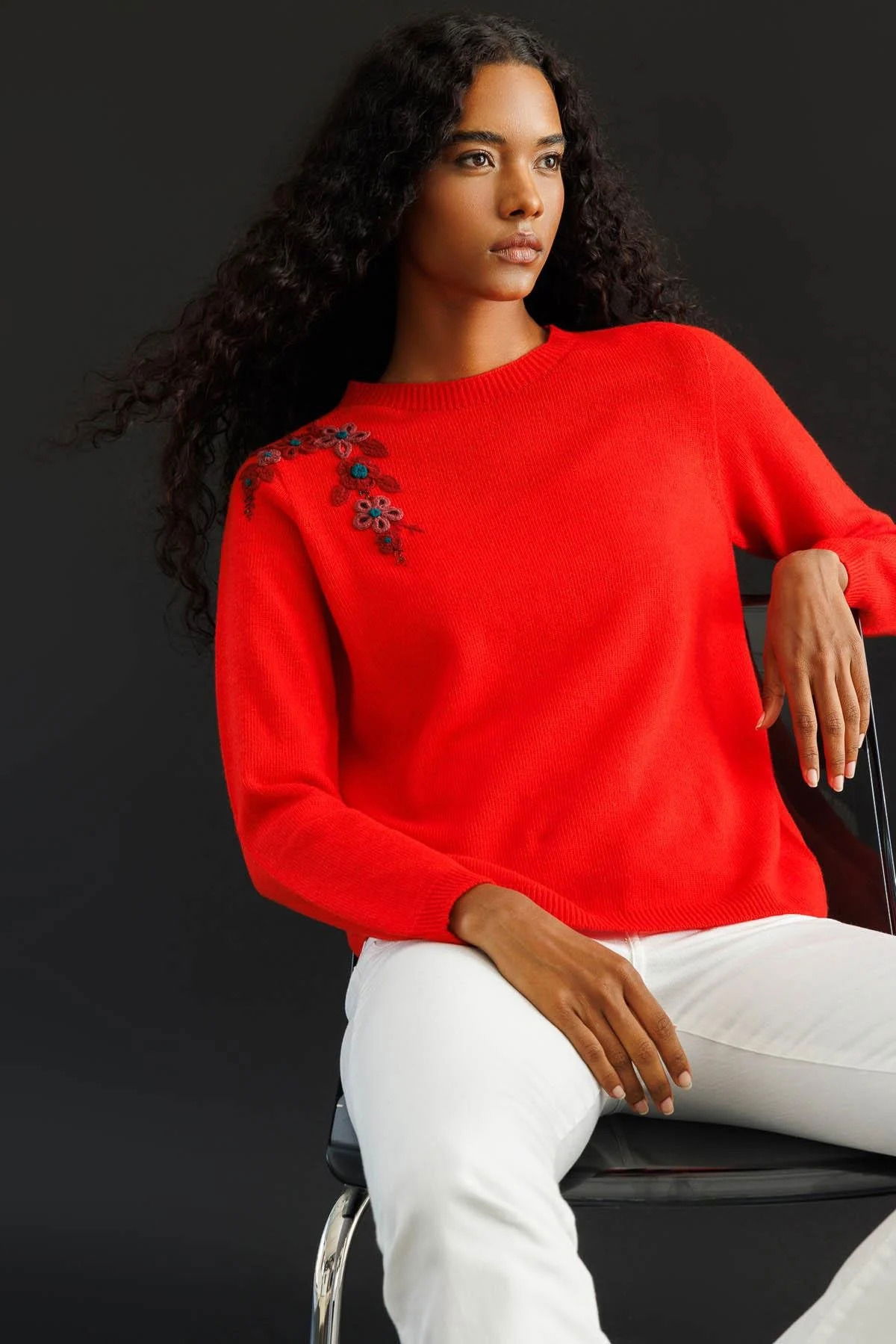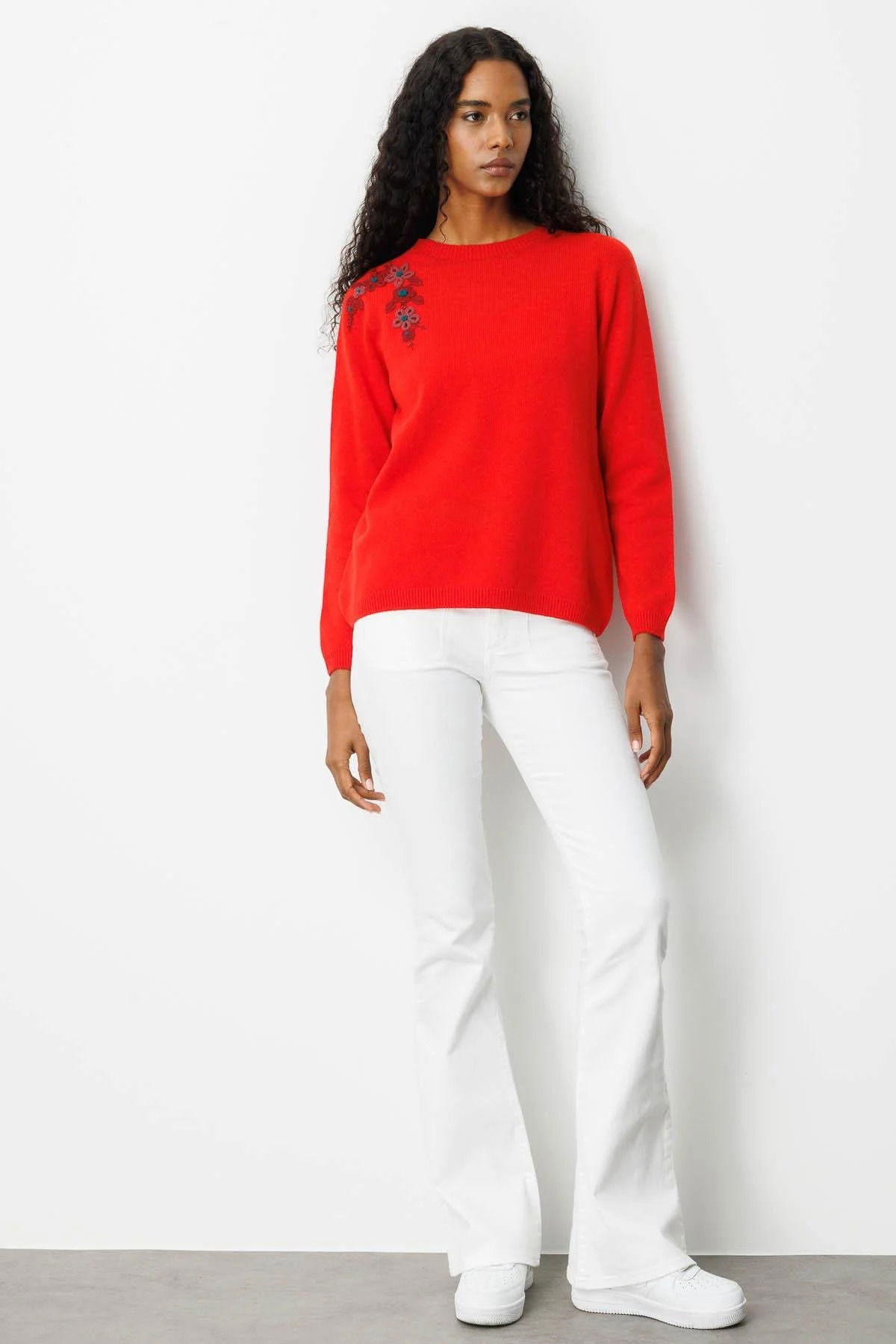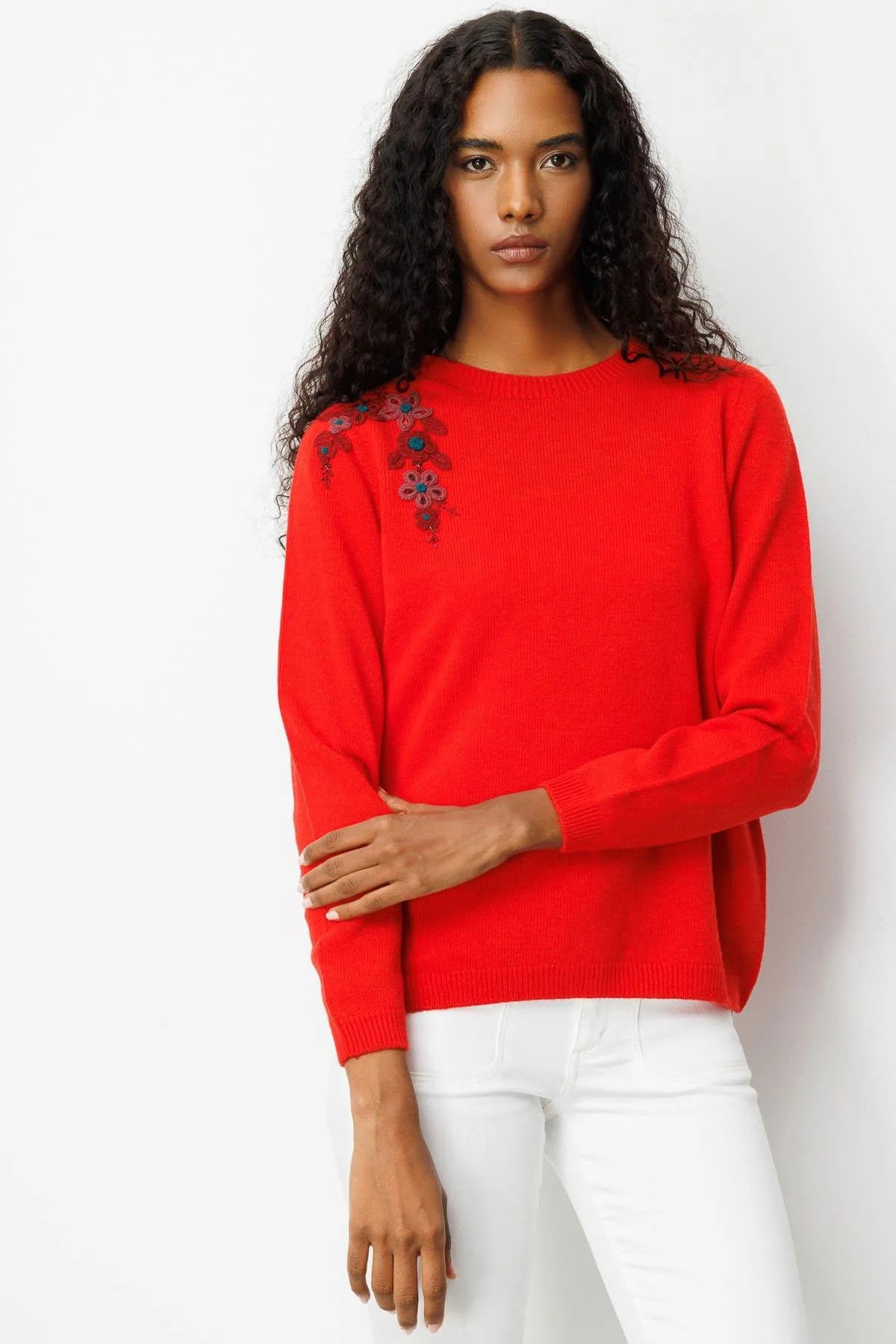 Desen Triko Kadın Sıfır Yaka Omzu İşlemeli Yün Kazak 25204 Mercan