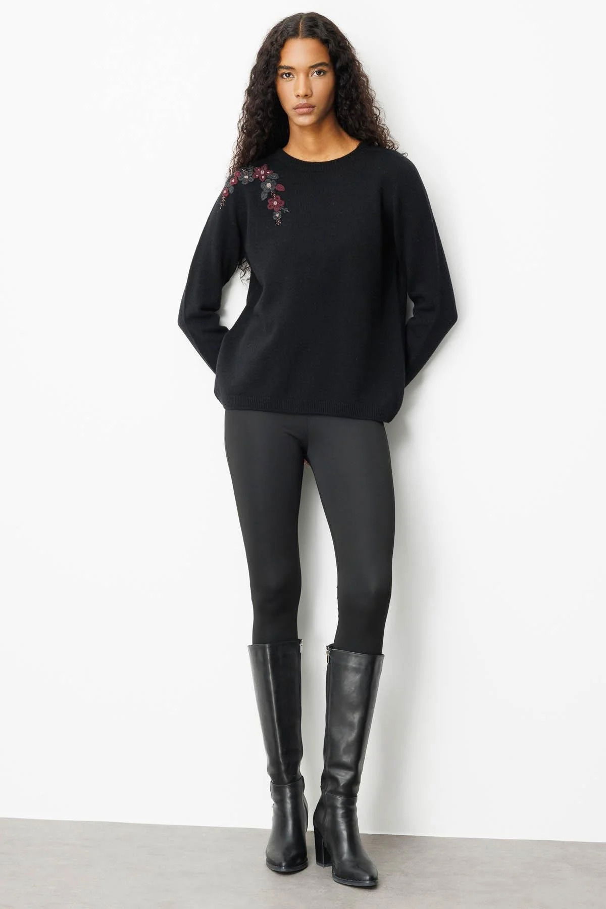Desen Triko Kadın Sıfır Yaka Omzu İşlemeli Yün Kazak 25204 Siyah