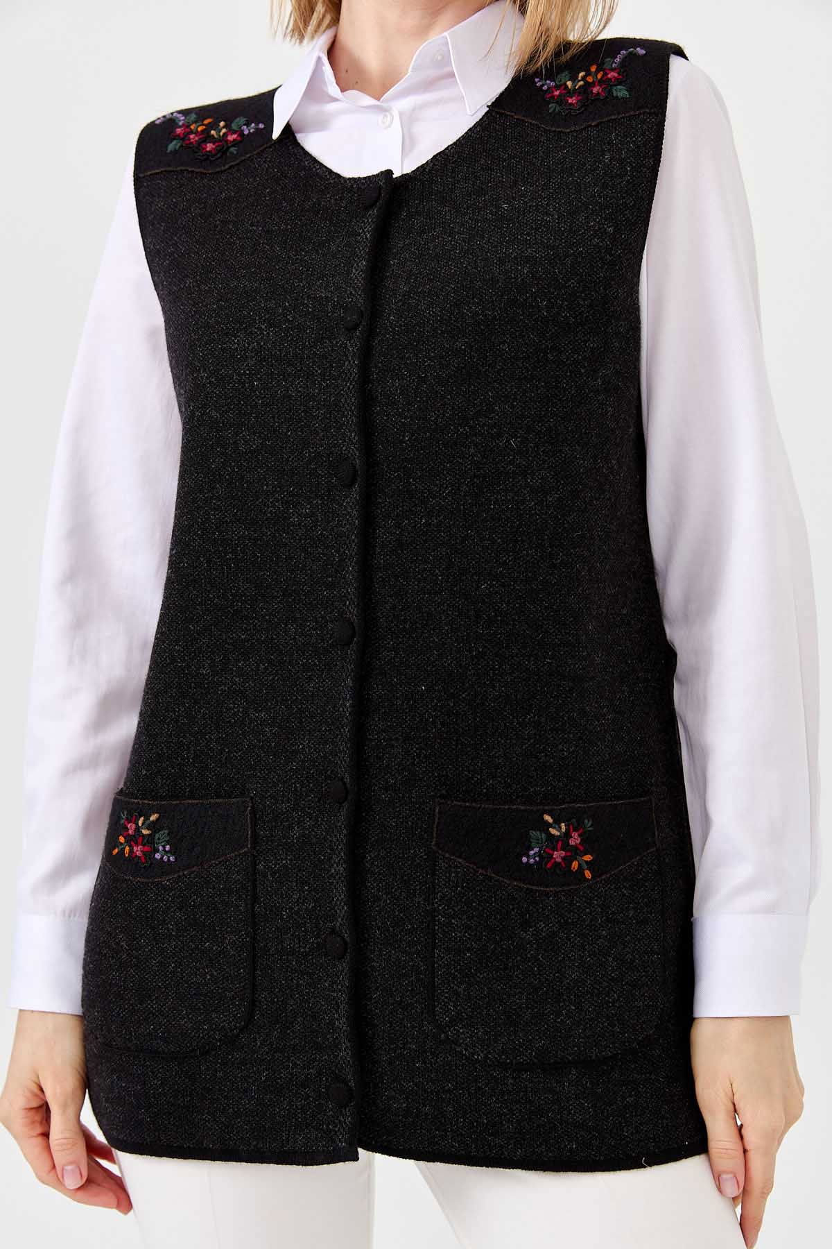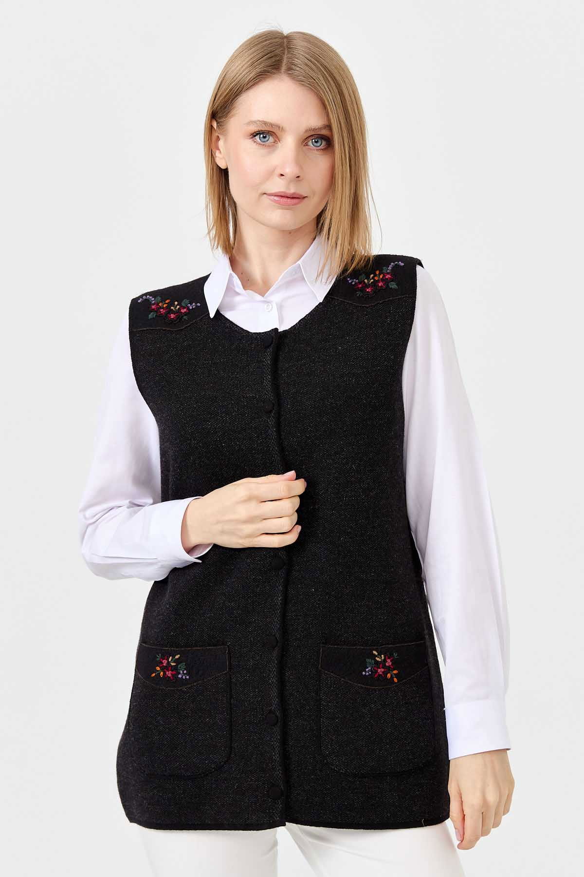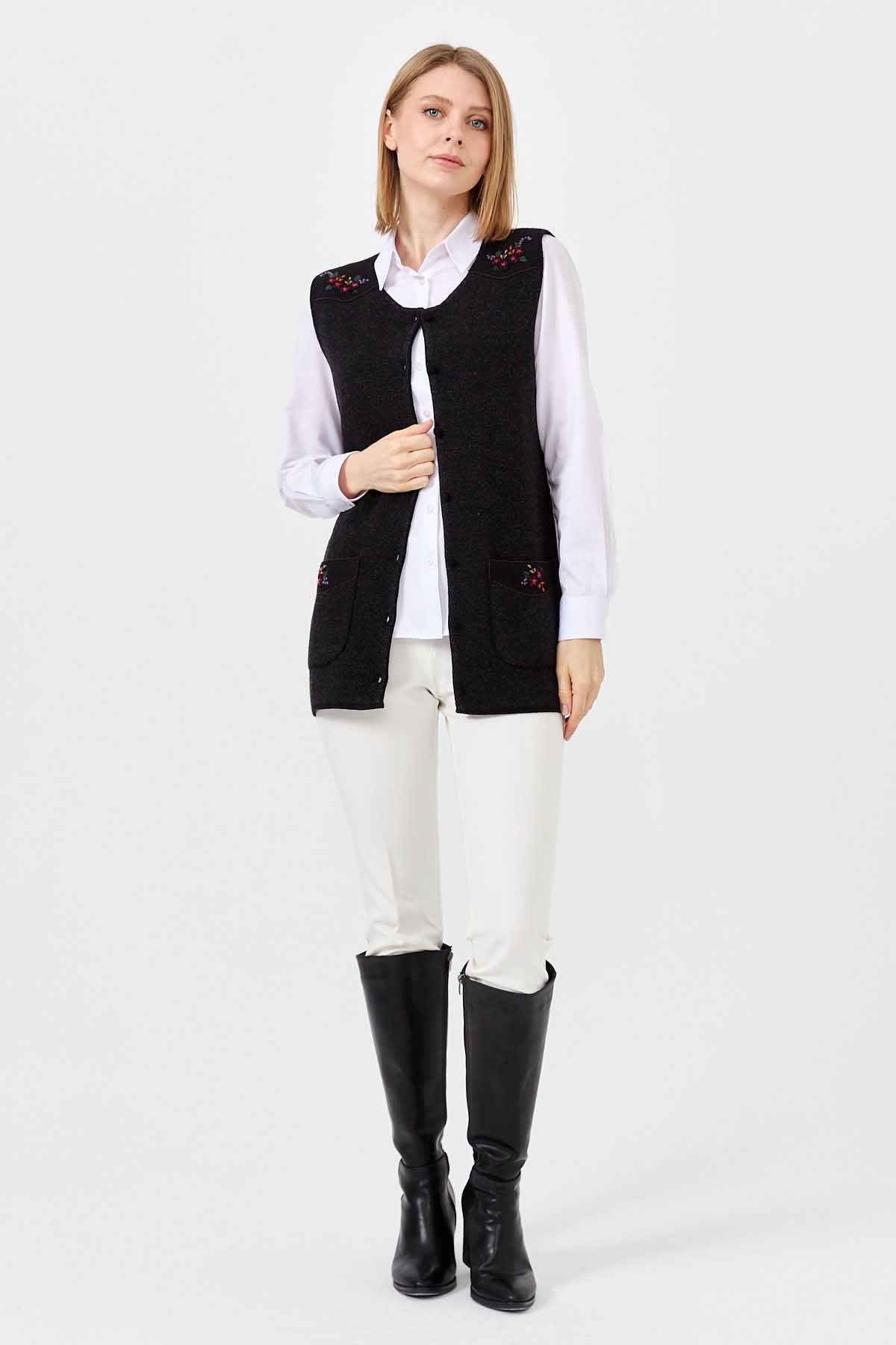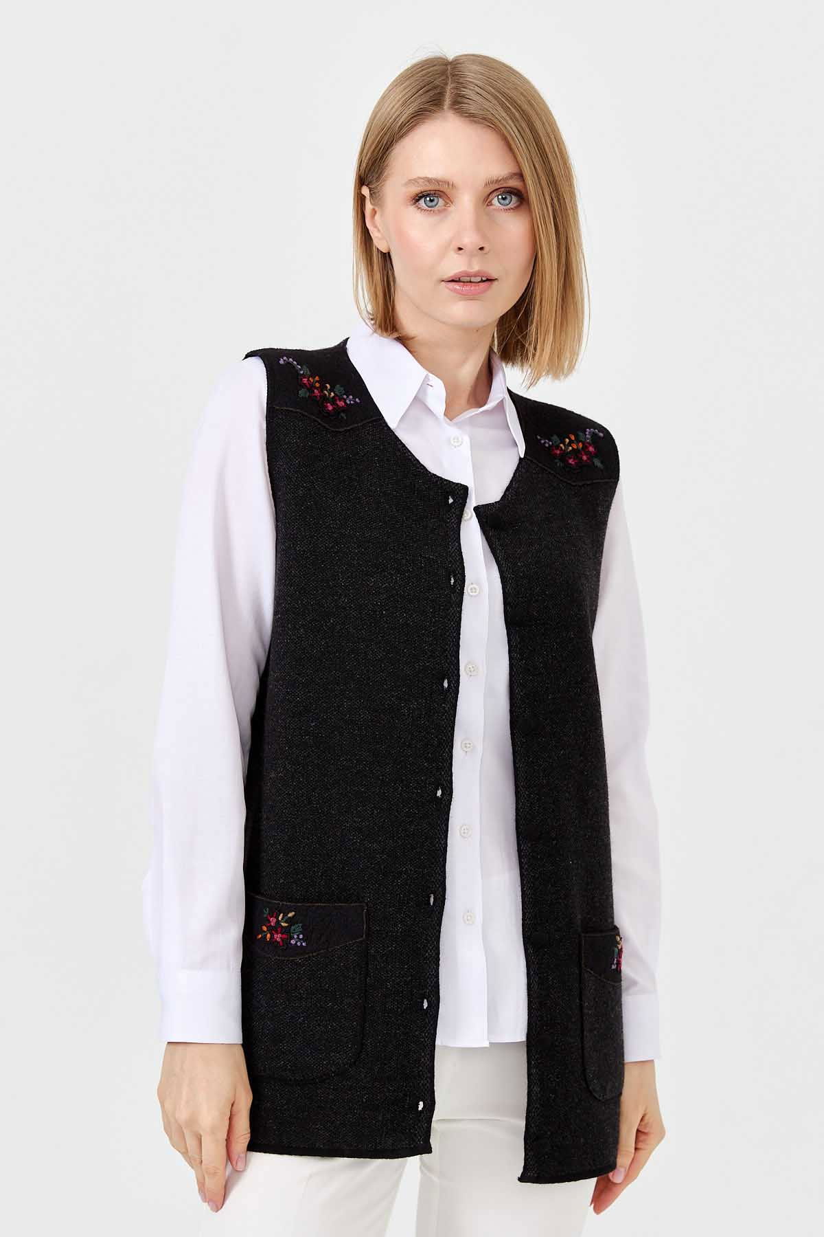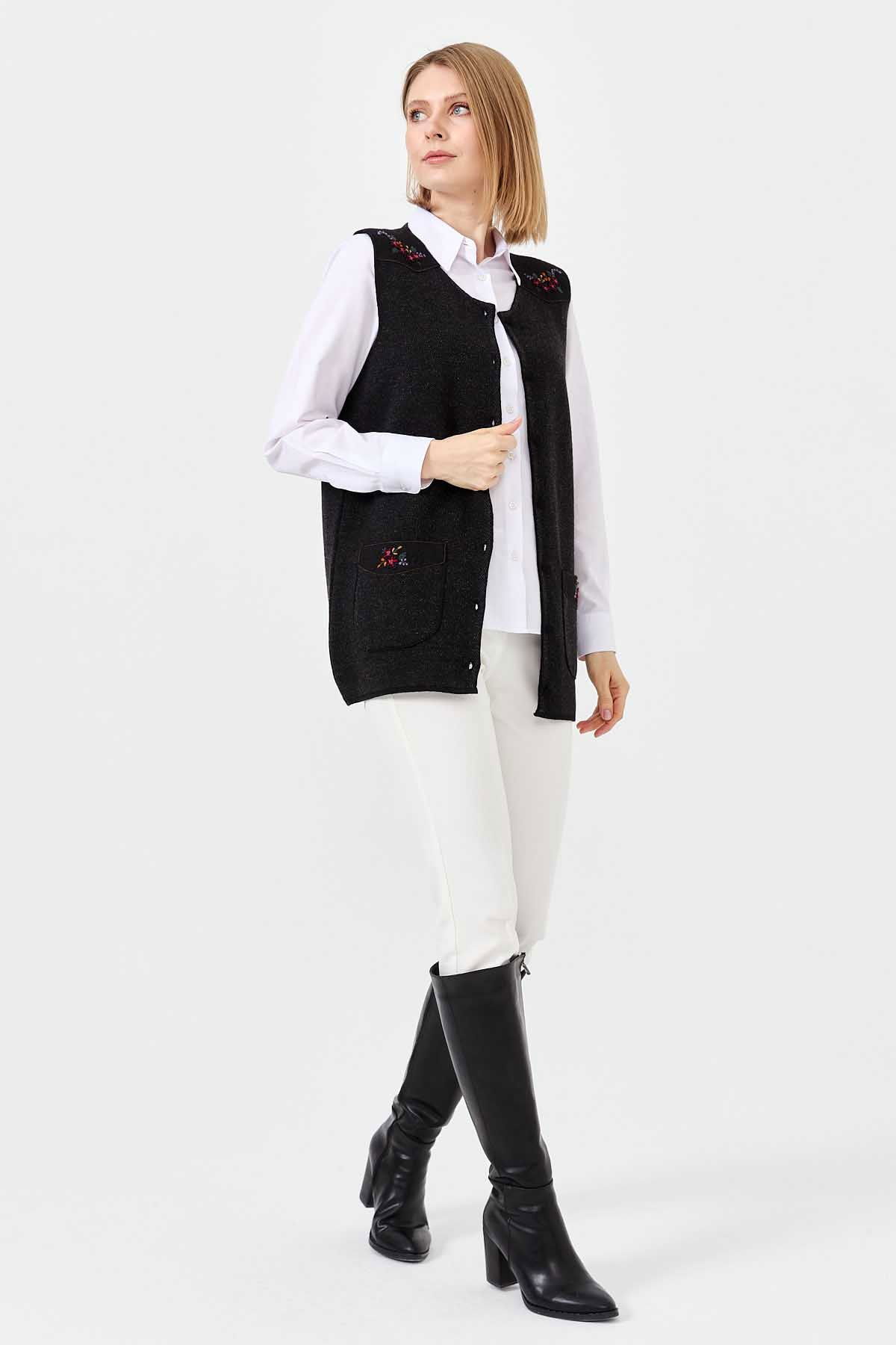Detay: Sıfır yaka, kolsuz yelek;