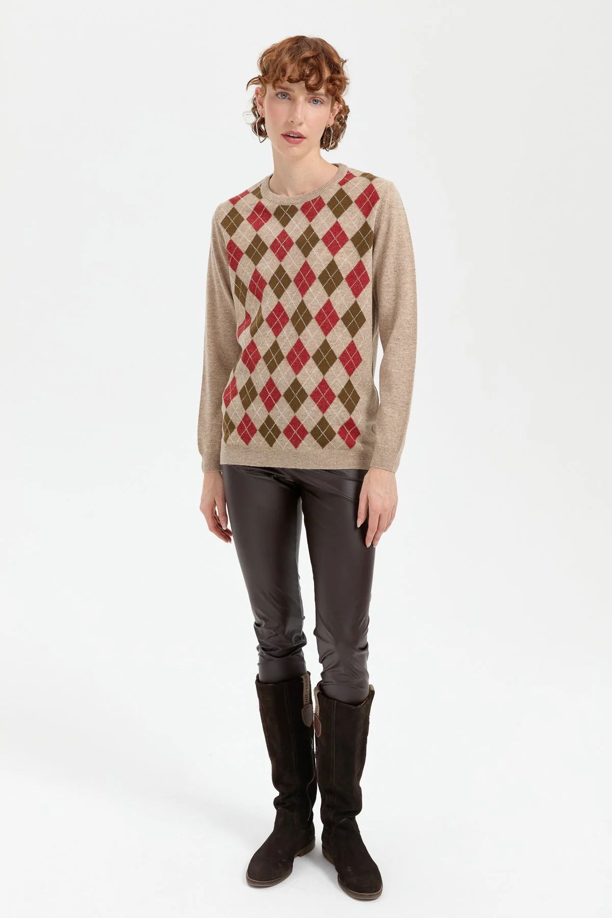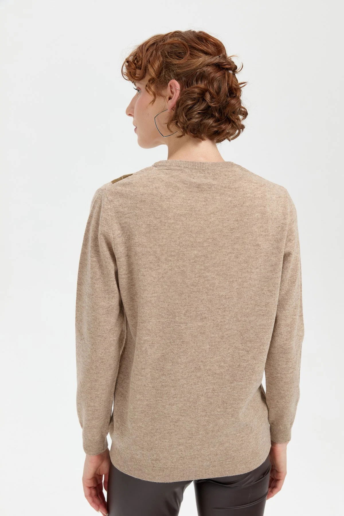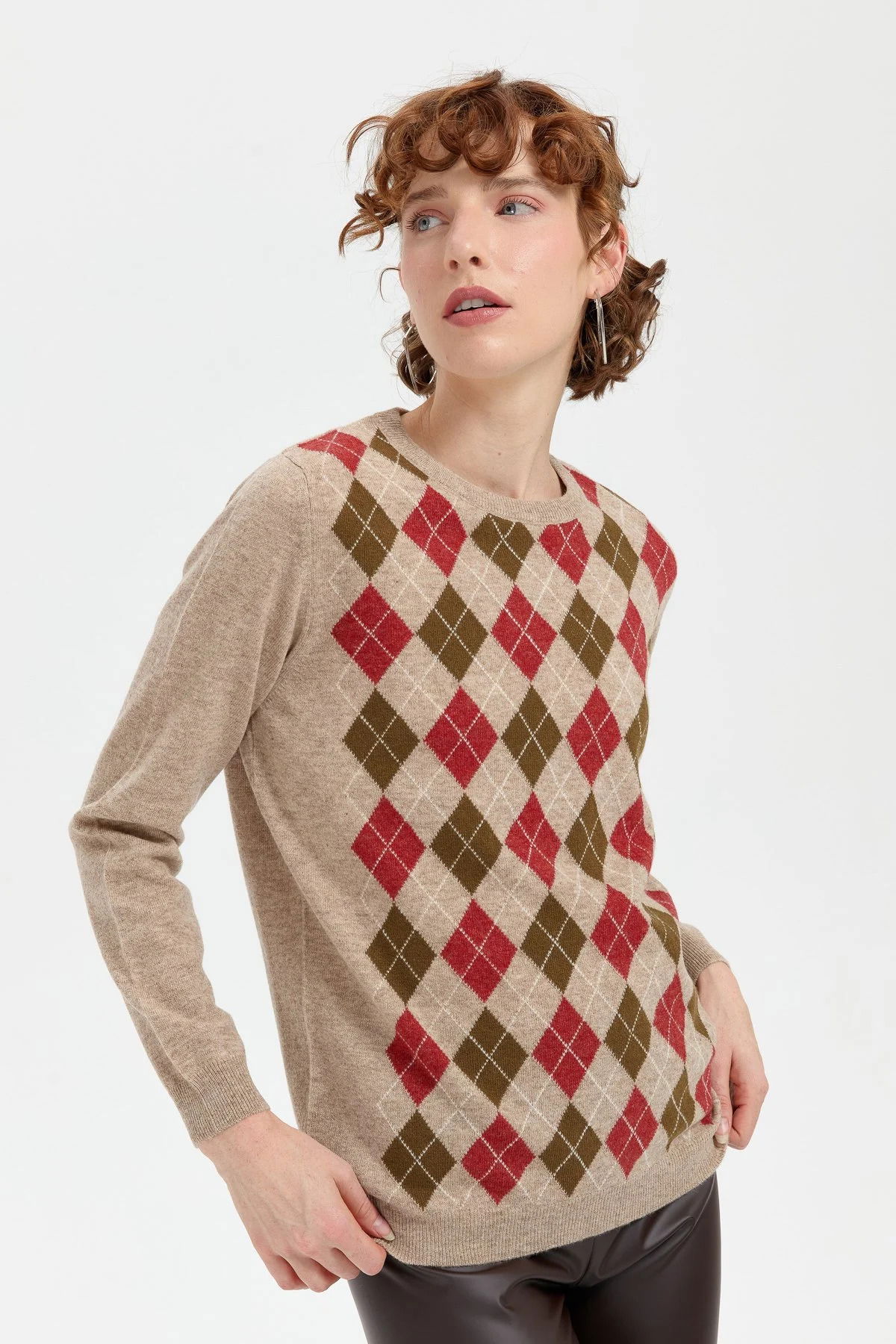 Desen Triko Kadın Sıfır Yaka Önü Baklava Desenli Yün Kazak 24035 K. Bej