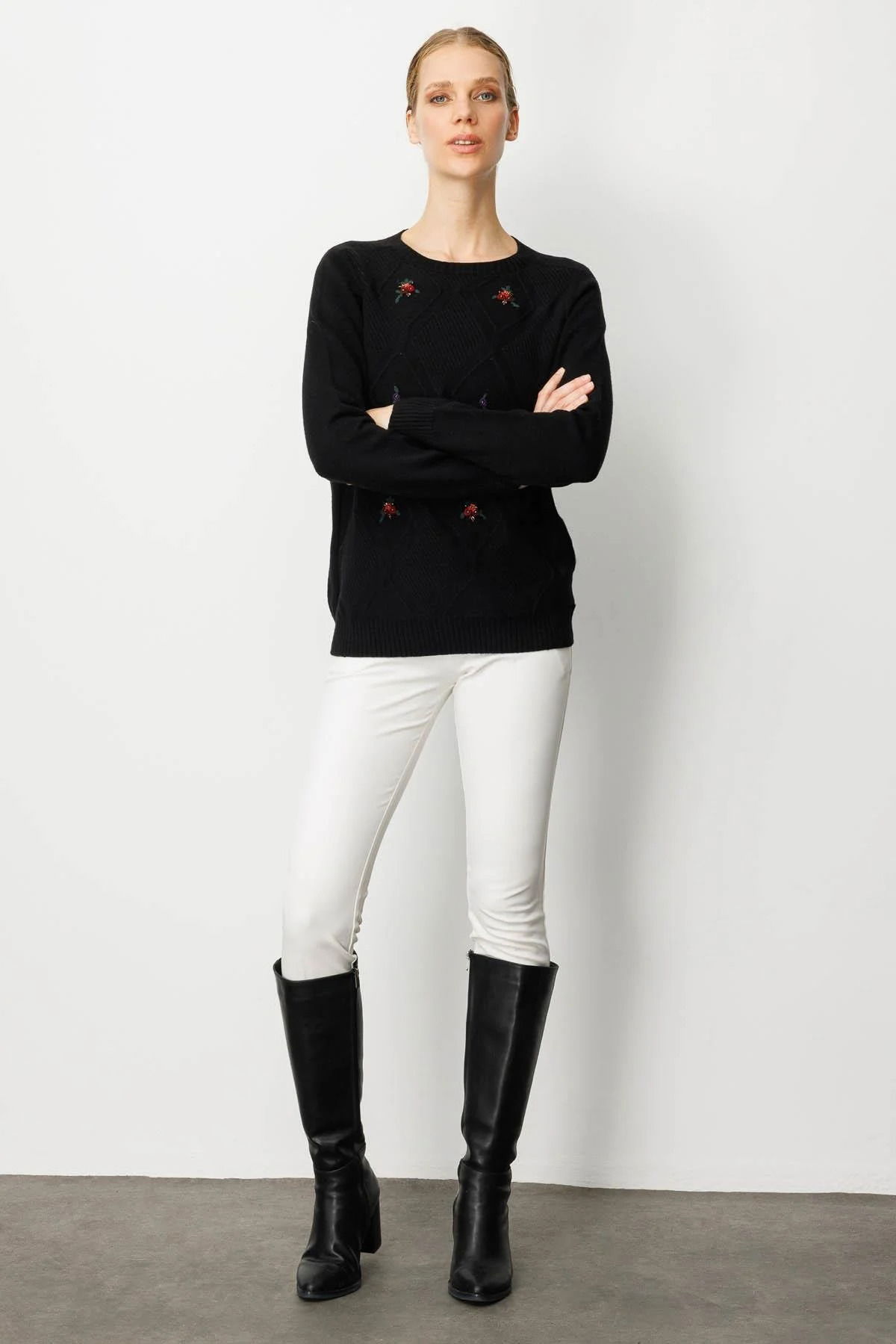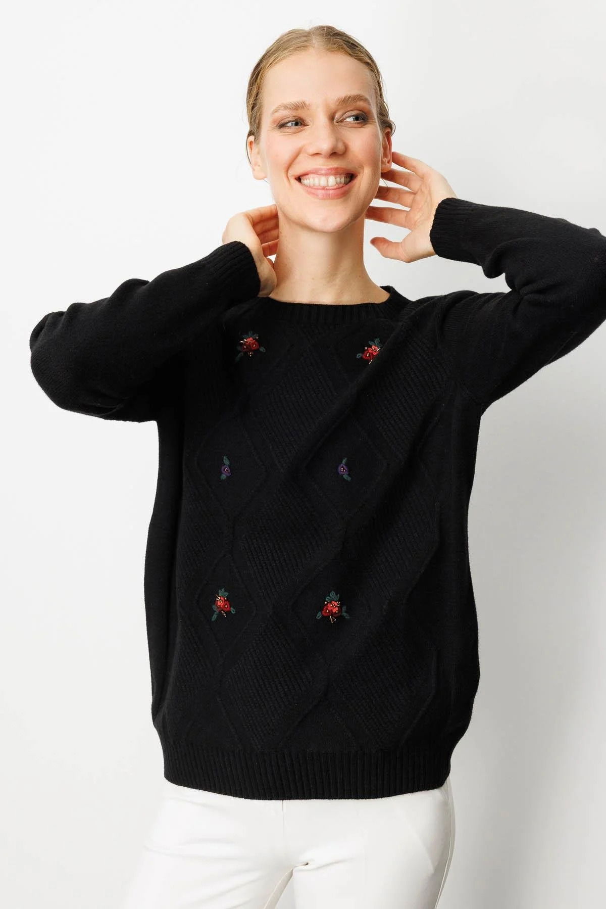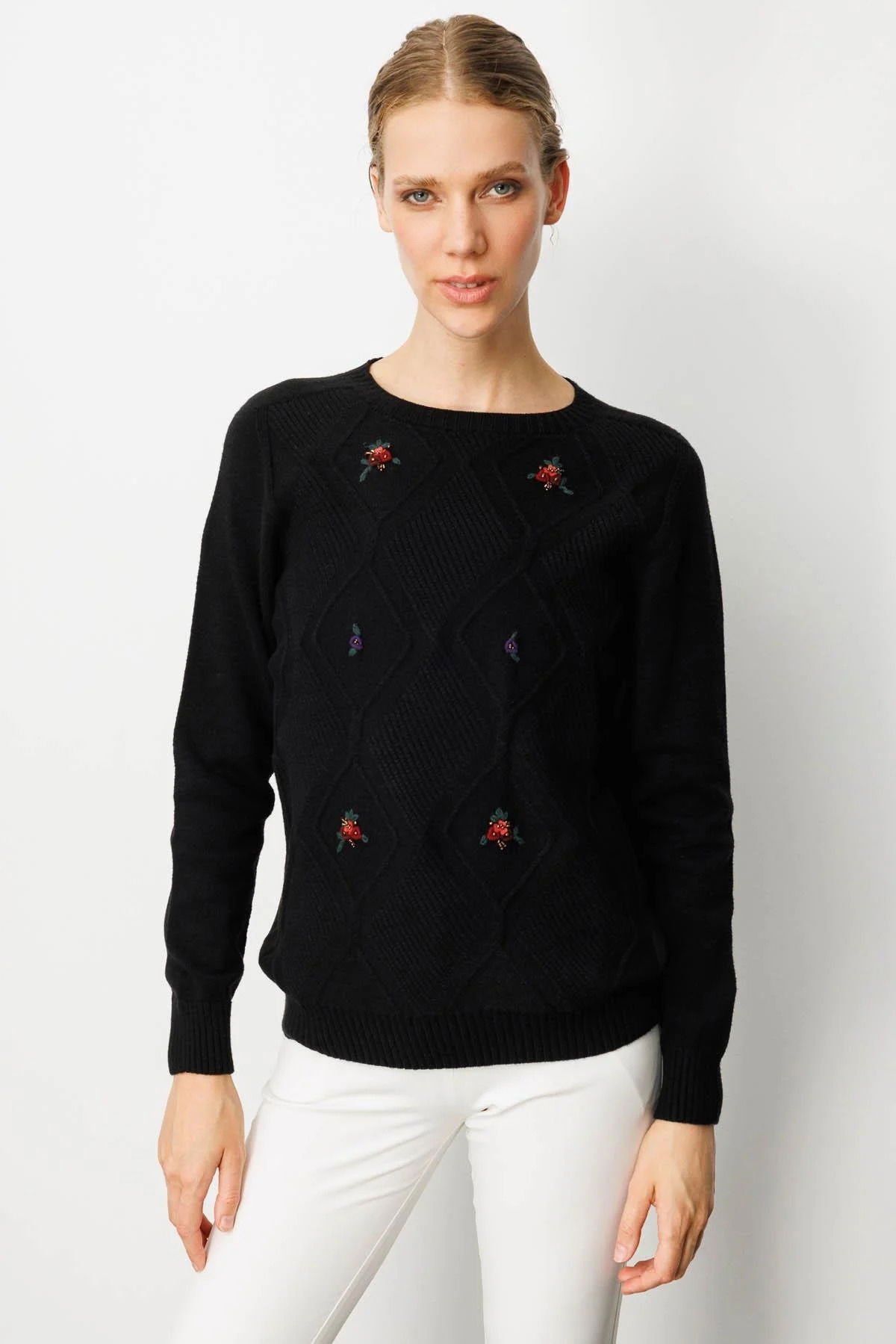 Desen Triko Kadın Sıfır Yaka Önü Baklavalı Nakış İşlemeli Kazak 25208 Siyah