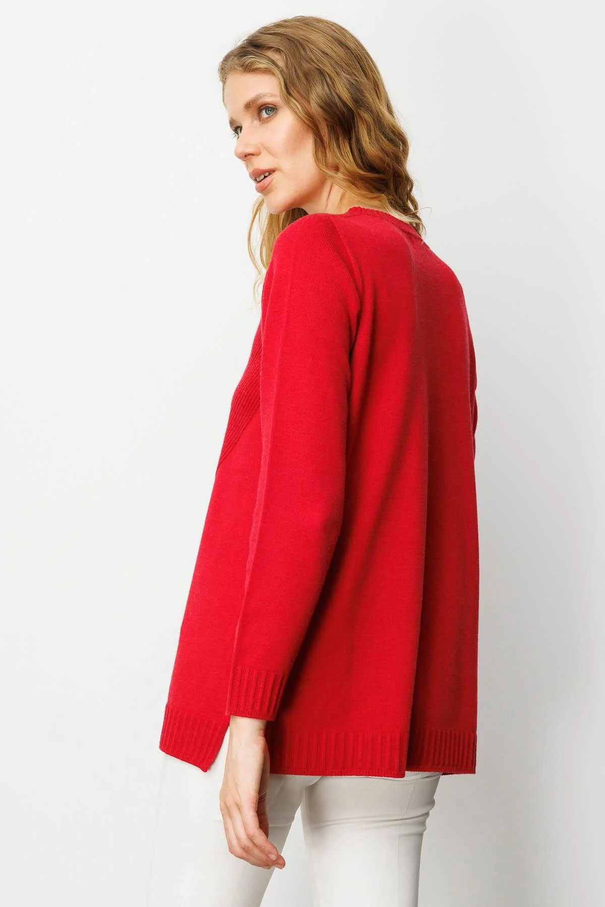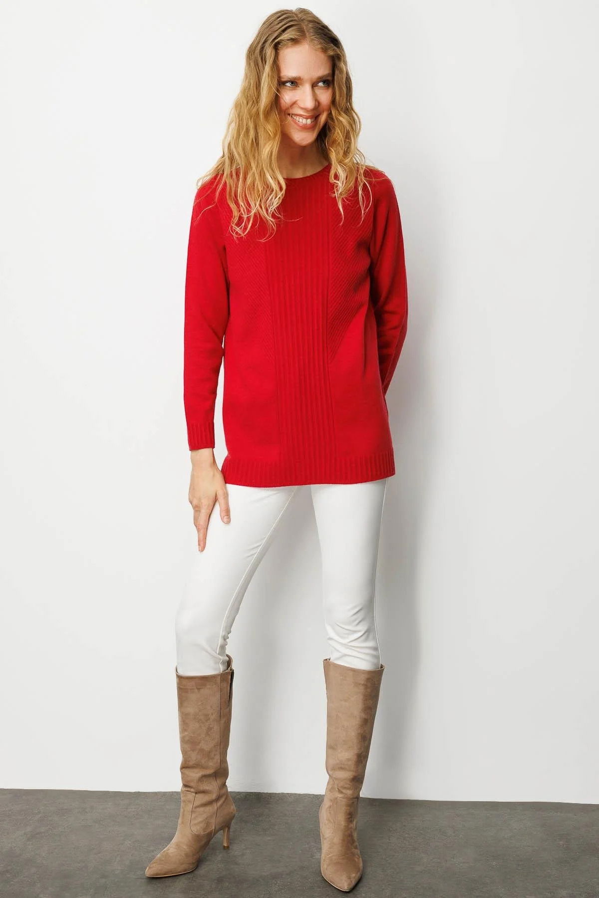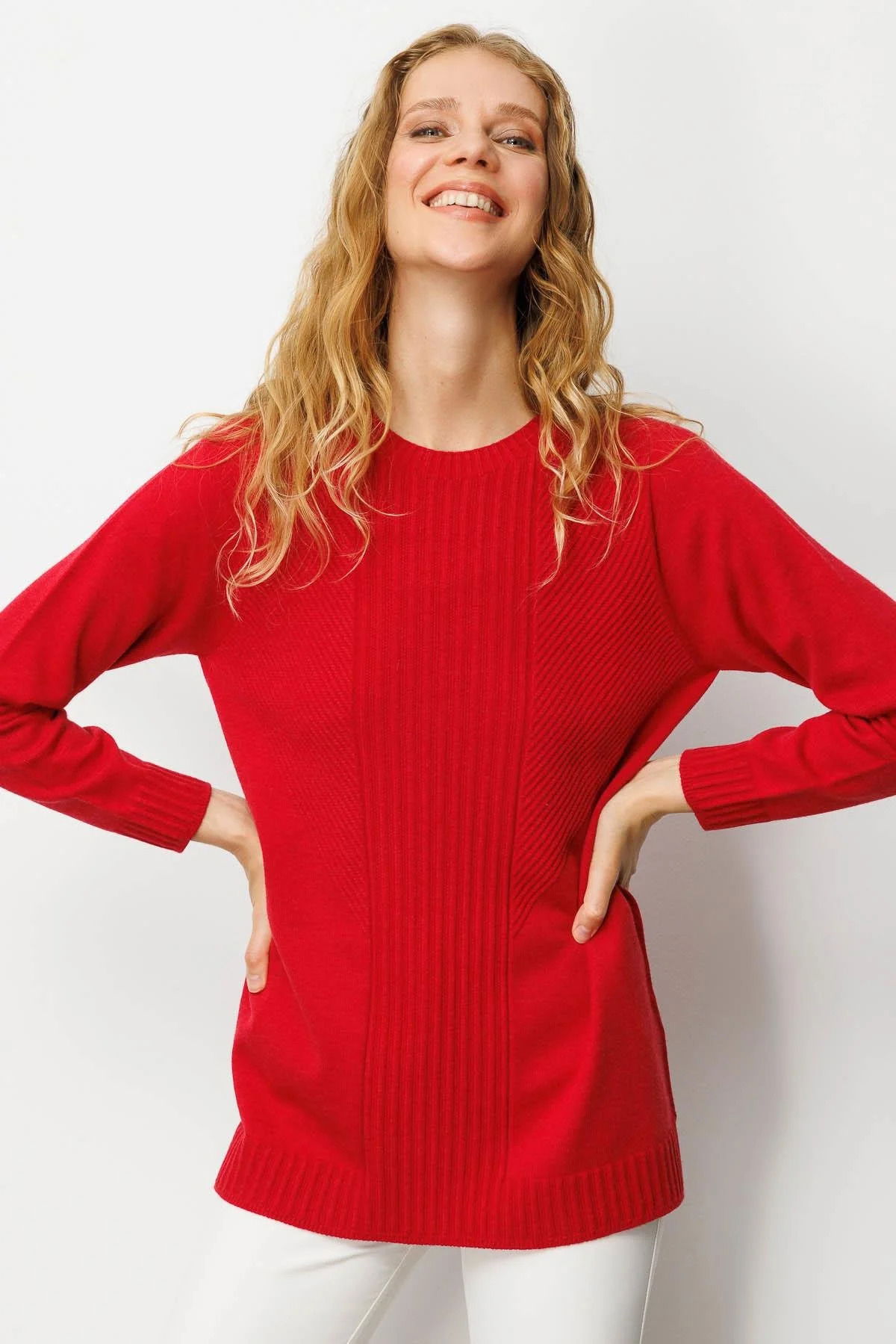 Desen Triko Kadın Sıfır Yaka Önü Çizgili Örgü Kazak 25250 K.Kırmızı