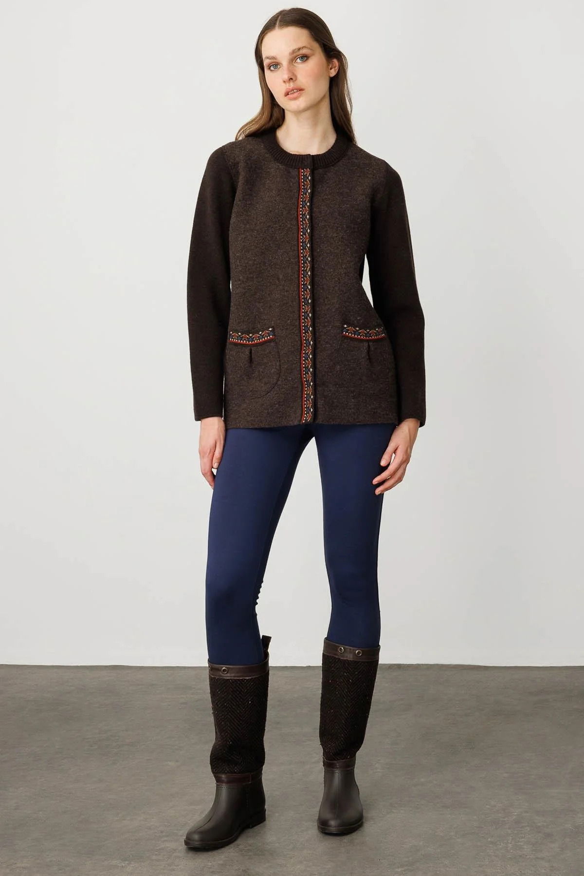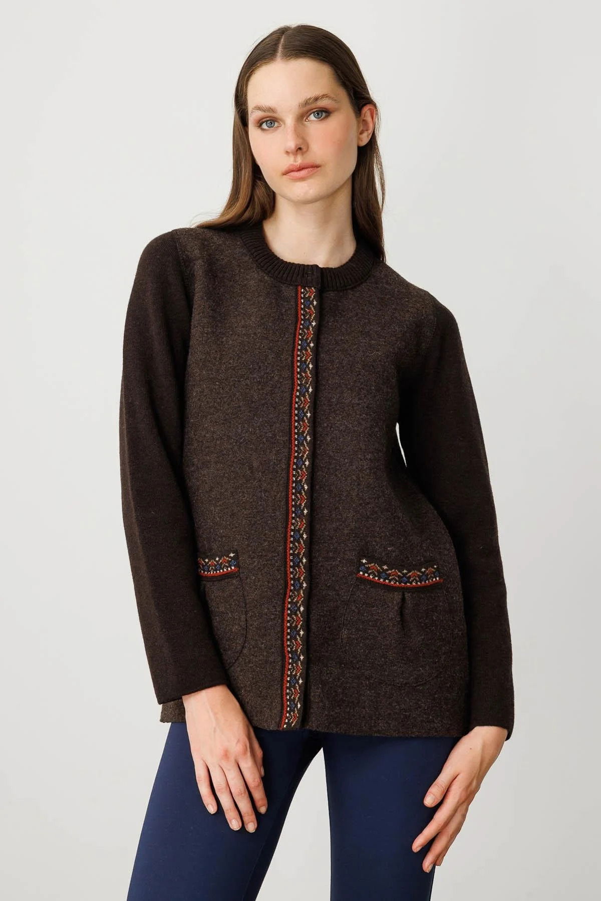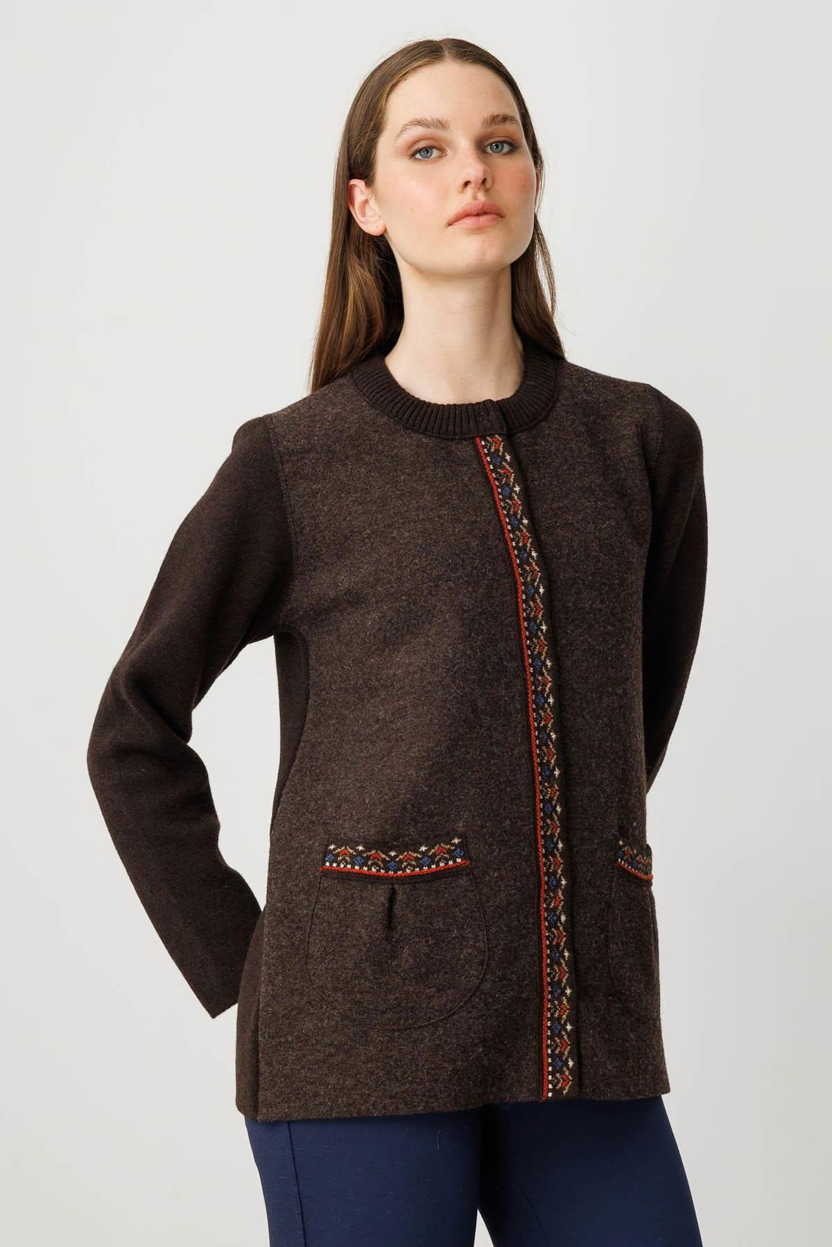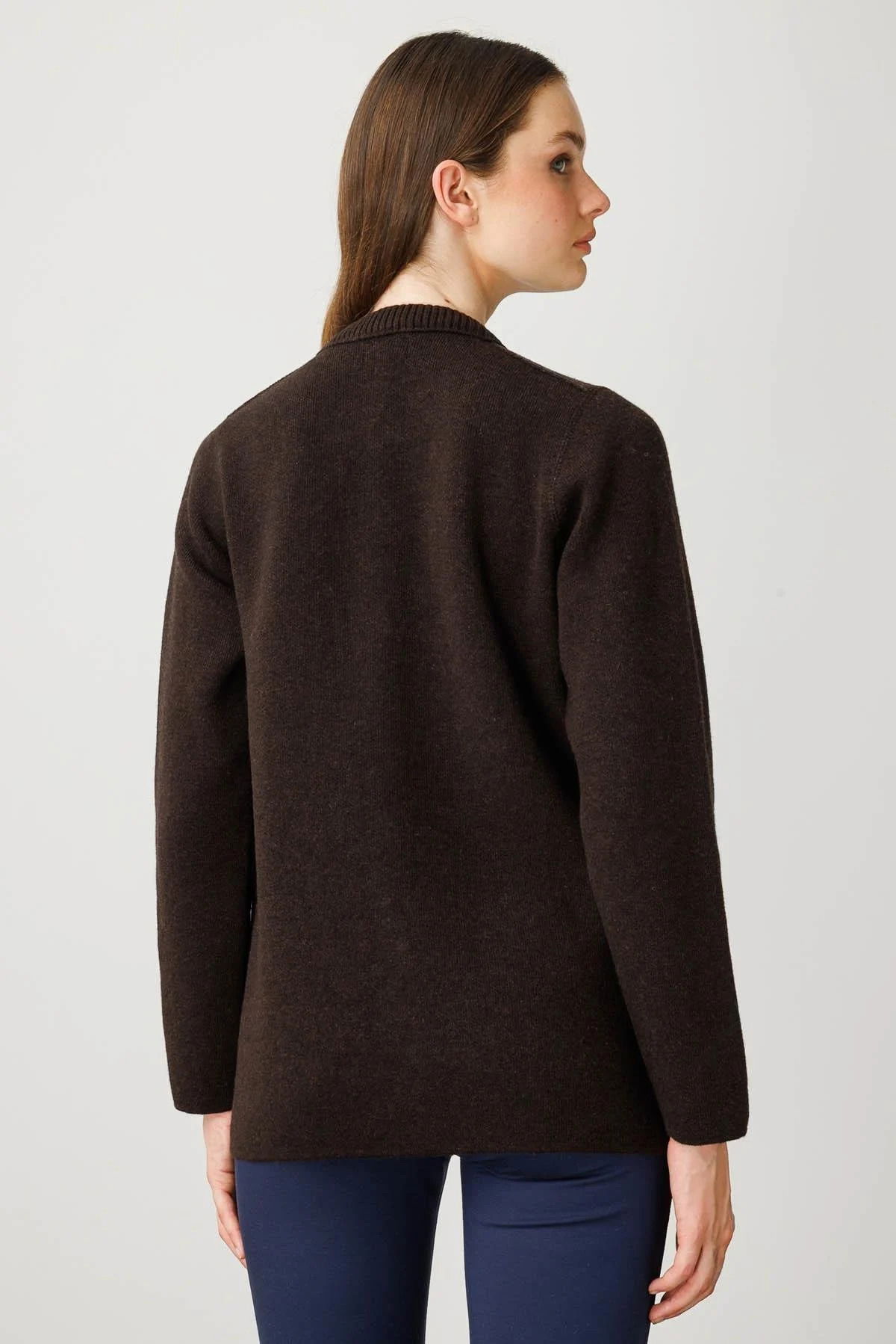 Desen Triko Kadın Sıfır Yaka Önü Keçe Kısa Yün Ceket 25018 Koyu Kahve