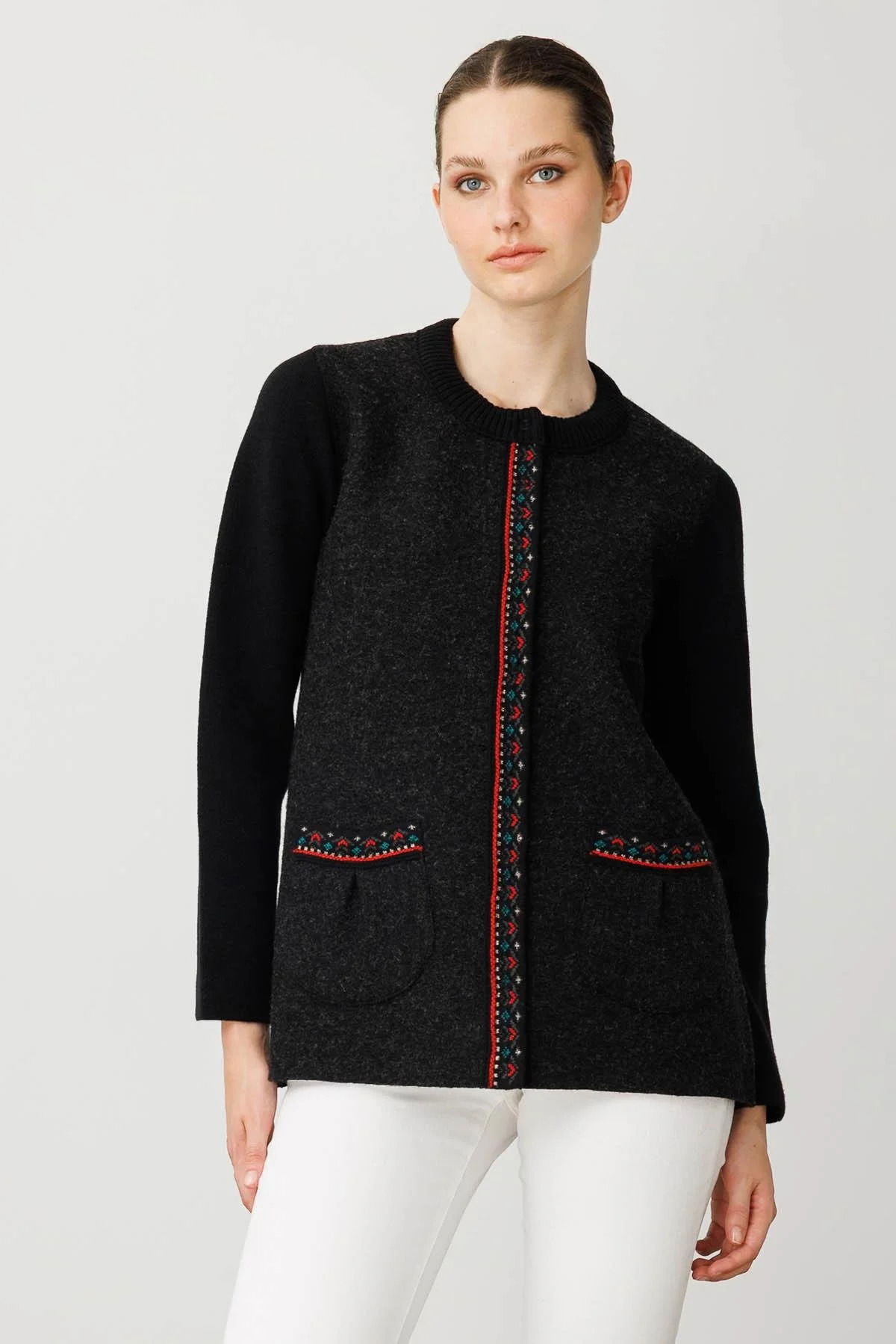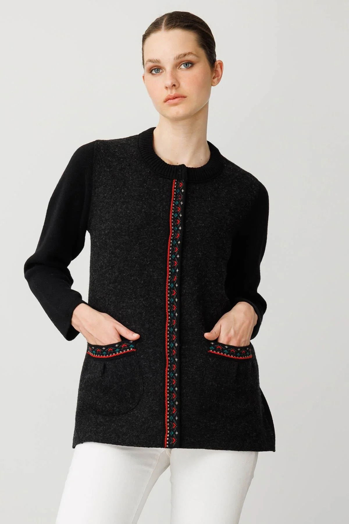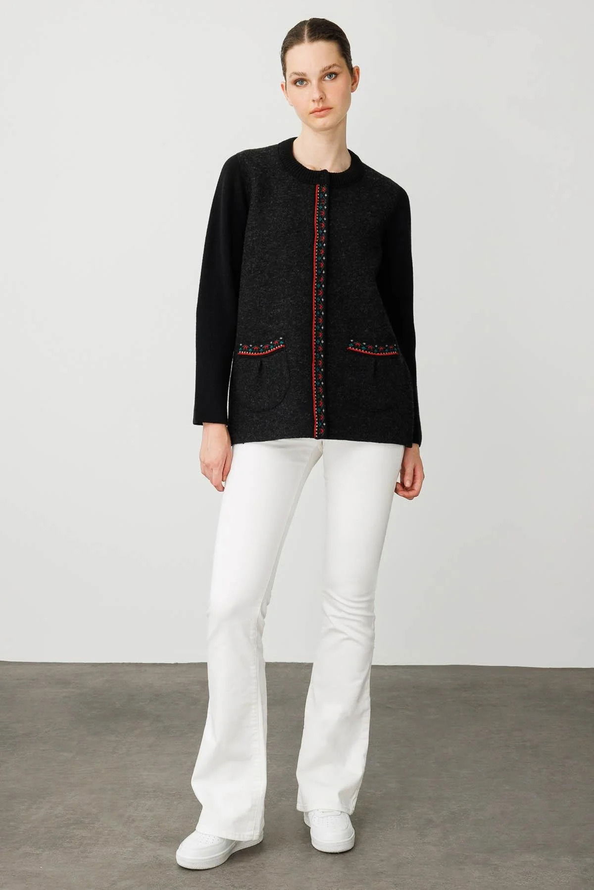 Desen Triko Kadın Sıfır Yaka Önü Keçe Kısa Yün Ceket 25018 Siyah