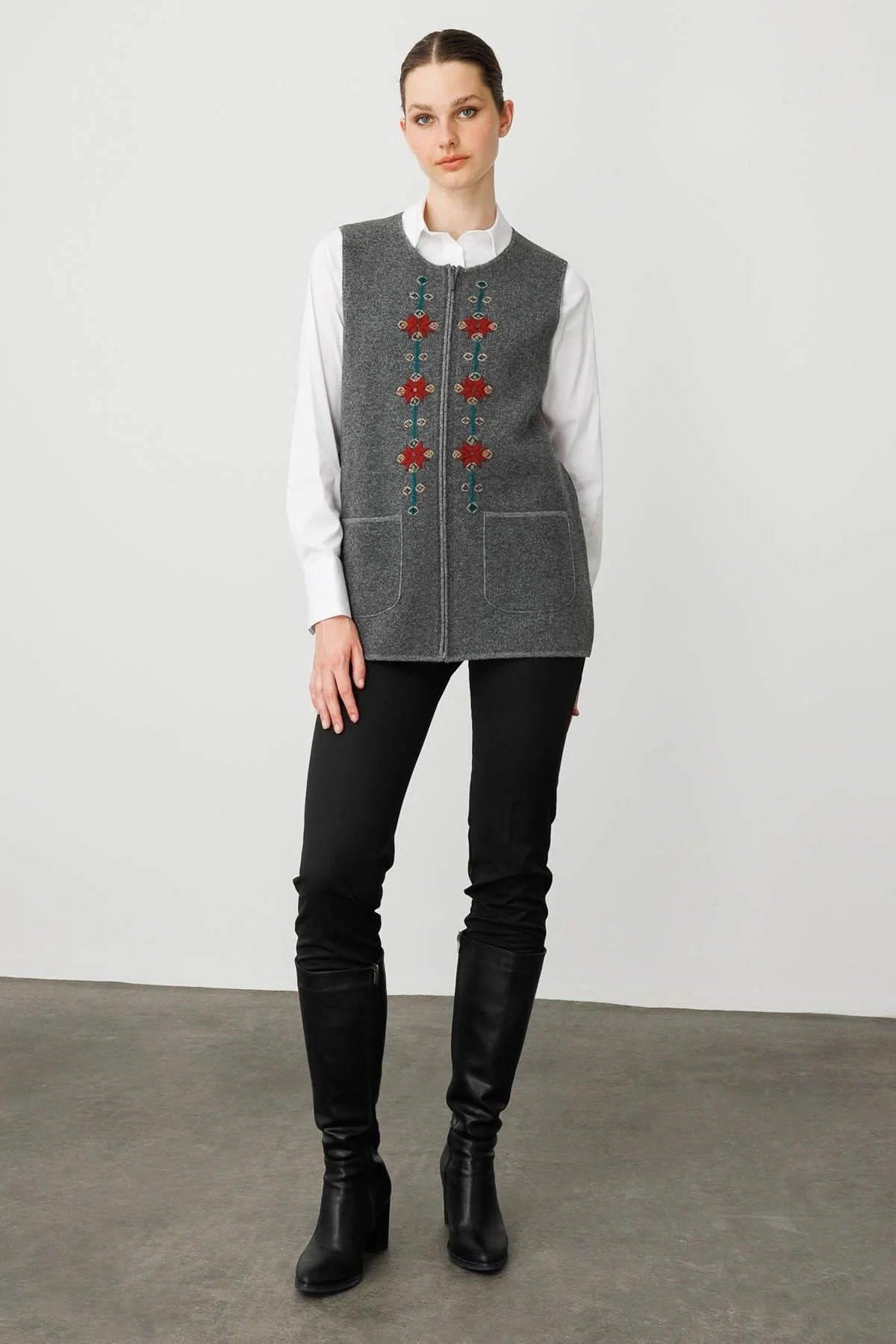Desen Triko Kadın Sıfır Yaka Önü Nakış İşlemeli Yün Yelek 25001 Füme