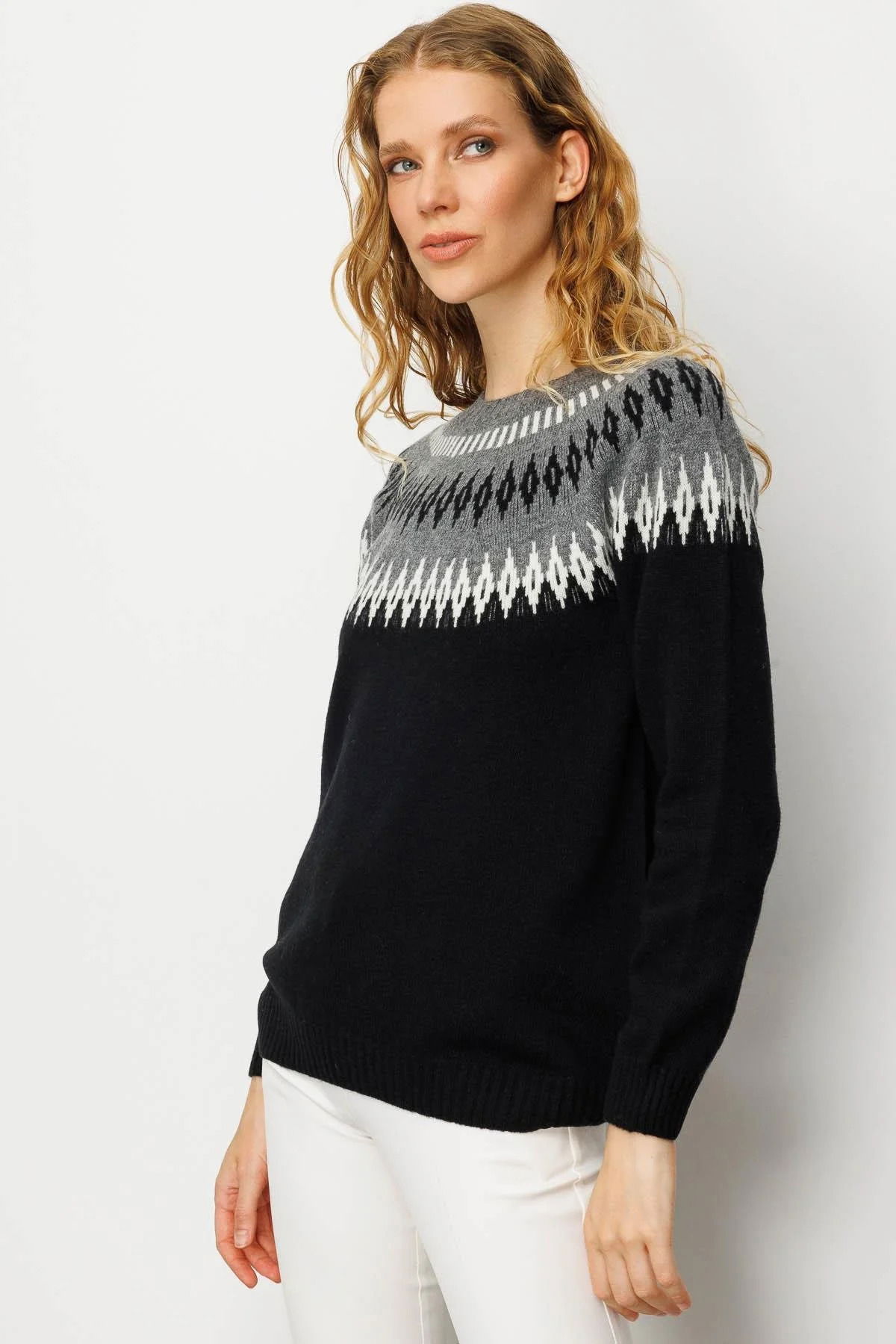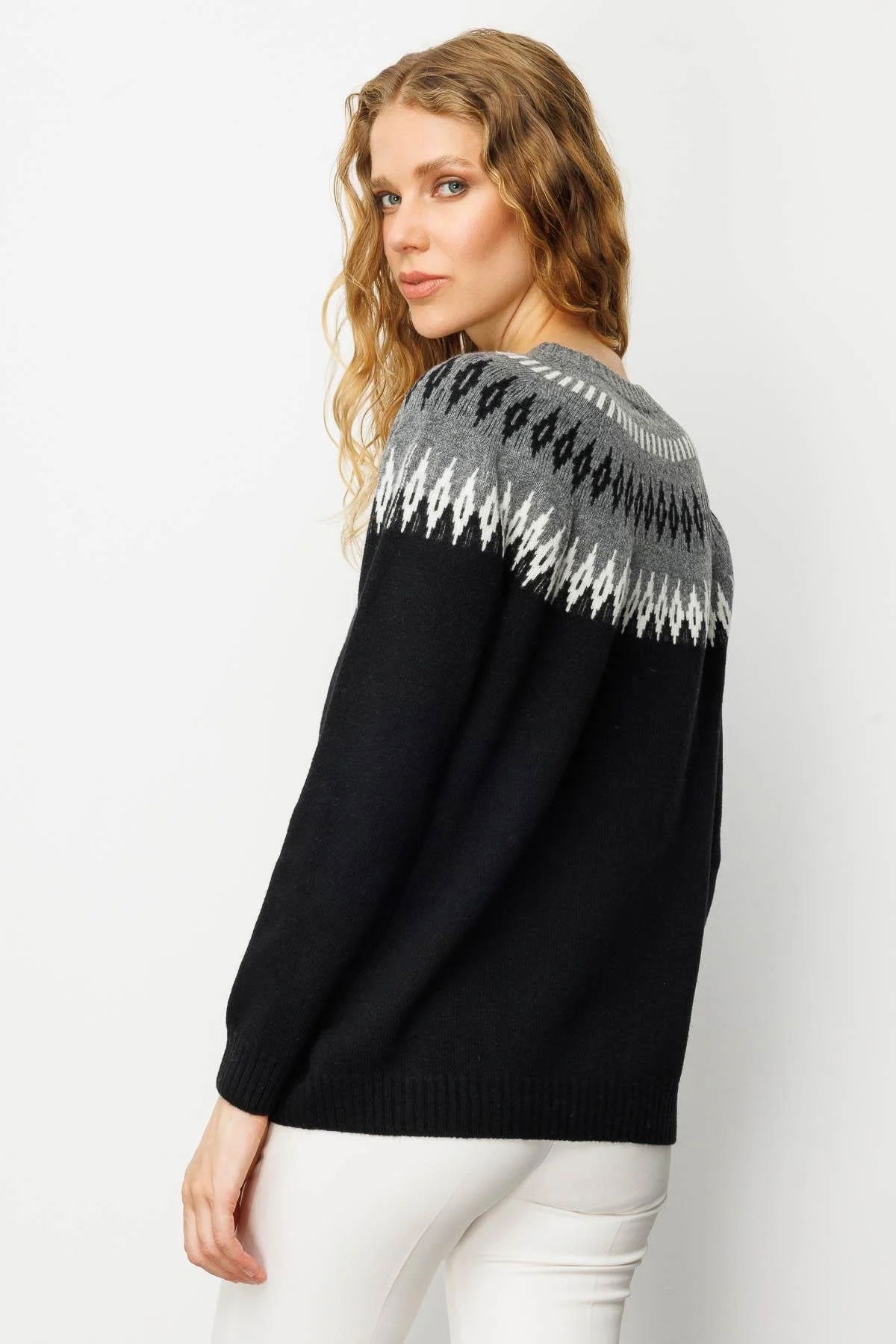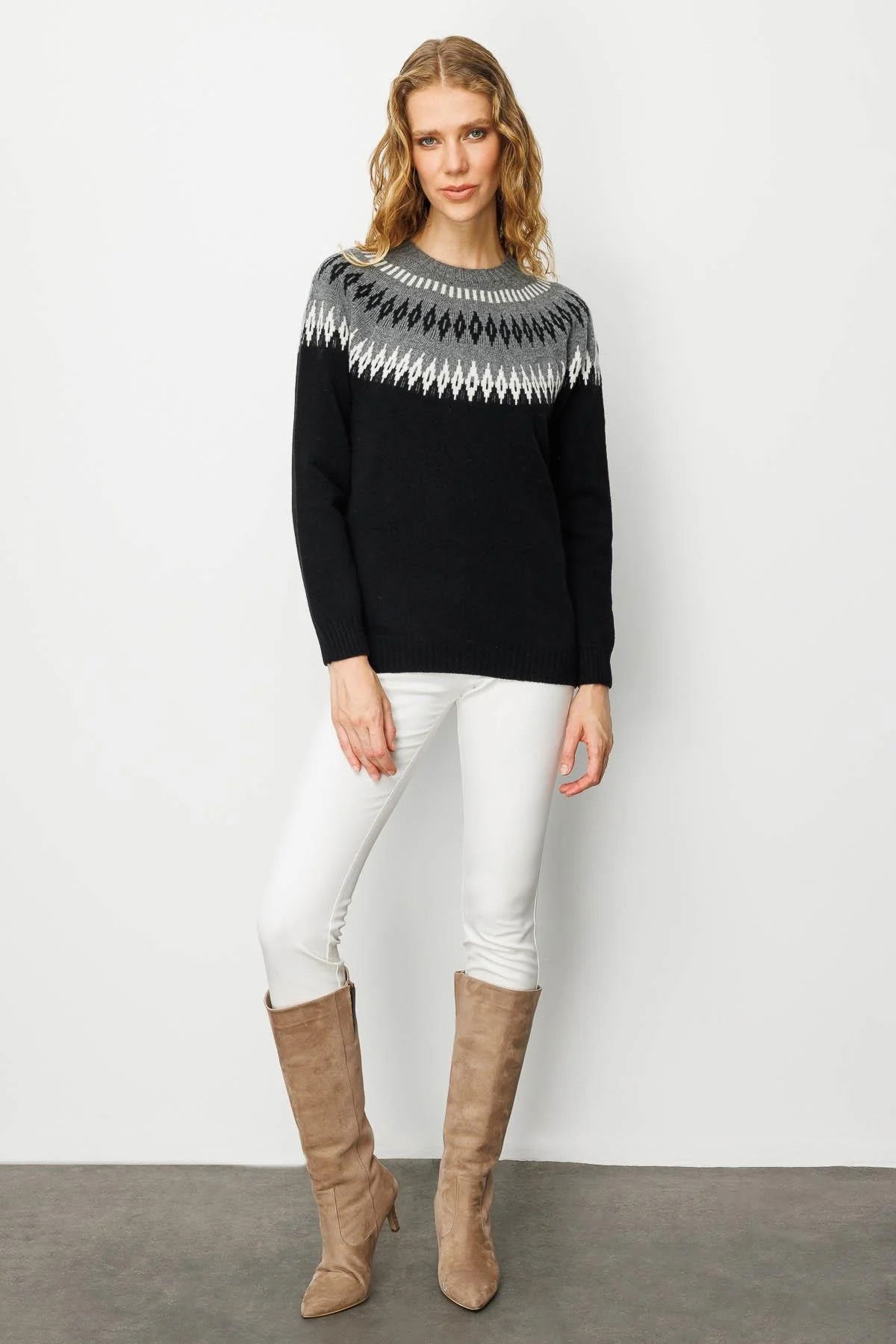 Desen Triko Kadın Sıfır Yaka Robası Baklavalı Yün Kazak 25218 Siyah
