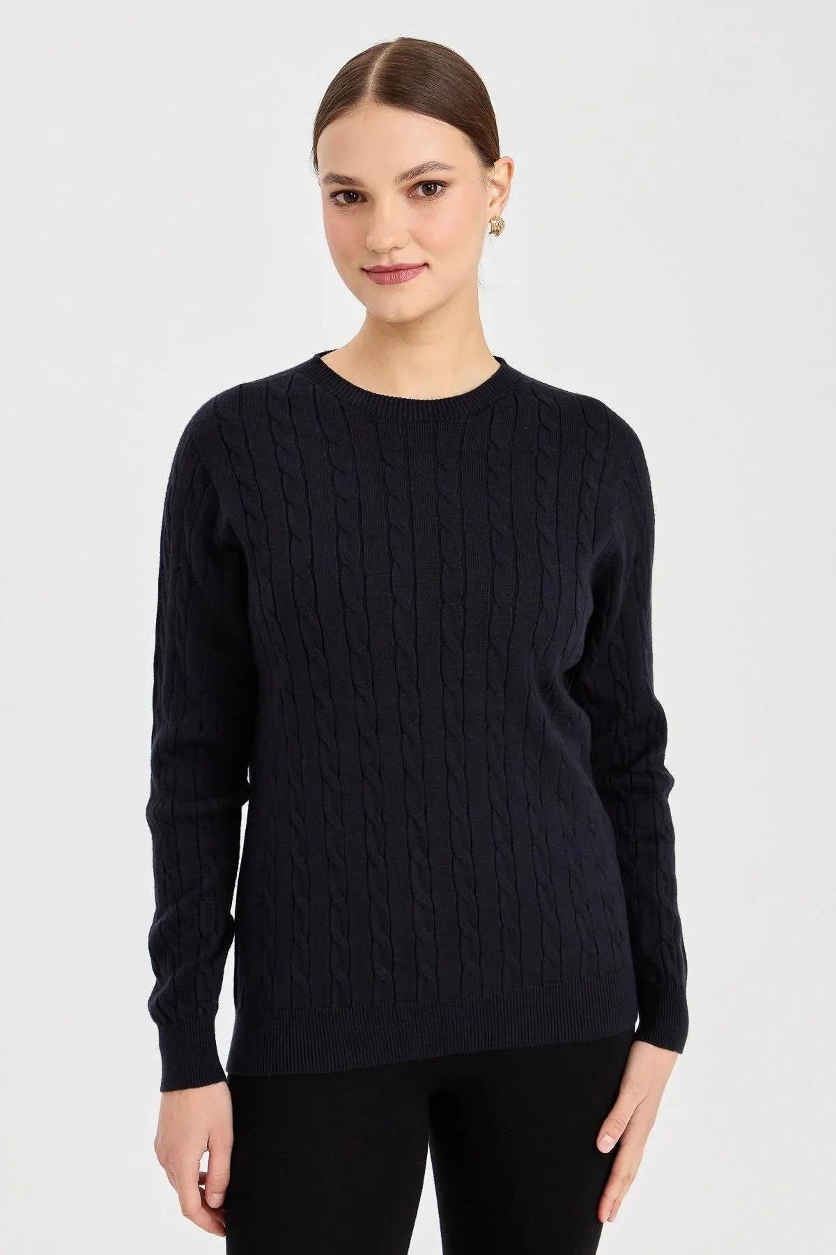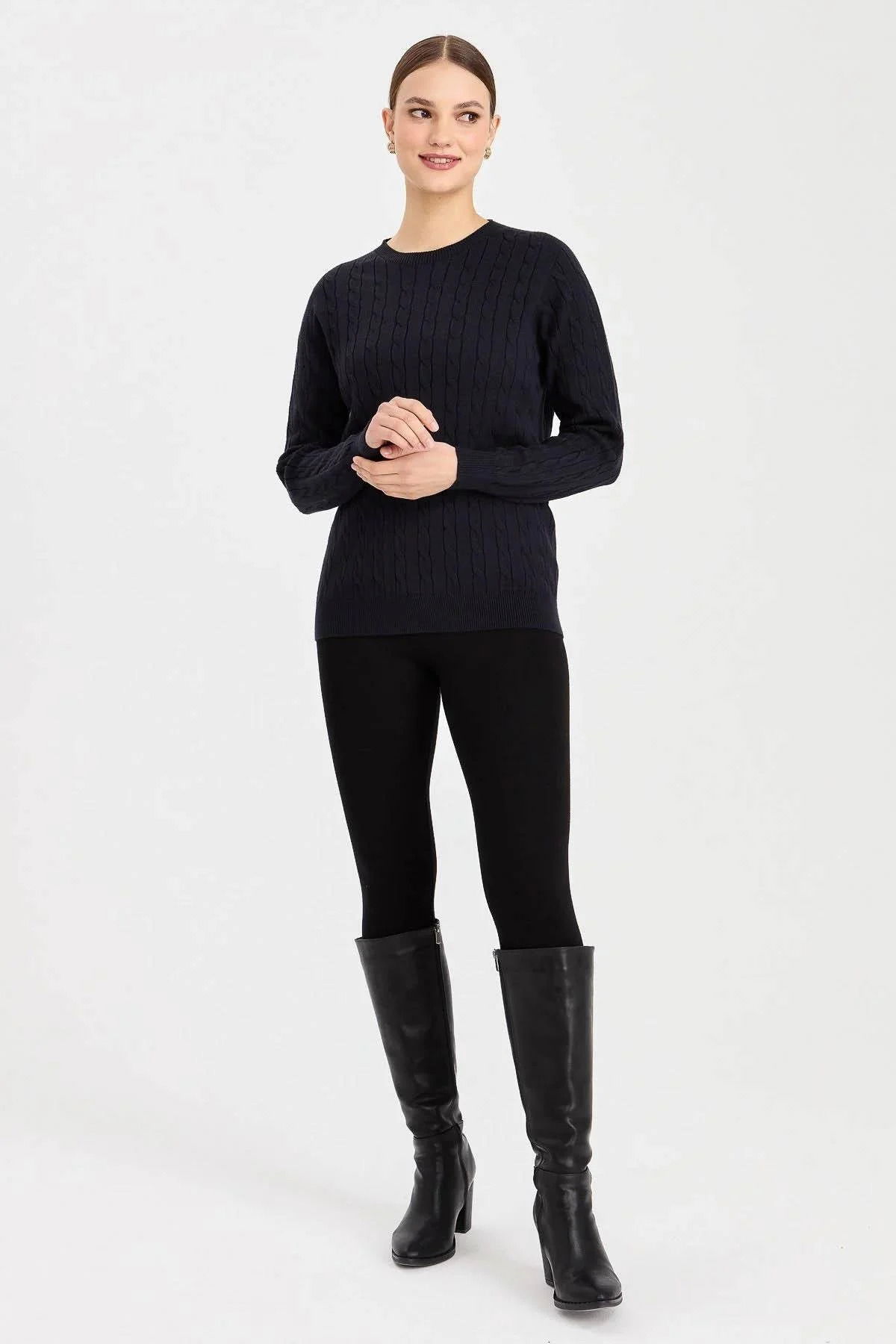Desen Triko Kadın Sıfır Yaka Saç Örgülü Kazak 3329 Koyu Lacivert