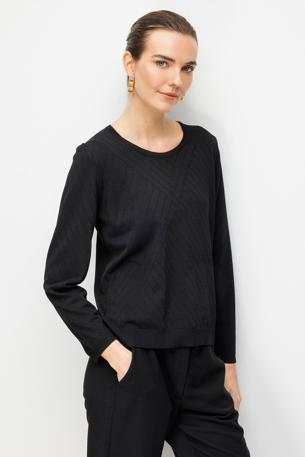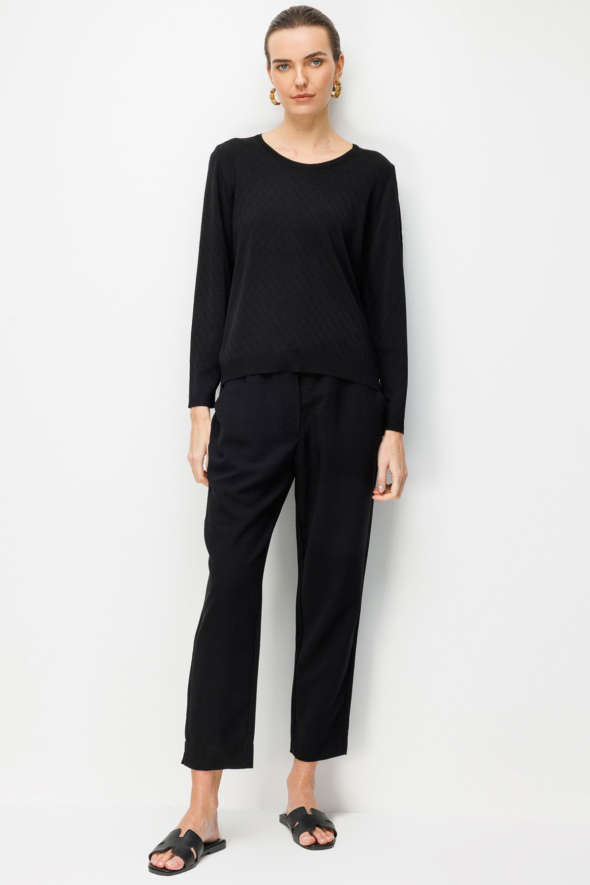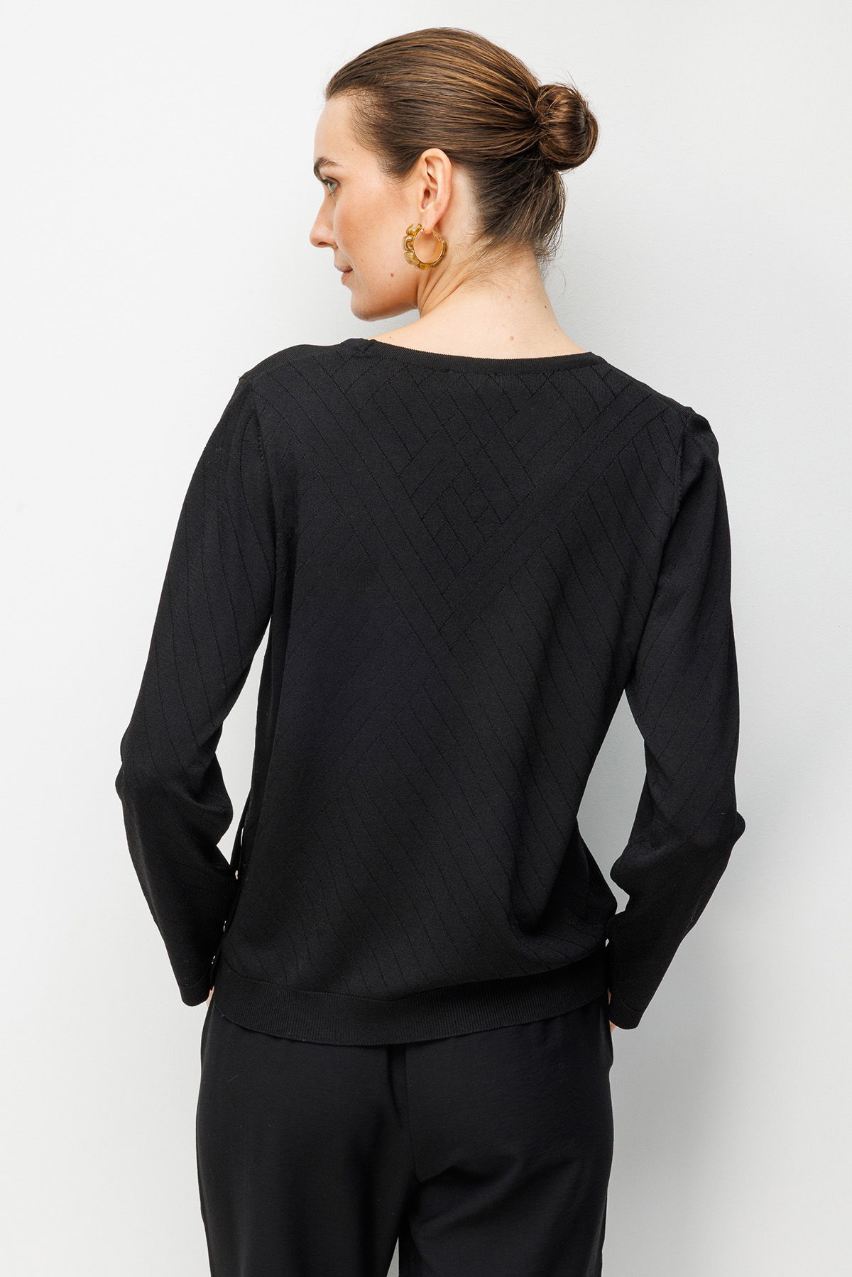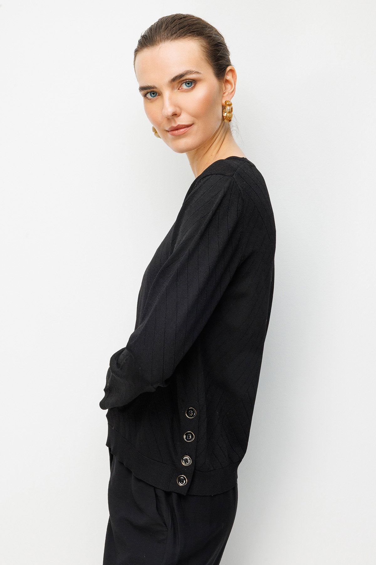 Desen Triko Kadın Sıfır Yaka Verev Çizgili Yanı Düğmeli Uzun Kollu İnce Triko Bluz 26372 Siyah