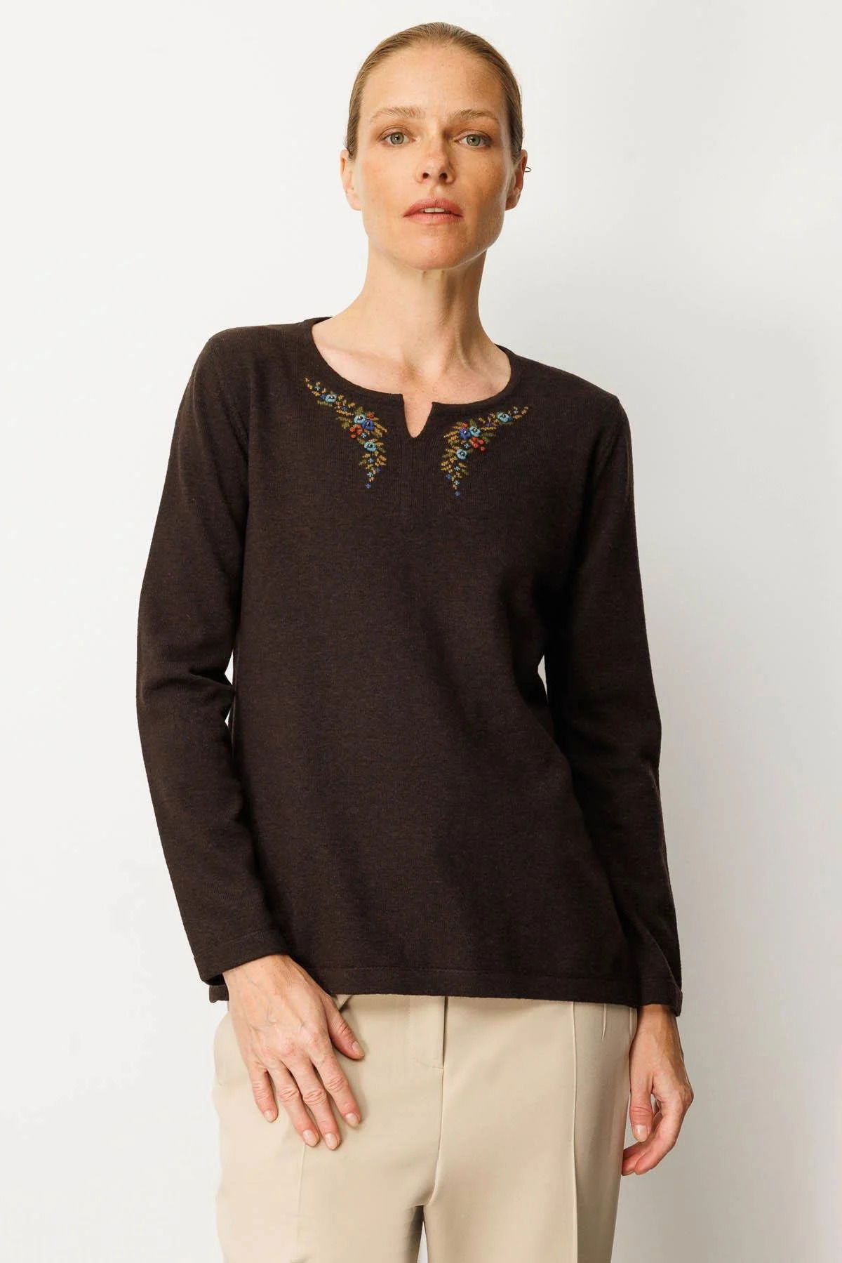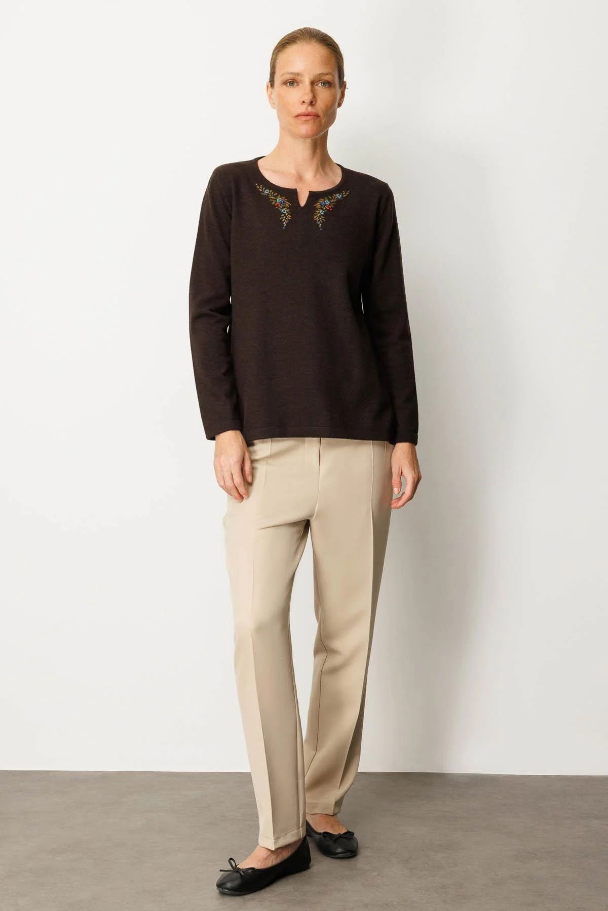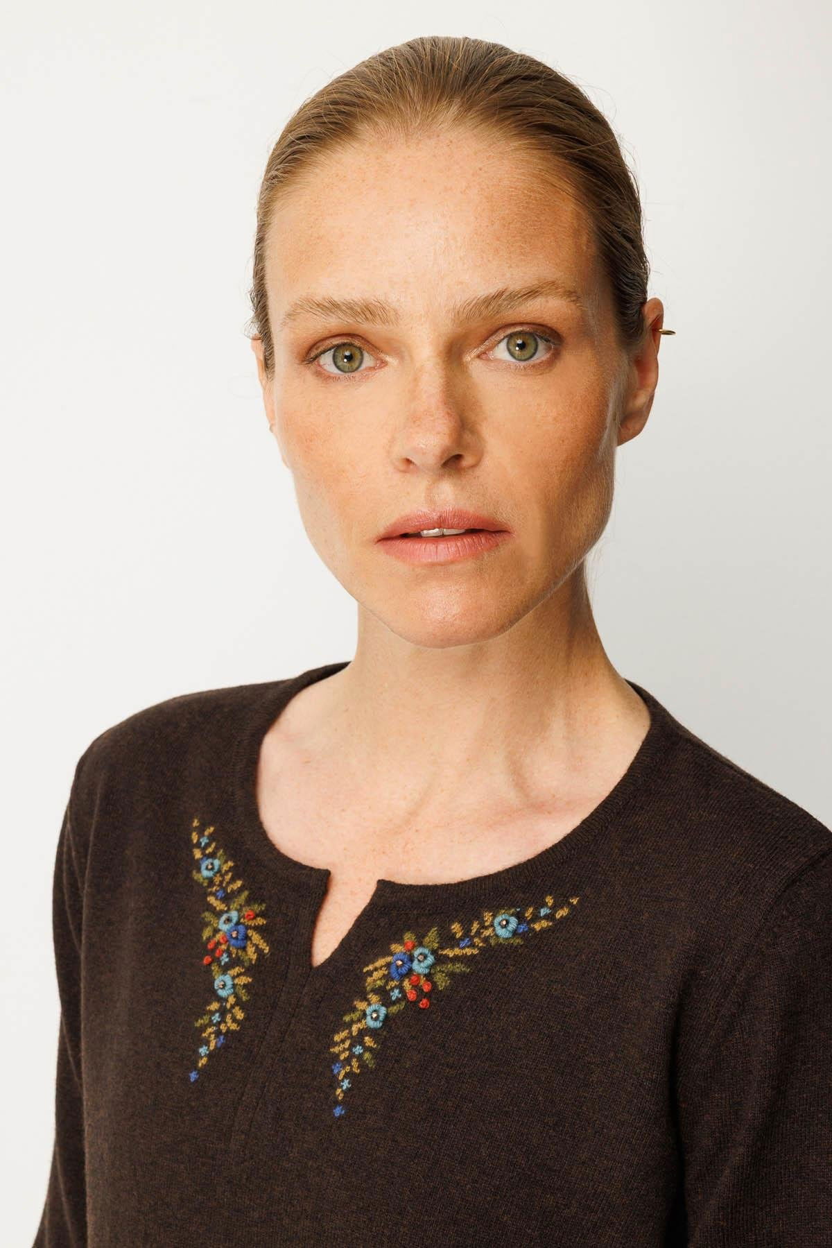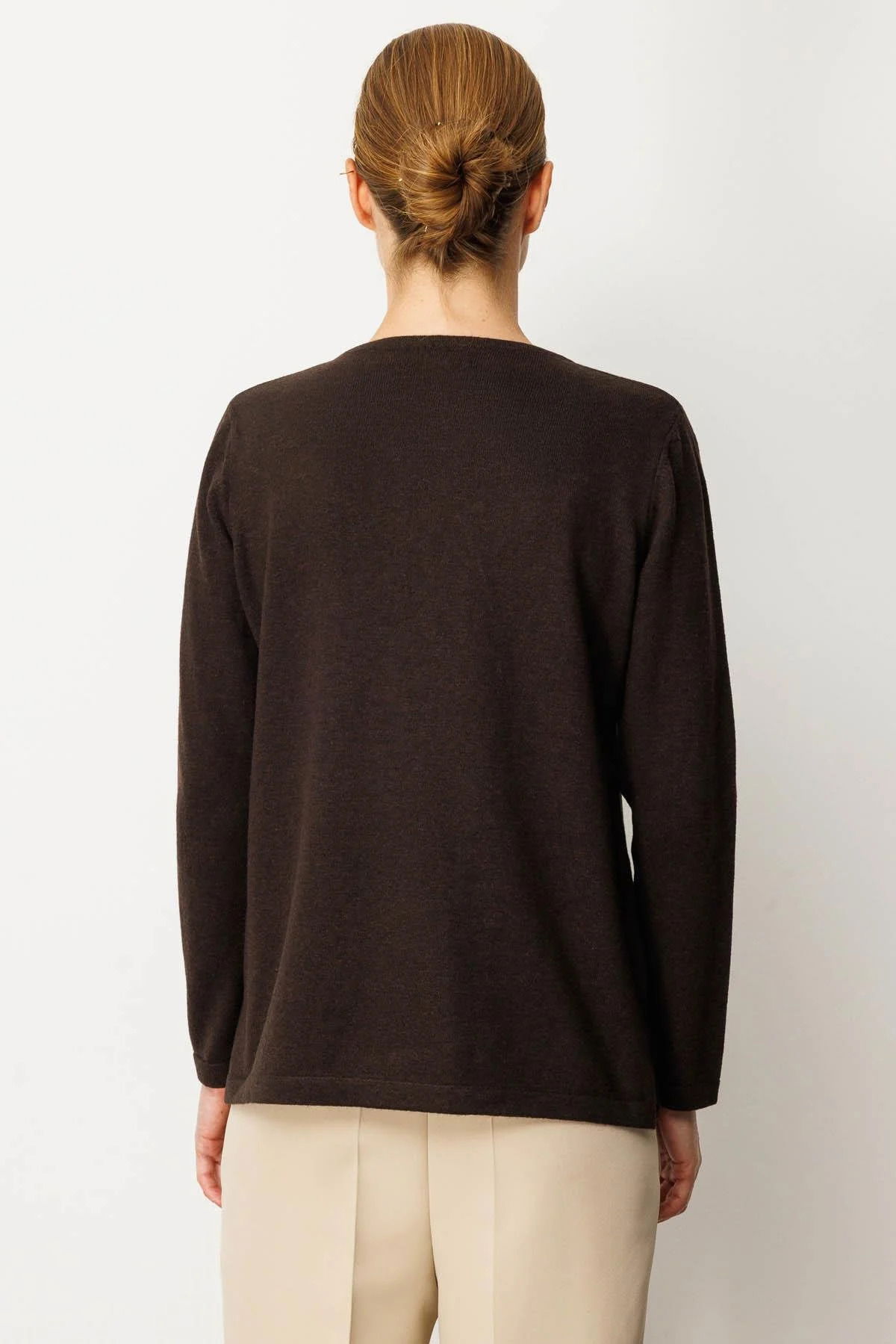 Desen Triko Kadın Sıfır Yaka Yaka Kenarı İşlemeli Yün Bluz 25036 Koyu Kahve
