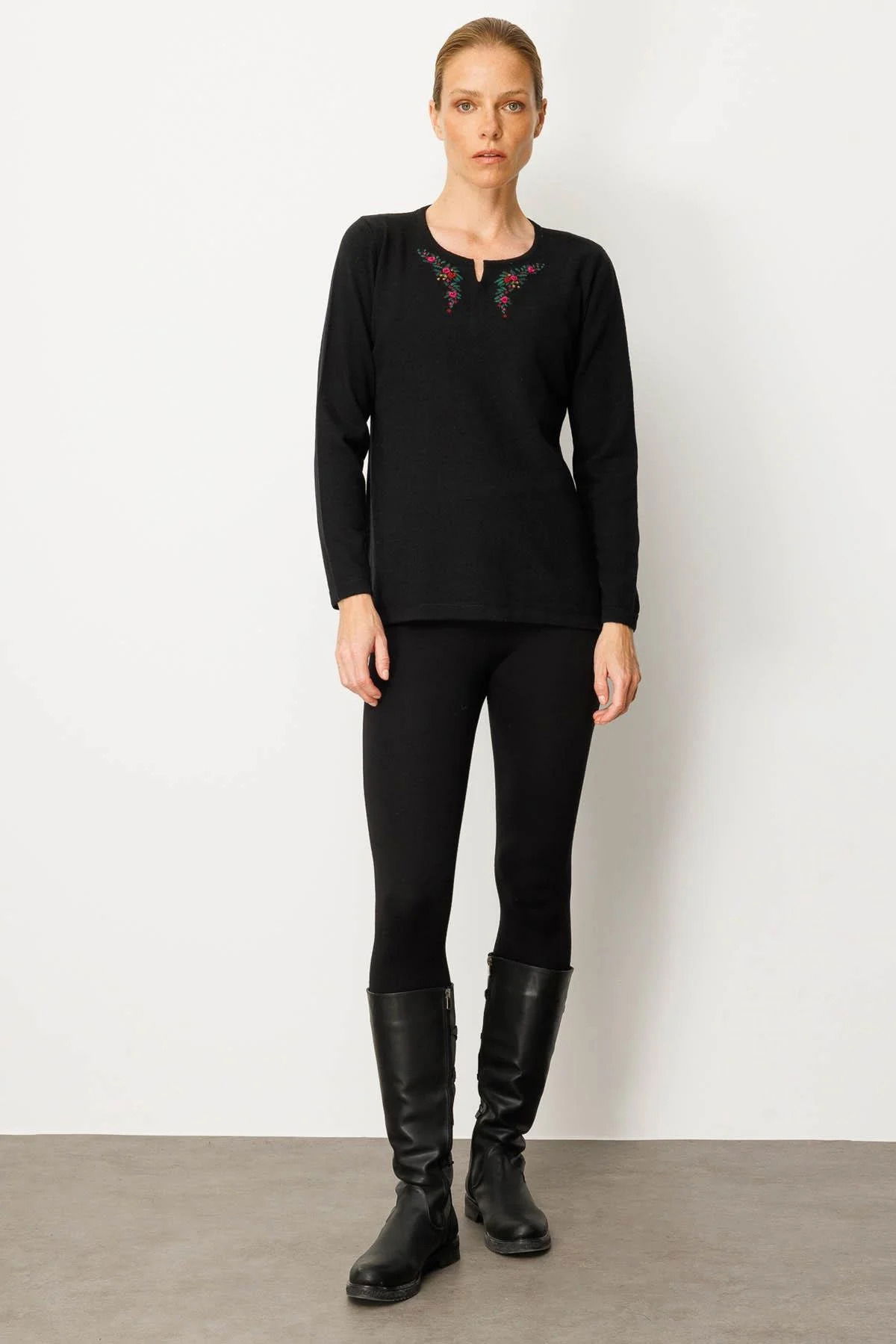 Desen Triko Kadın Sıfır Yaka Yaka Kenarı İşlemeli Yün Bluz 25036 Siyah